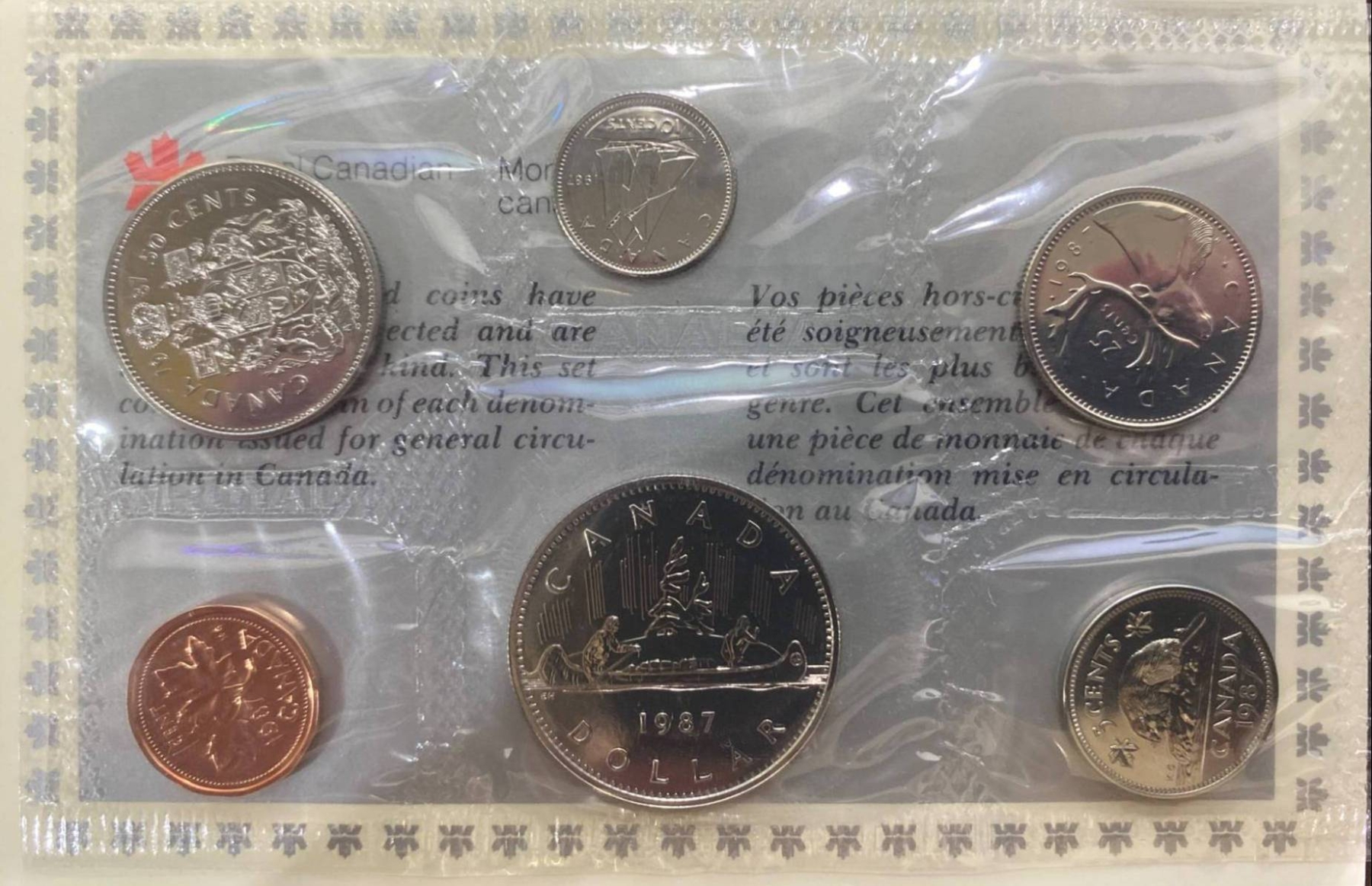 1987 Royal Canadian Mint uncirculated coin set featuring seven coins from the Canadian currency system, including a dollar, 50 cents, 25 cents, 10 cents, 5 cents, and 1 cent. Each coin is sealed in its original mint packaging and accompanied by an informational card. Packaging measures approximately 6.7 x 4 inches. A great collectible or gift for enthusiasts of Canadian numismatics.