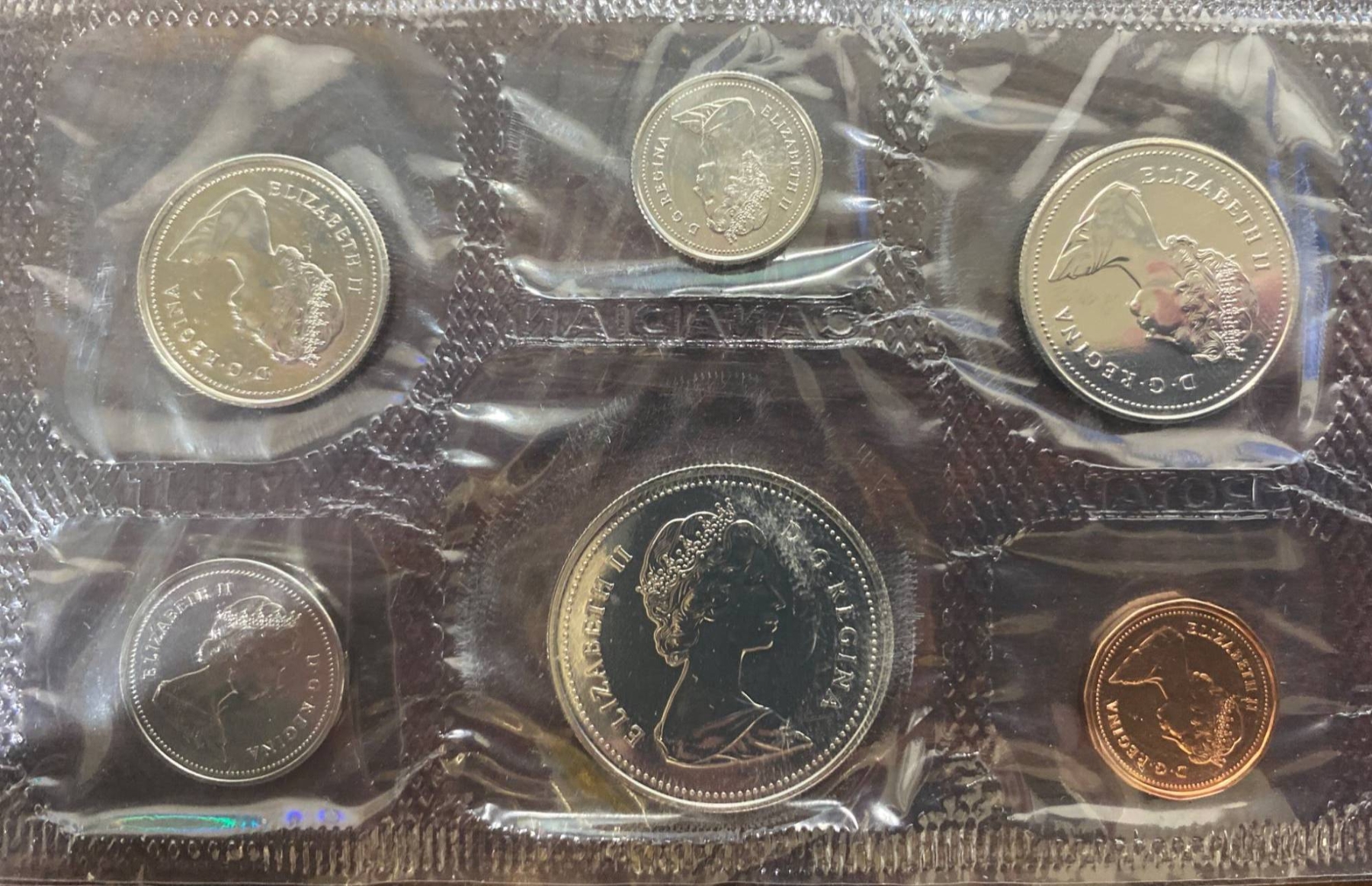 1987 Royal Canadian Mint uncirculated coin set featuring seven coins from the Canadian currency system, including a dollar, 50 cents, 25 cents, 10 cents, 5 cents, and 1 cent. Each coin is sealed in its original mint packaging and accompanied by an informational card. Packaging measures approximately 6.7 x 4 inches. A great collectible or gift for enthusiasts of Canadian numismatics.