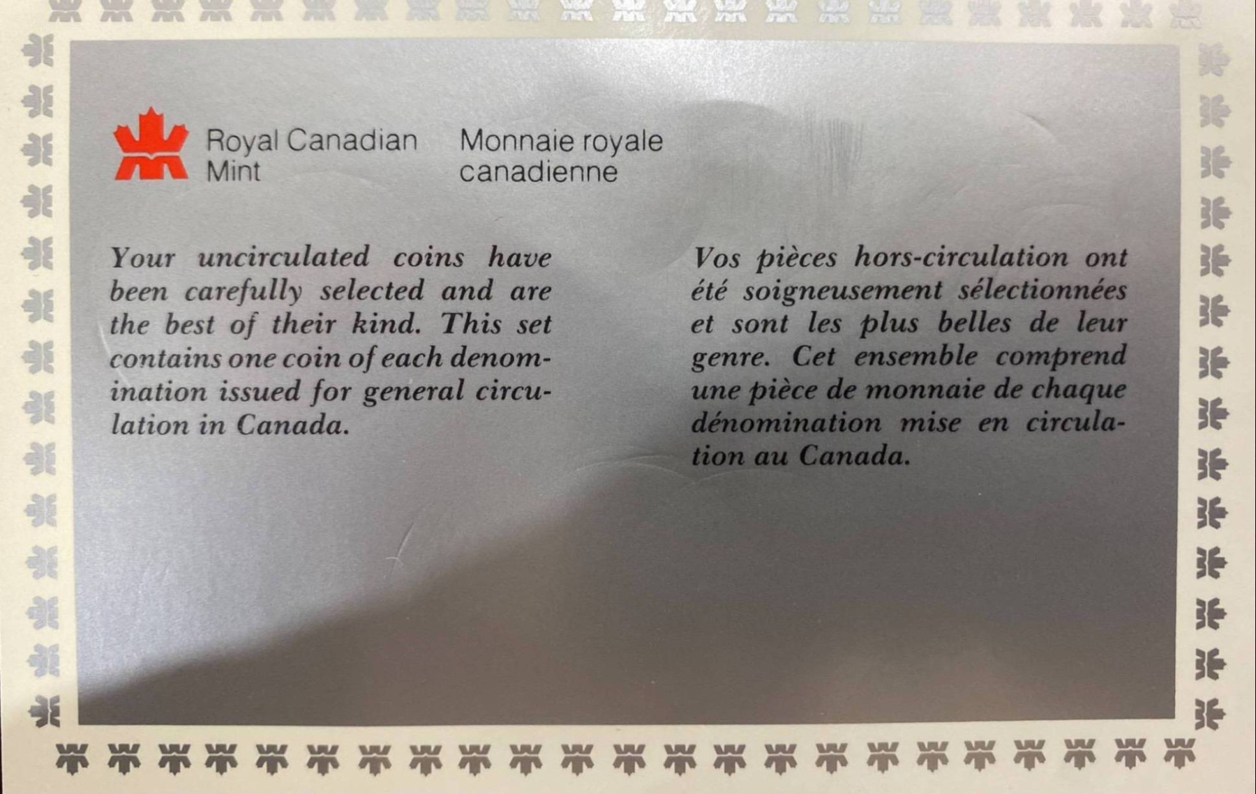 1987 Royal Canadian Mint uncirculated coin set featuring seven coins from the Canadian currency system, including a dollar, 50 cents, 25 cents, 10 cents, 5 cents, and 1 cent. Each coin is sealed in its original mint packaging and accompanied by an informational card. Packaging measures approximately 6.7 x 4 inches. A great collectible or gift for enthusiasts of Canadian numismatics.