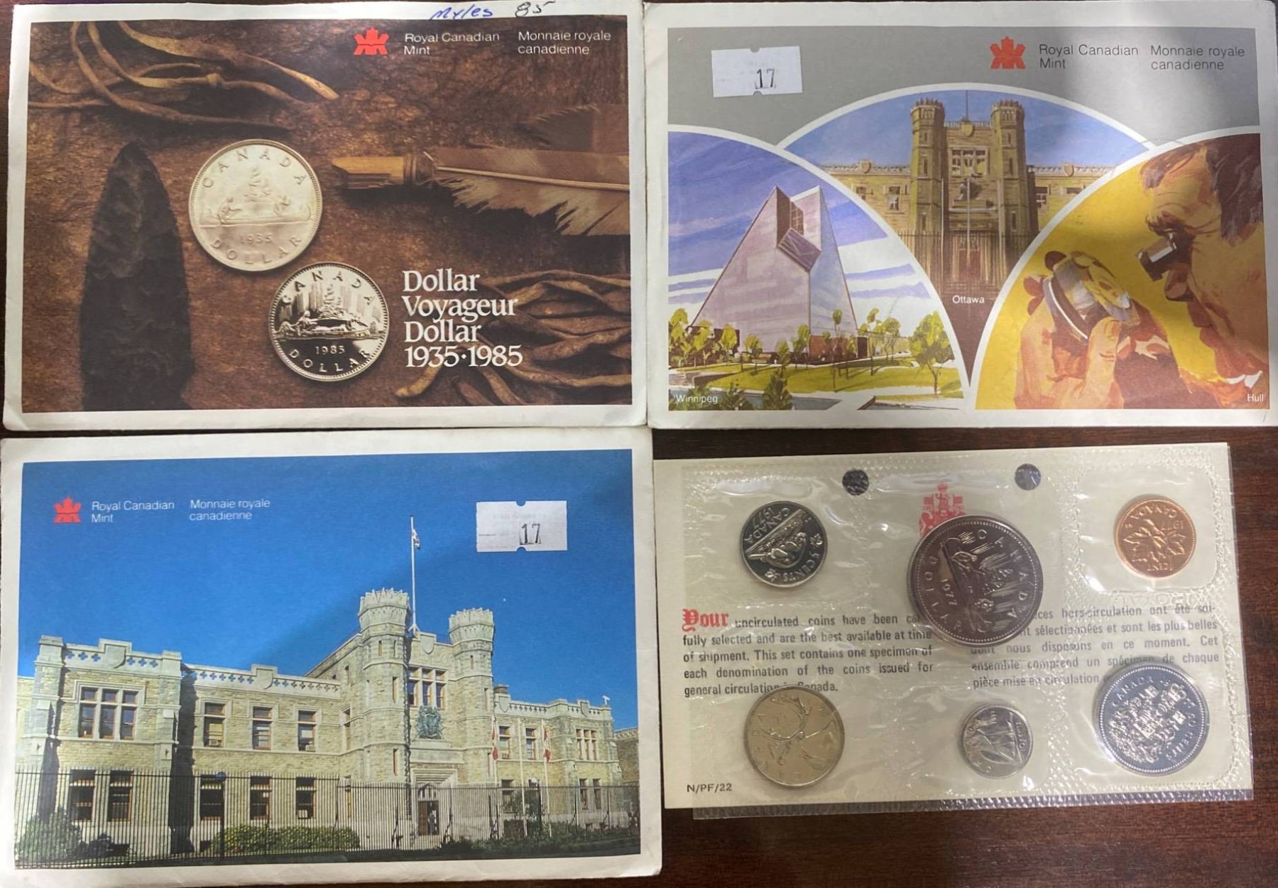1987 Royal Canadian Mint uncirculated coin set featuring seven coins from the Canadian currency system, including a dollar, 50 cents, 25 cents, 10 cents, 5 cents, and 1 cent. Each coin is sealed in its original mint packaging and accompanied by an informational card. Packaging measures approximately 6.7 x 4 inches. A great collectible or gift for enthusiasts of Canadian numismatics.