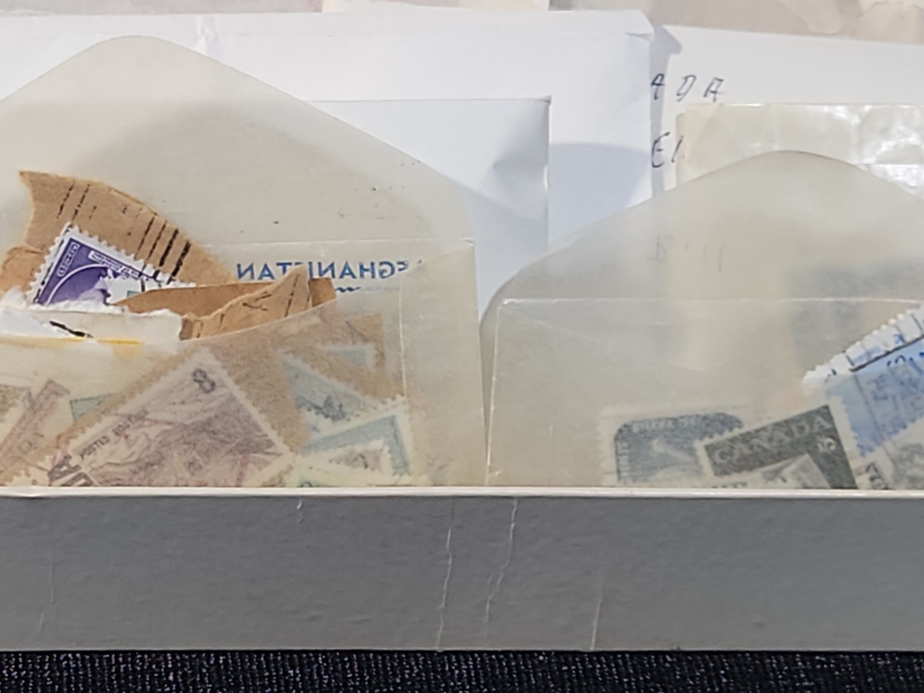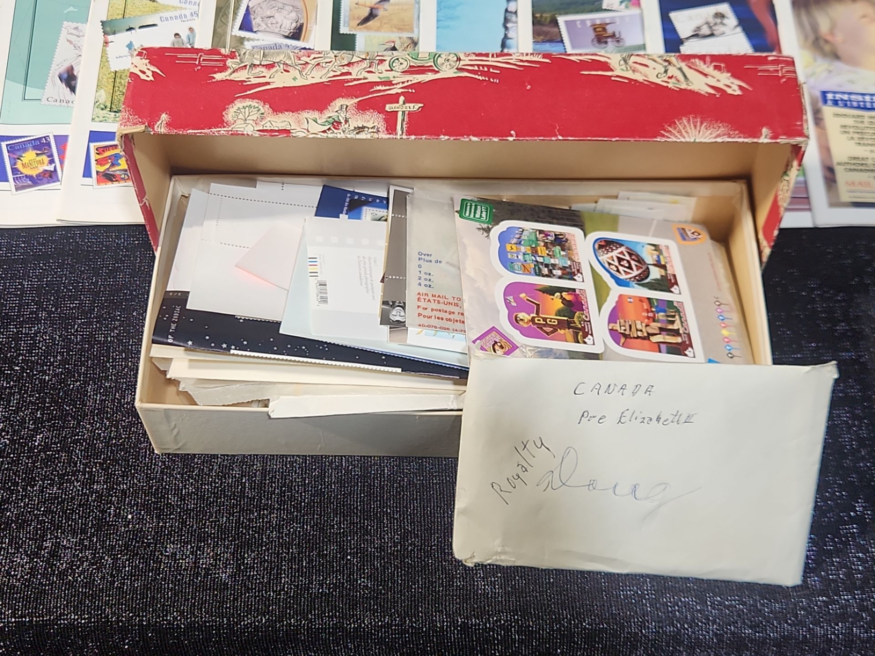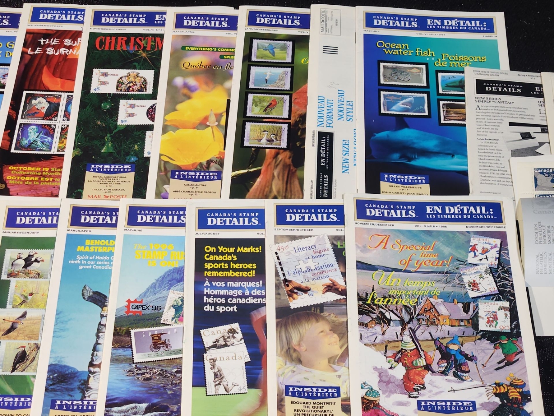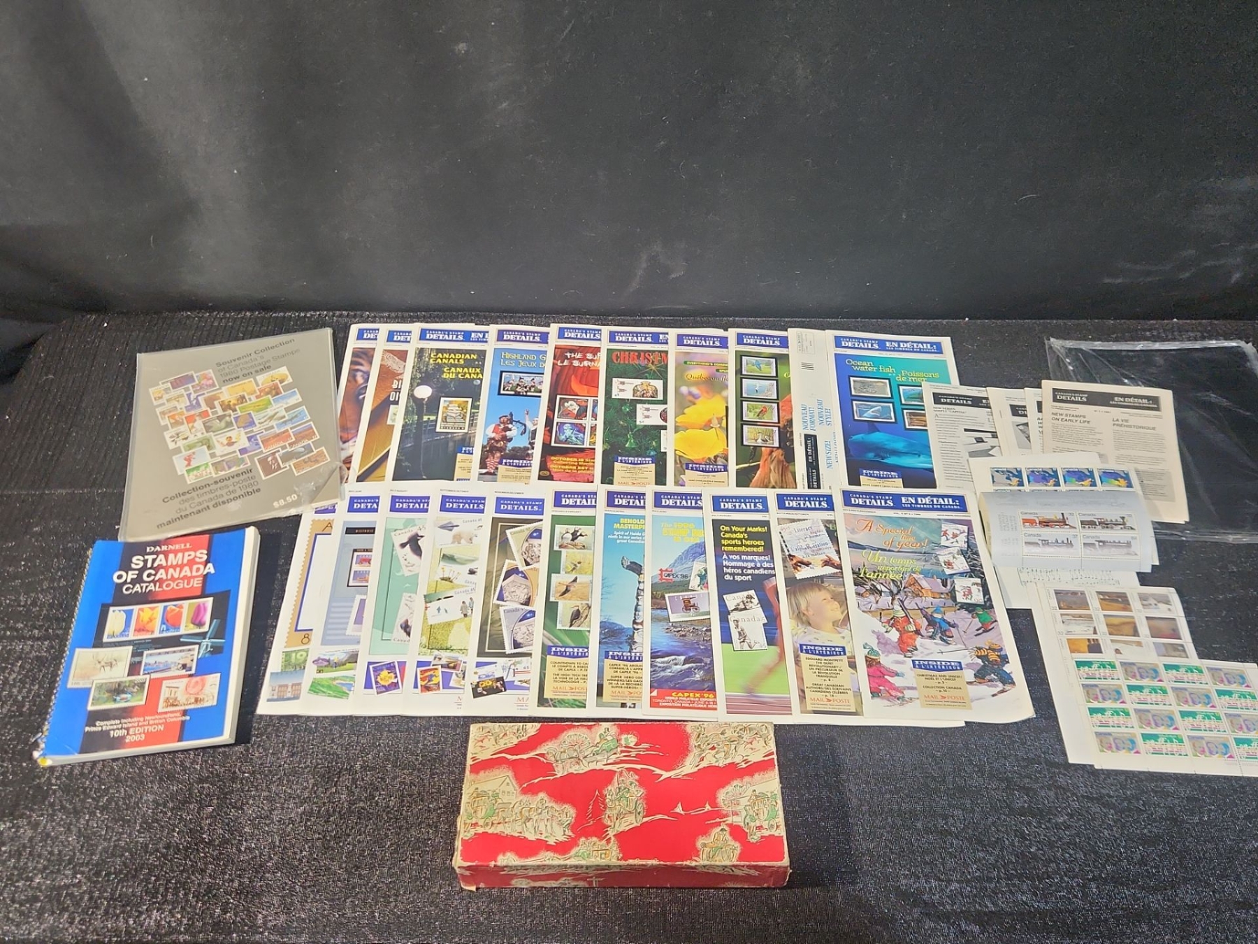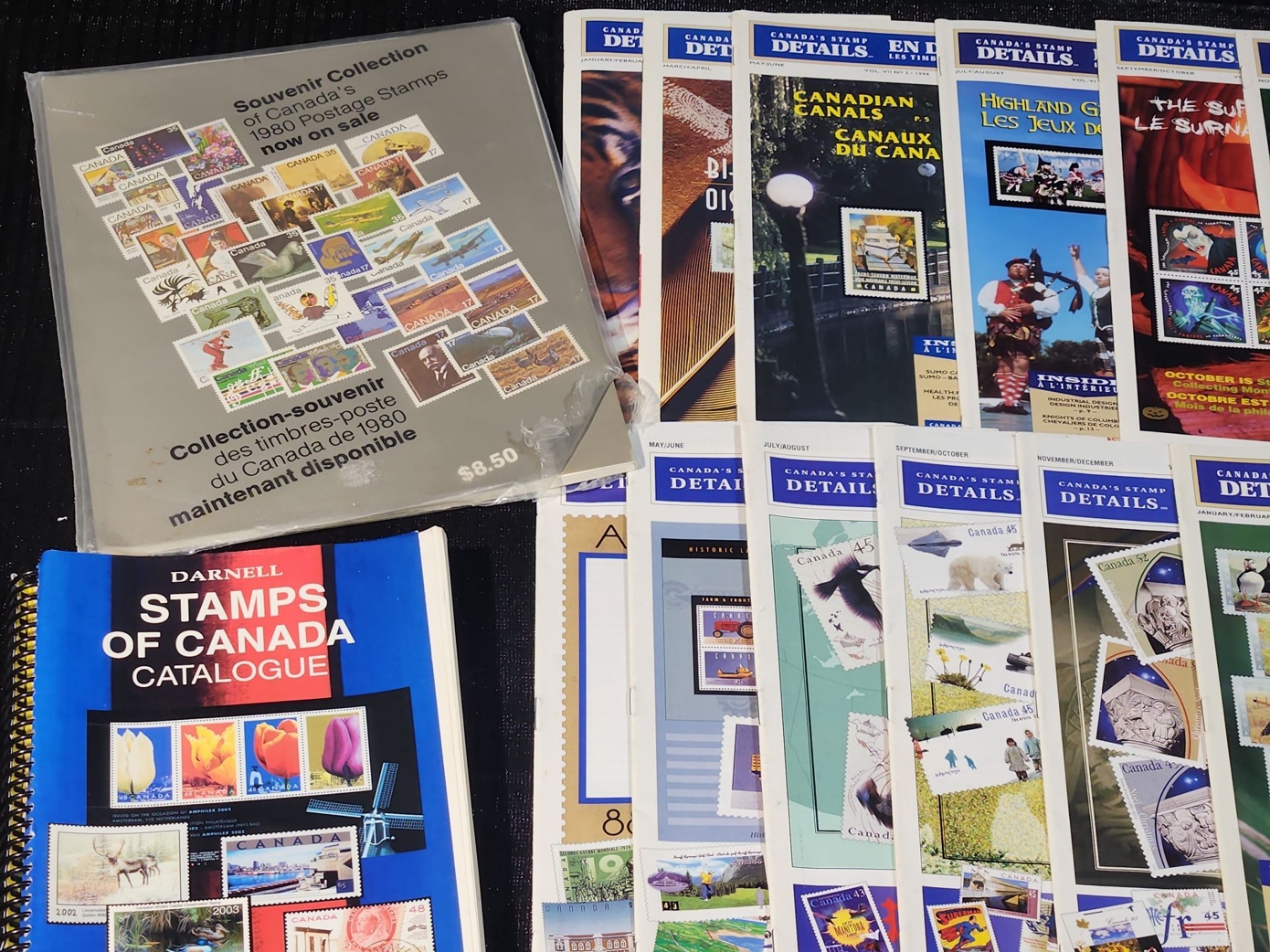 A collection of Canada Post “Details” magazines from the 1990s, accompanied by a stamp collector’s guide book and a small assortment of loose stamps. The magazines highlight new issue releases and postal history features from the era, offering excellent reference value. A useful grouping for collectors seeking period postal publications and supplementary stamp material.