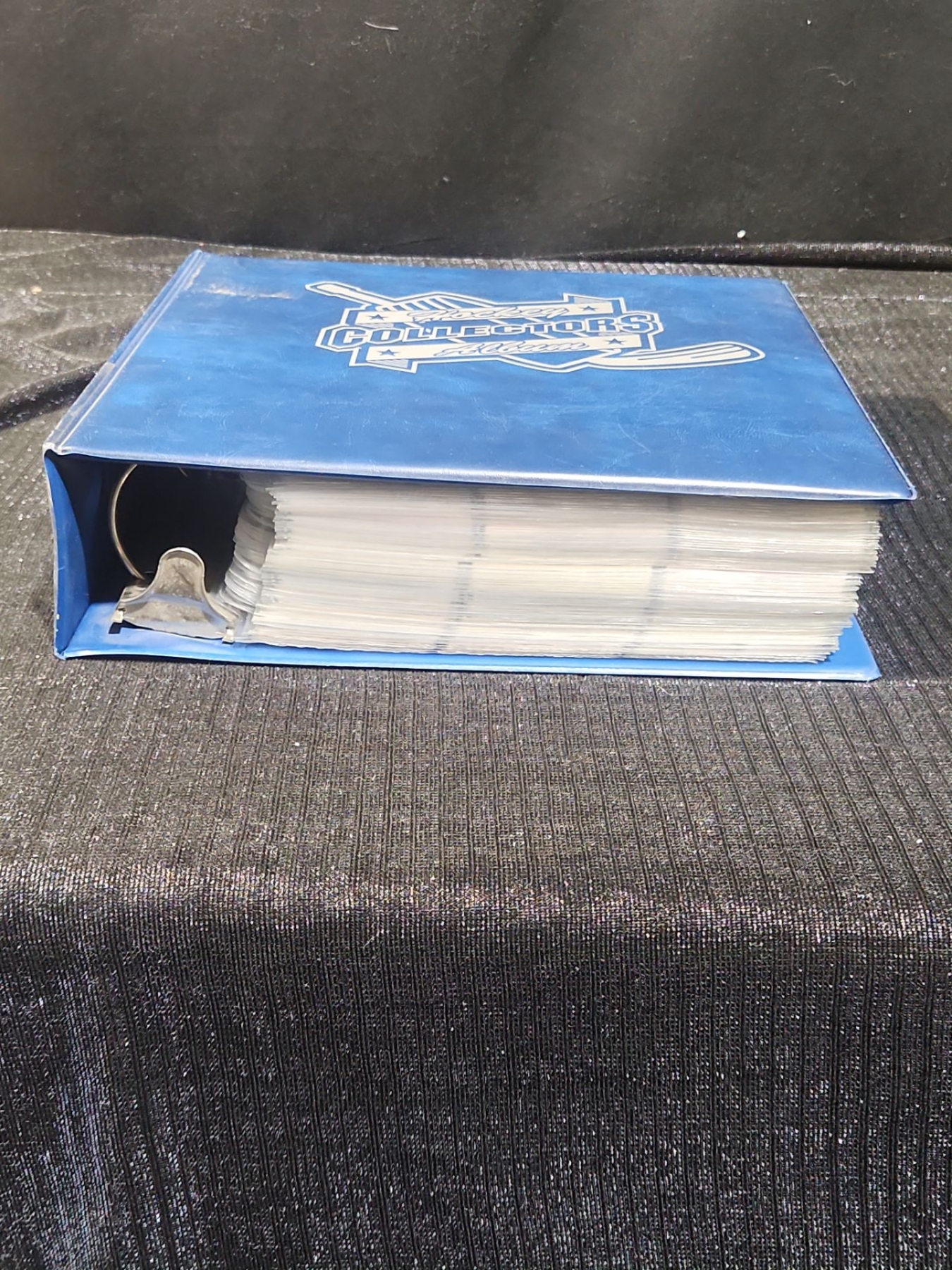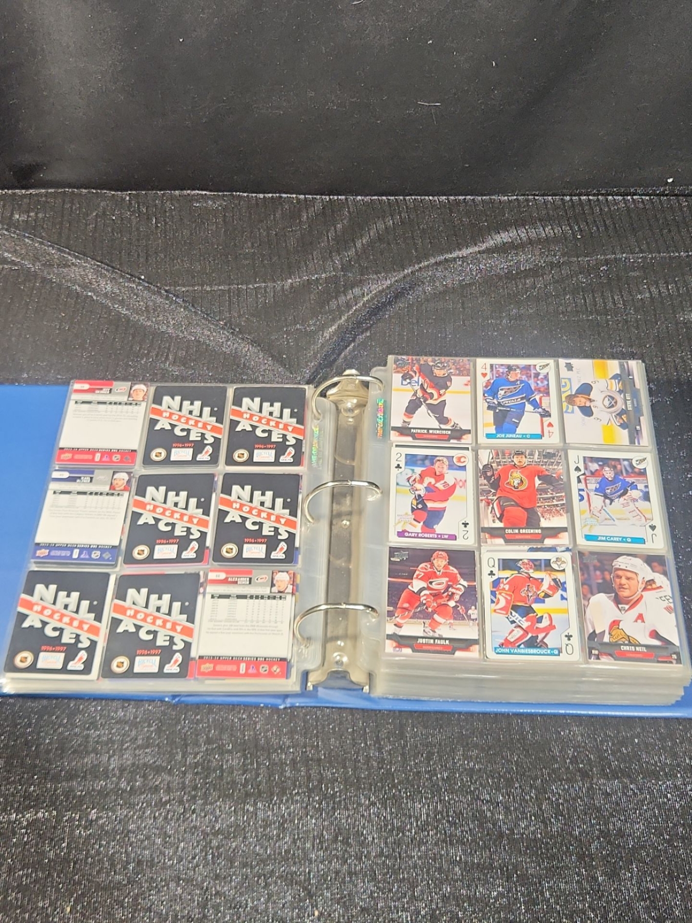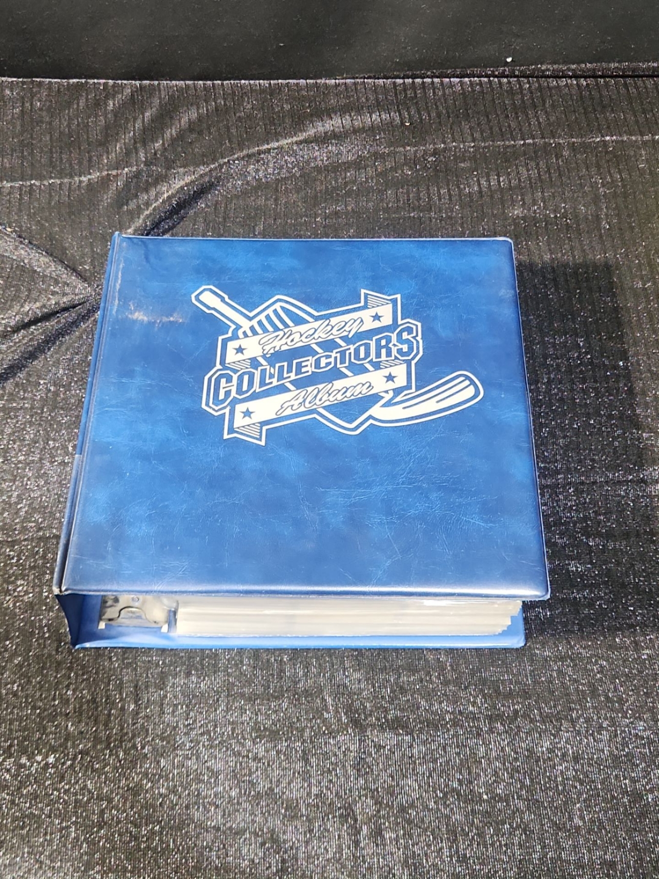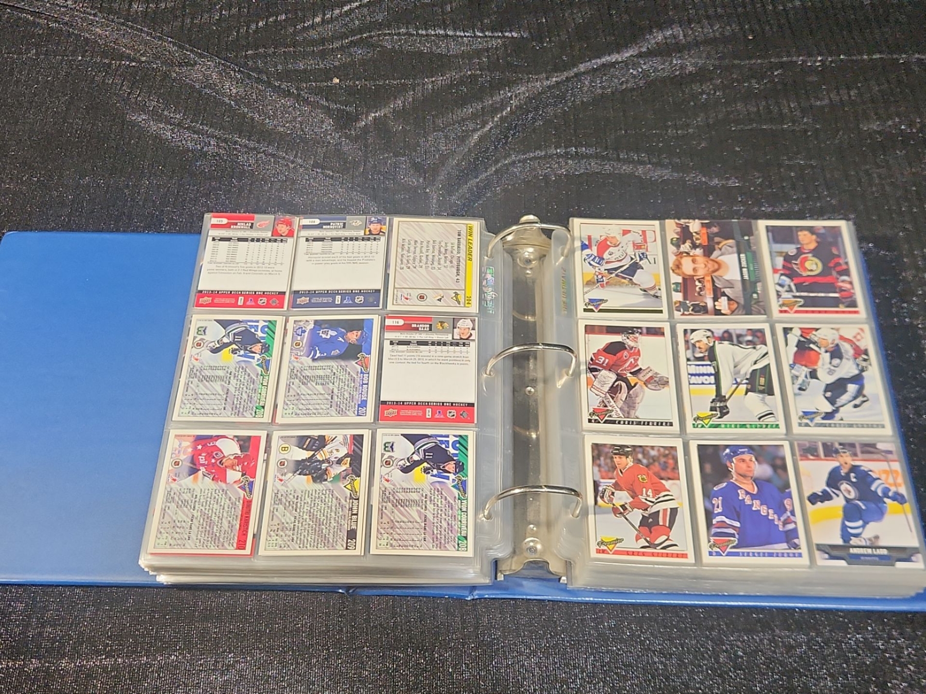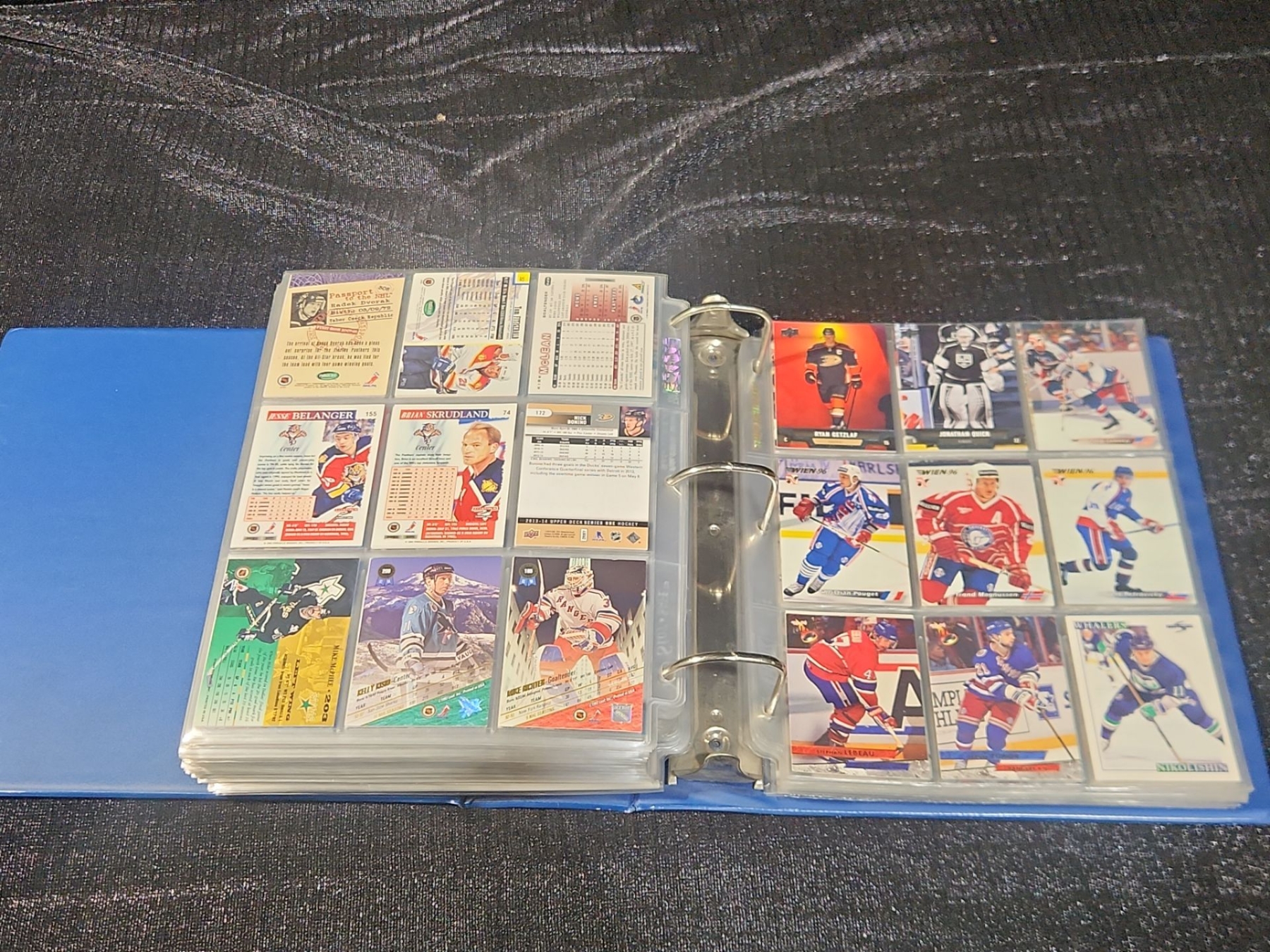a blue binder containing a collection of vintage hockey trading cards, primarily from the 1991-92 Upper Deck NHL Hockey series.