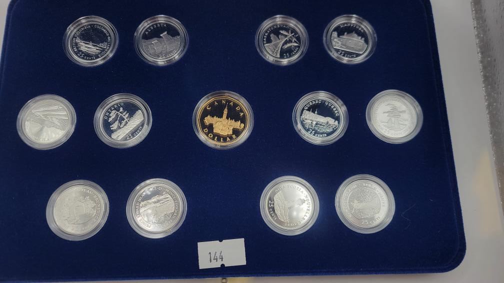 Issued by the Royal Canadian Mint in silver, the twelve different designs represent a familiar scene from each of the twelve provinces and territories of Canada. This is the first issue of sterling silver 25-cent coins since 1919. This set also includes the 1992 Loon dollar.