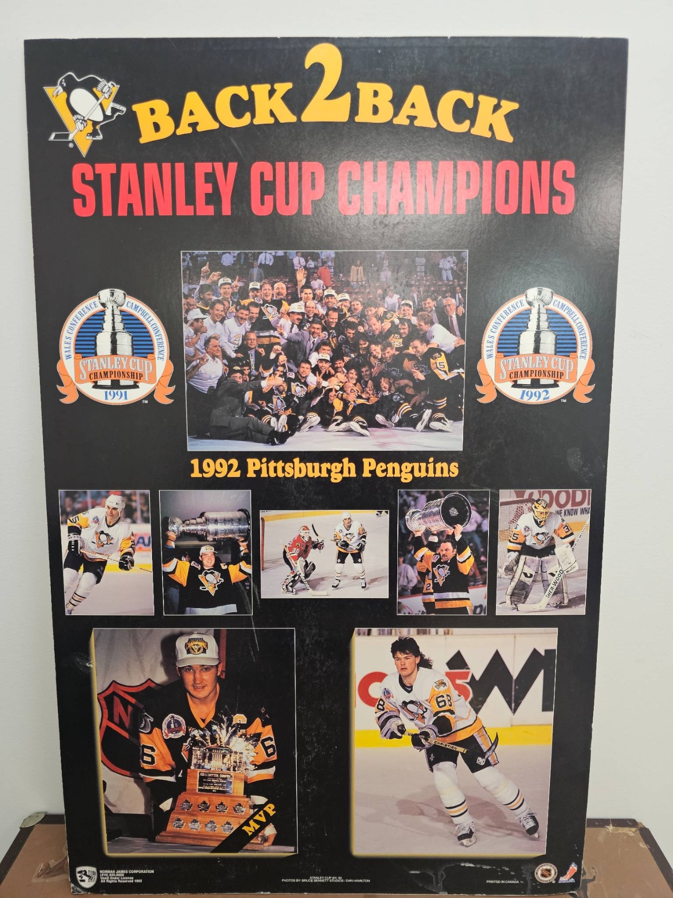 Commemorative poster celebrating the 1992 Pittsburgh Penguins back-to-back Stanley Cup victories. Features team photos, logos, and key players, highlighting their championship win. Measures 22 inches in width and 33 inches in height, ideal for sports memorabilia collectors or hockey enthusiasts.