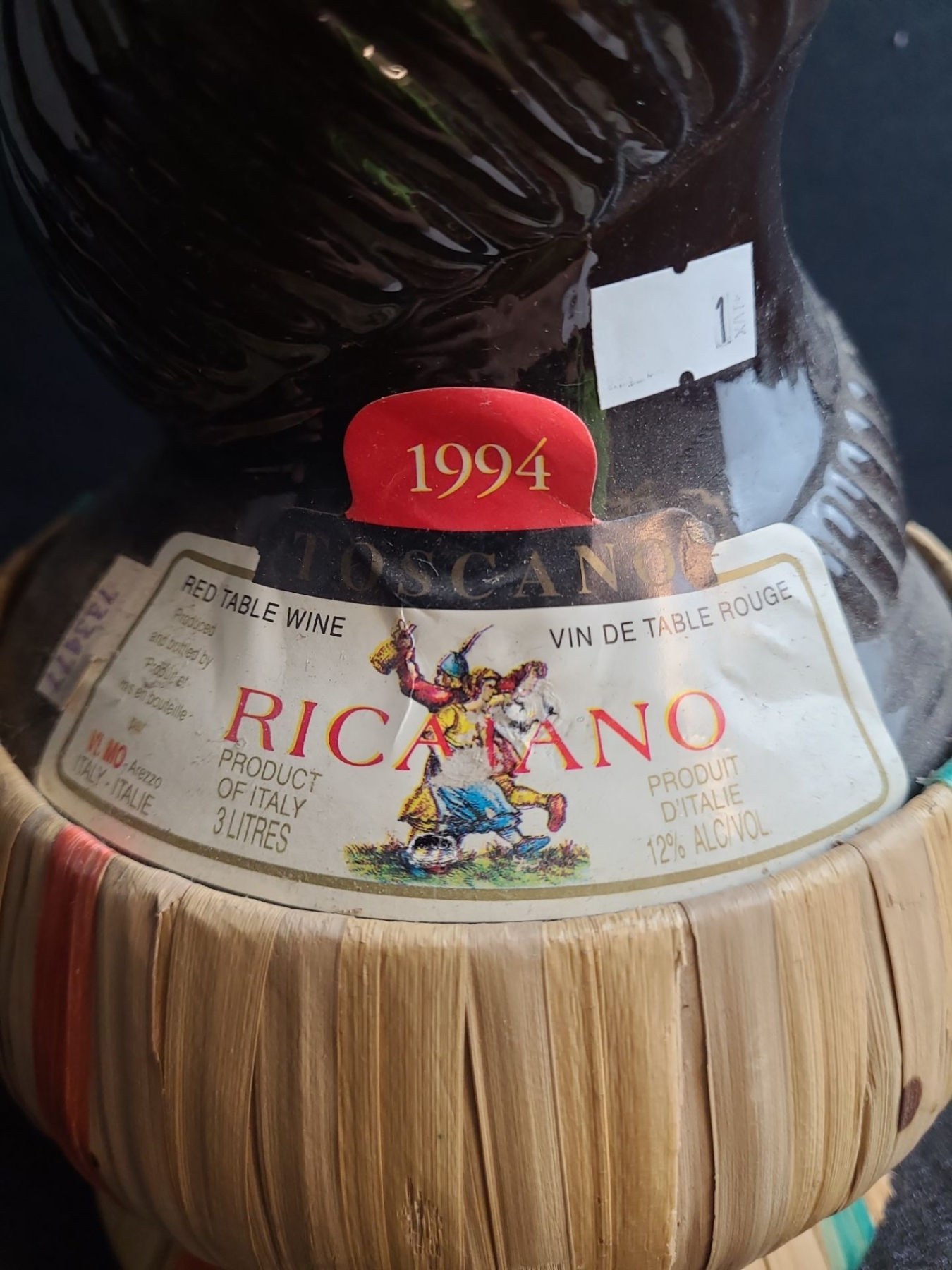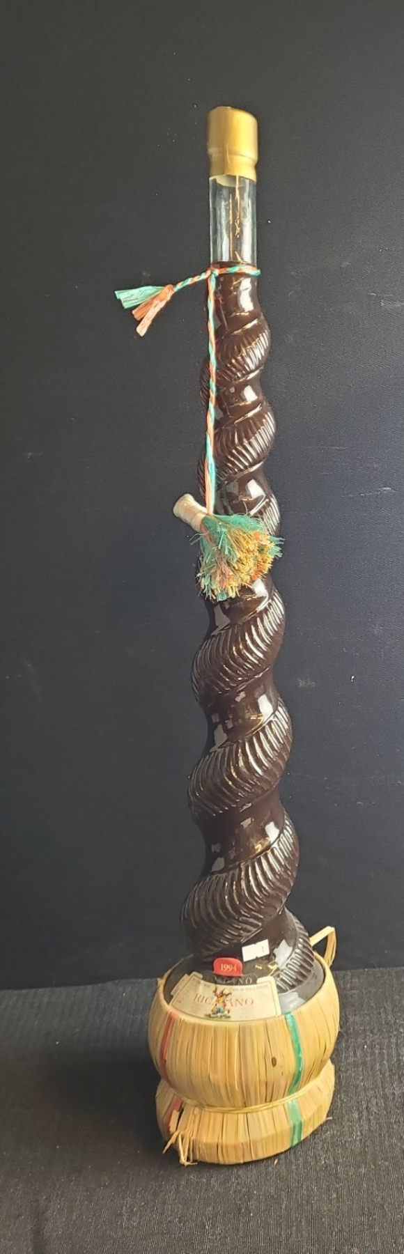 This unique and beautiful bottle of table wine is in a traditional Italian bottle style known as a "fiasco", which is characterized by a rounded bottom and a straw basket covering. Originally made that way to protect the bottle during transport.