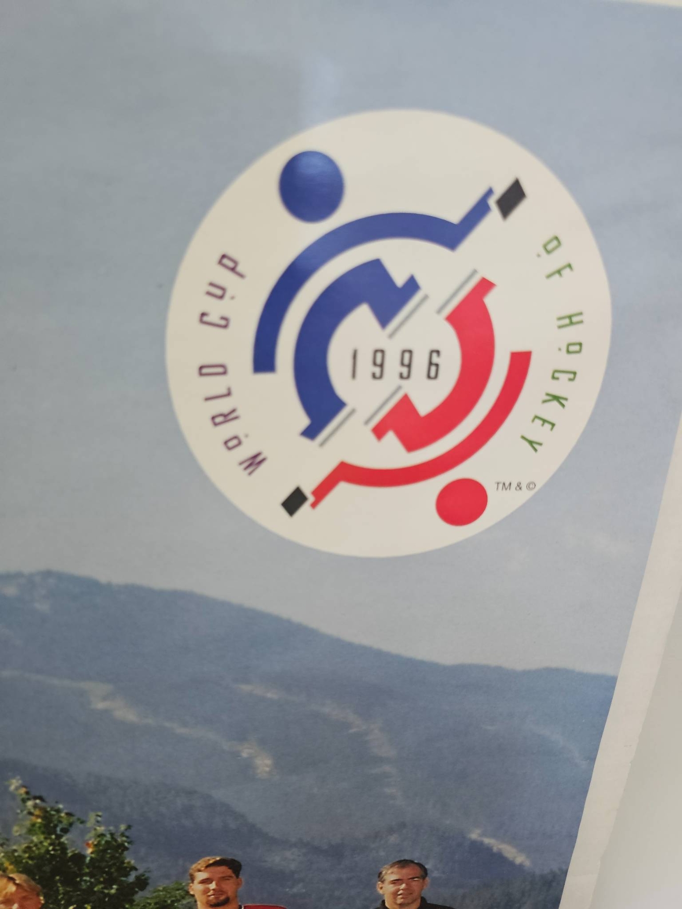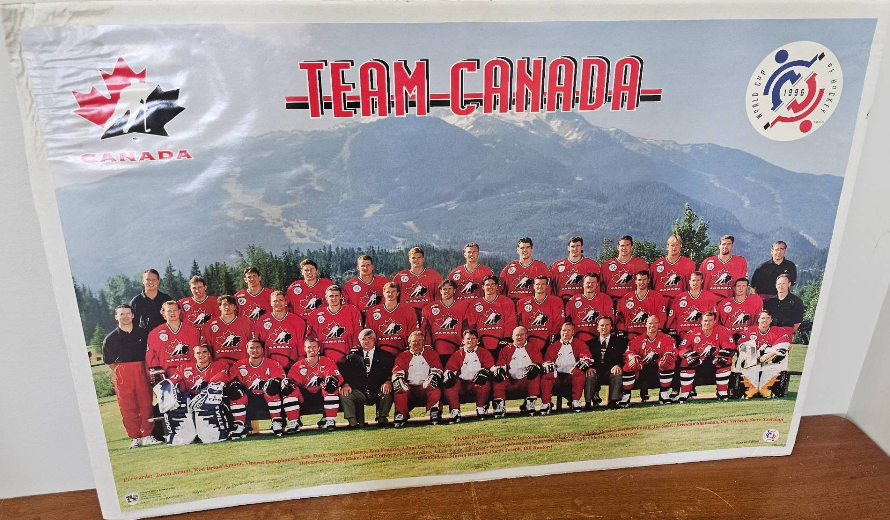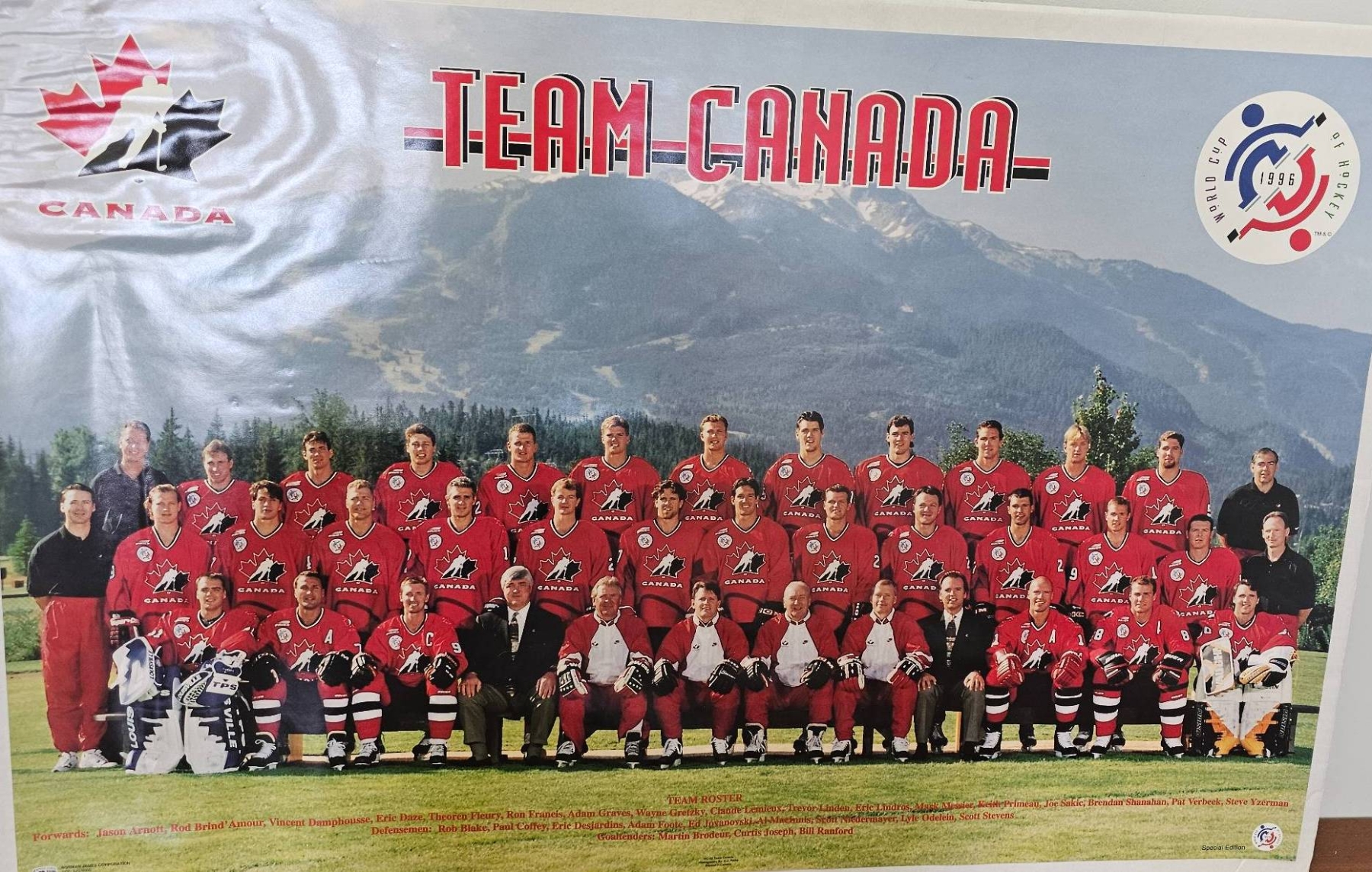 1996 Team Canada World Cup of Hockey poster featuring the full team dressed in red uniforms, standing in front of a scenic mountain backdrop. Includes official logos from Team Canada and the 1996 World Cup of Hockey. Poster appears slightly aged with some wear visible around the edges. Dimensions and further condition details unspecified.