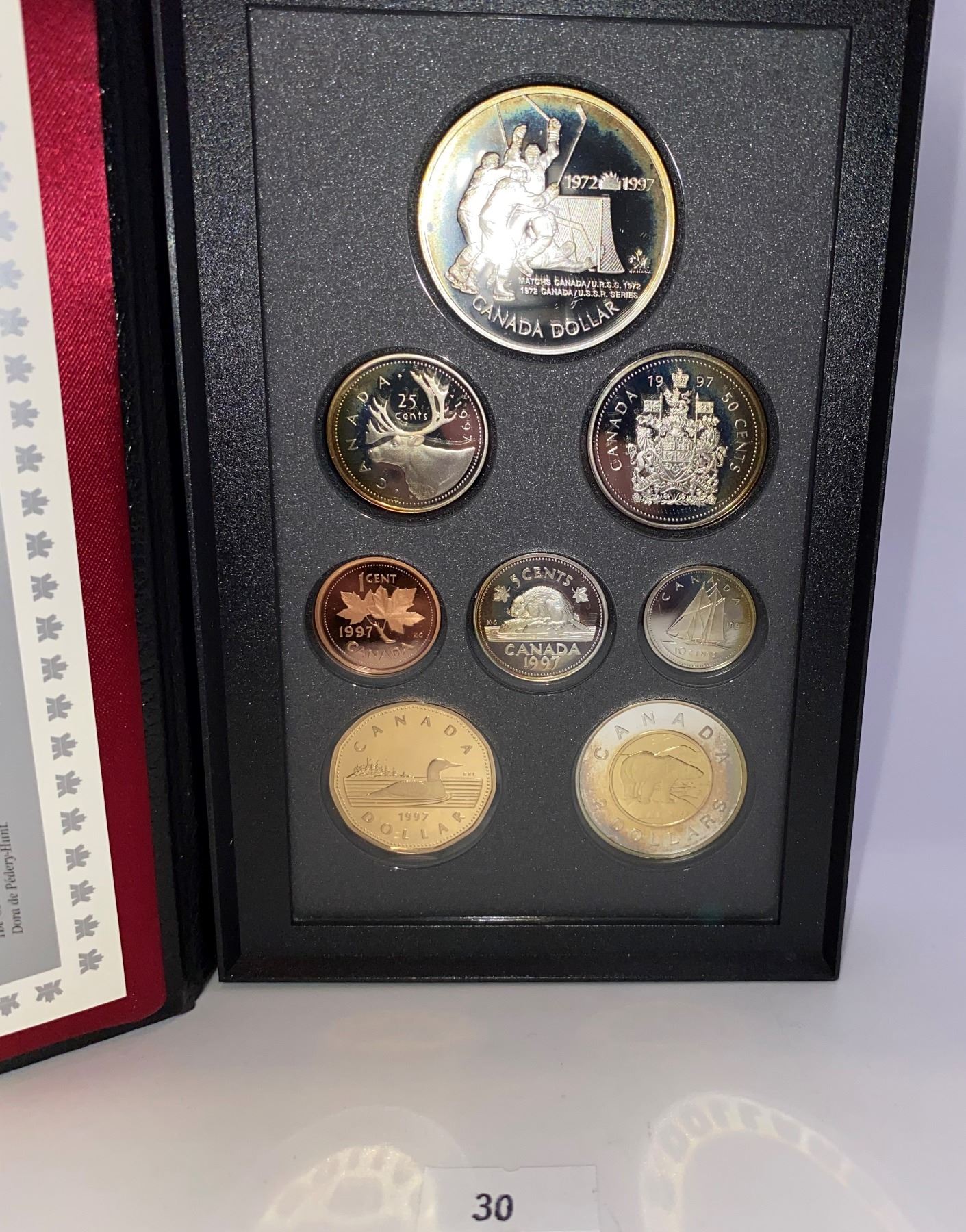 Beginning in 1997 the two dollar coin was added to the set, raising the total to eight coins. Paul Henderson's winning goal won the 1972 series for Canada. This dollar commemorates Canada's win against Russia.