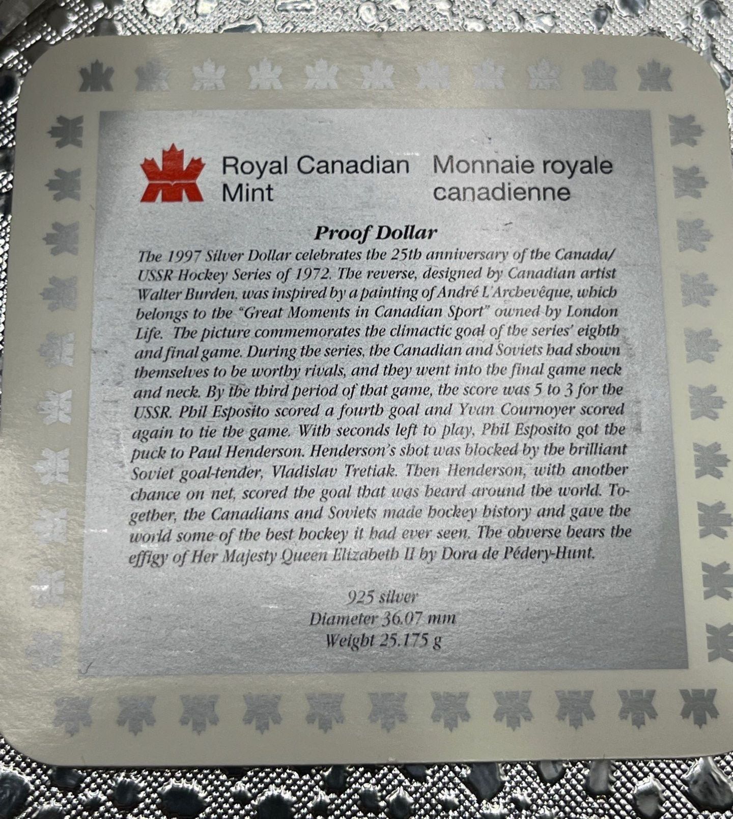 1997 Canadian 25th Anniversary of Hockey Victory Silver Dollar 25.175g 92.5% Silver