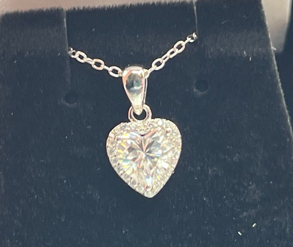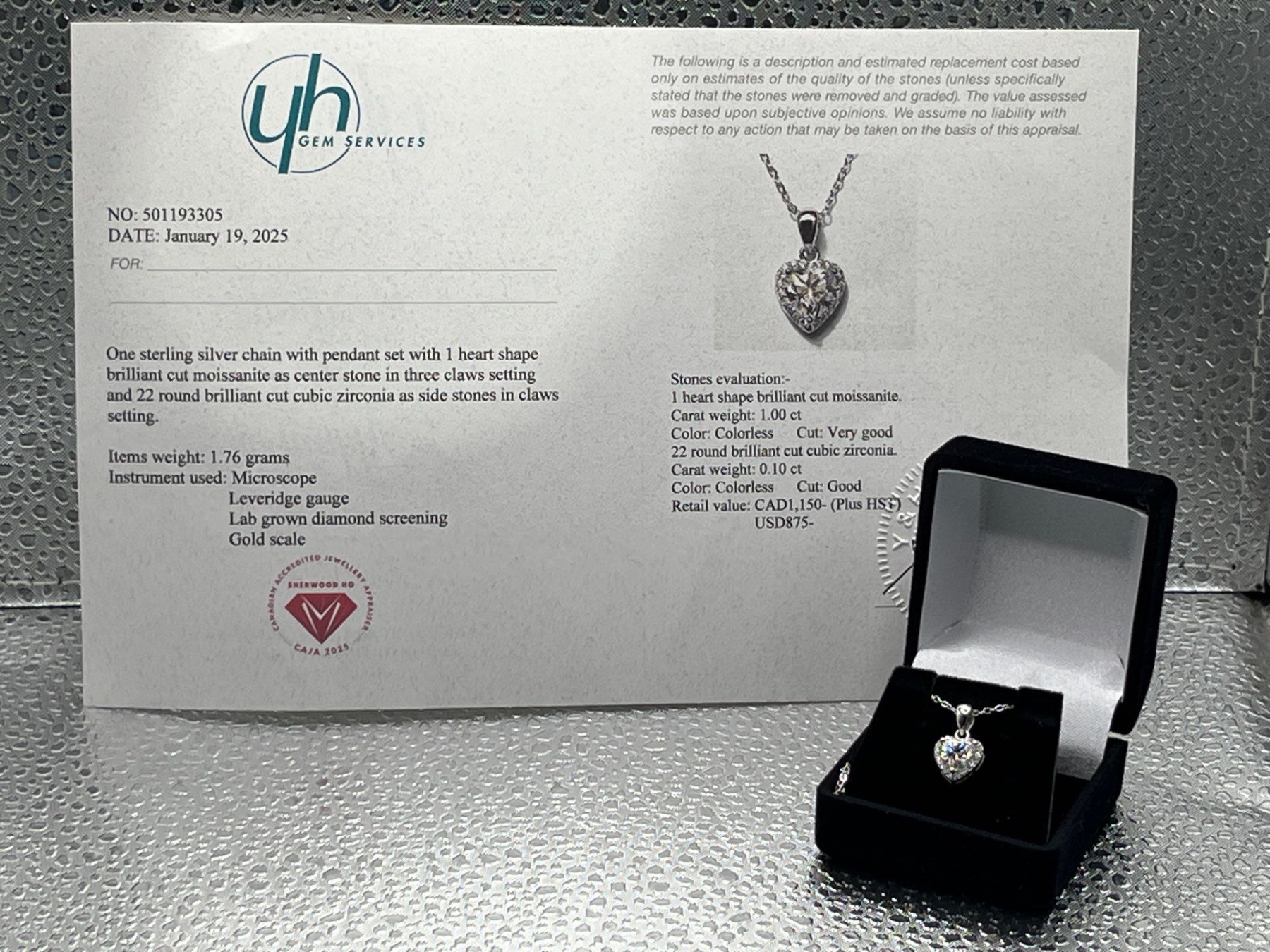 1ct Heart Brilliant Cut Moissanite with 22 Round Cut CZ in Heart Shaped Halo set in Sterling Silver