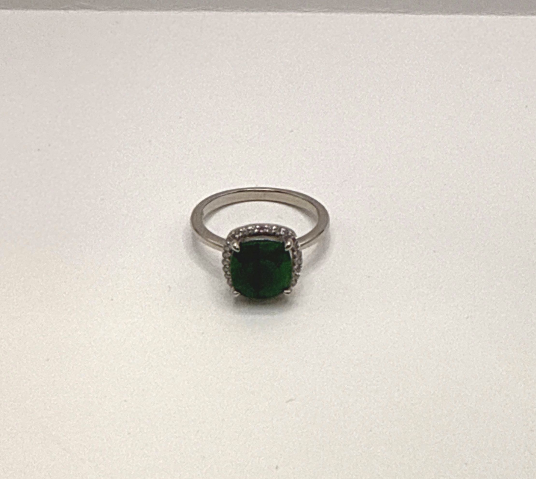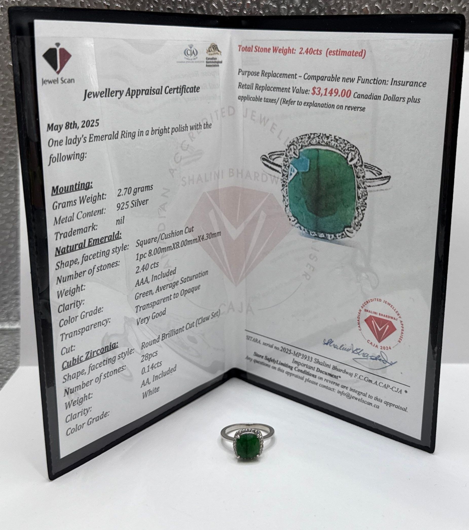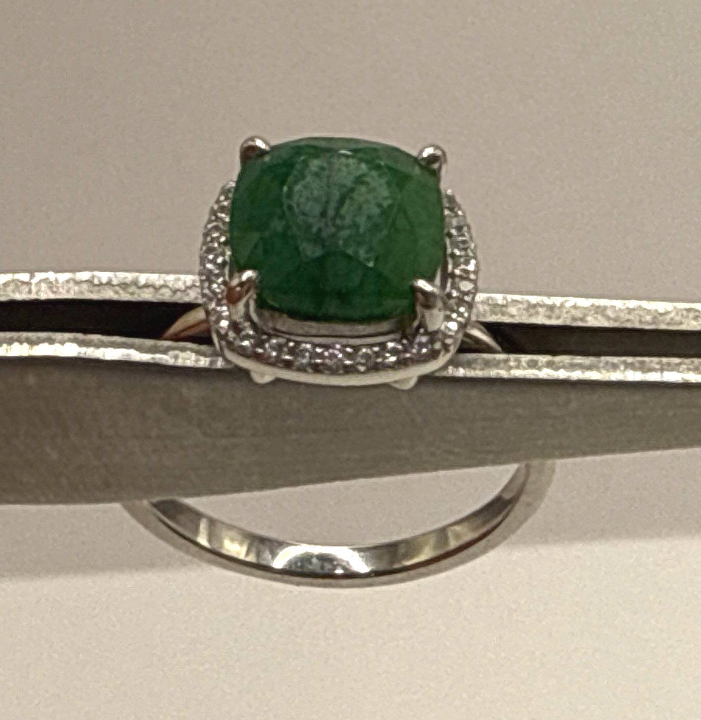 2.4ct Square/Cushion Cut Emerald, 28 CZ stones, in 925 Silver Ring (Approximately size 6)