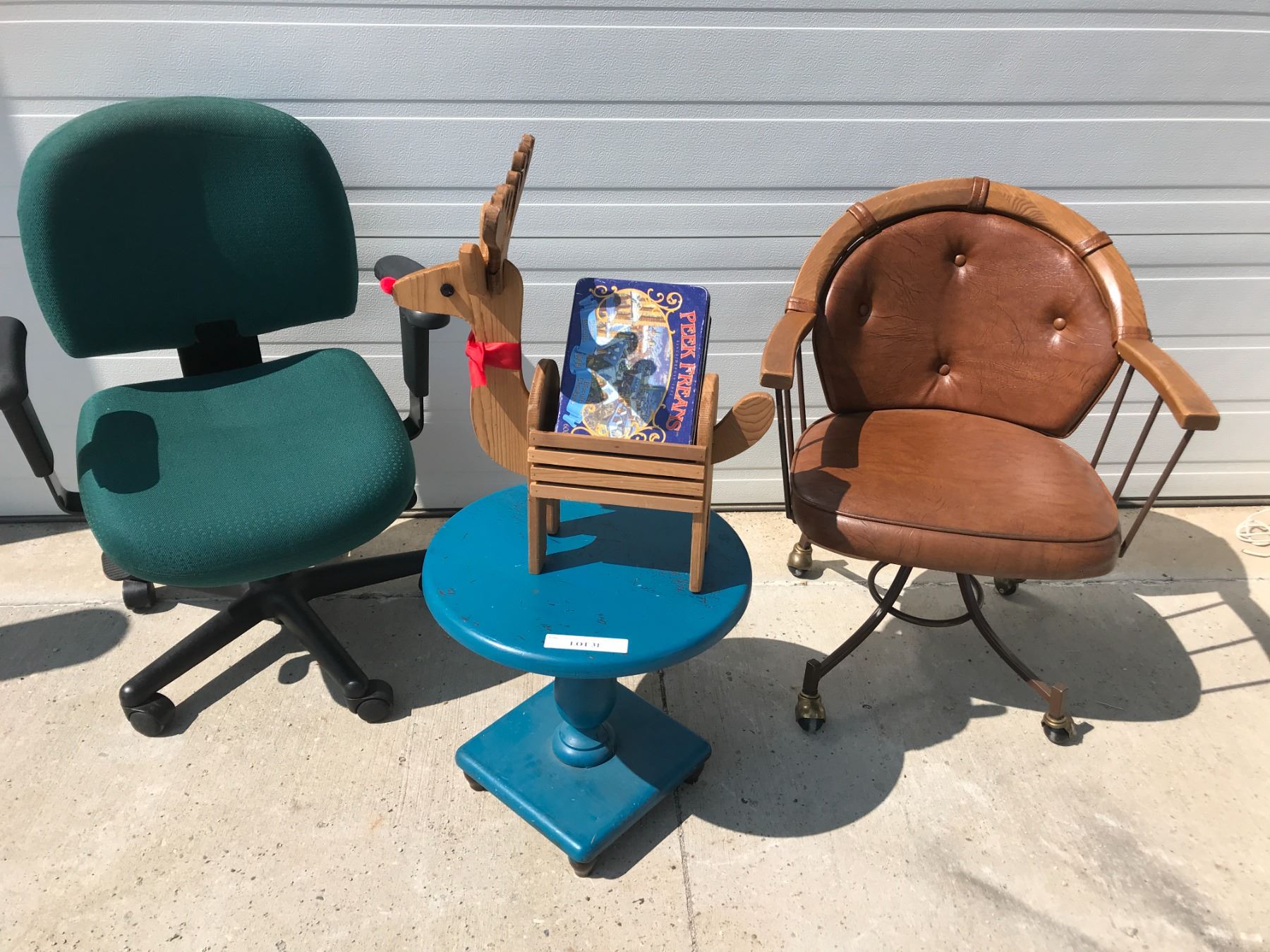 3 Desk Chairs (1 Leather), Small Blue Table & Reindeer Christmas Ornament