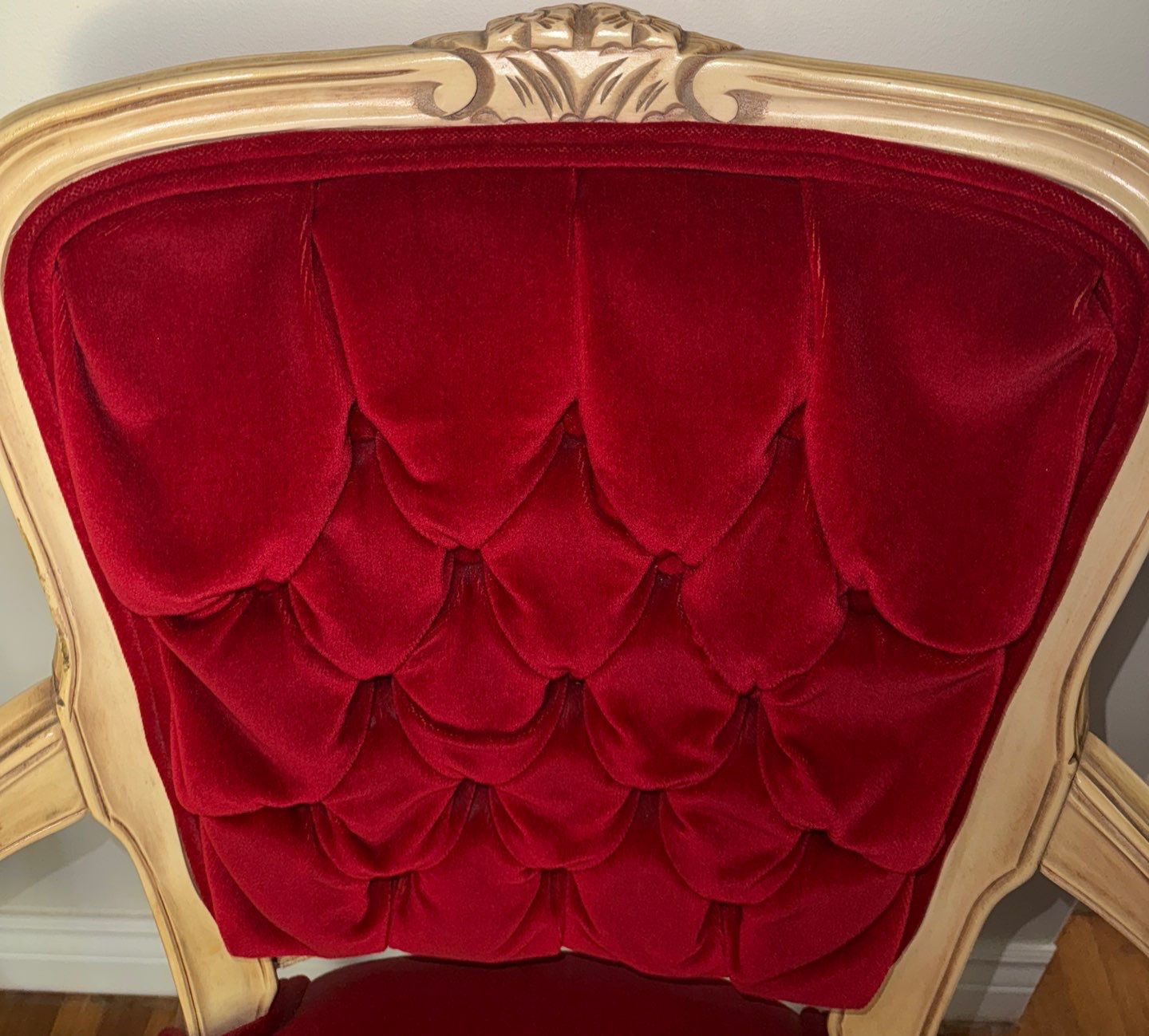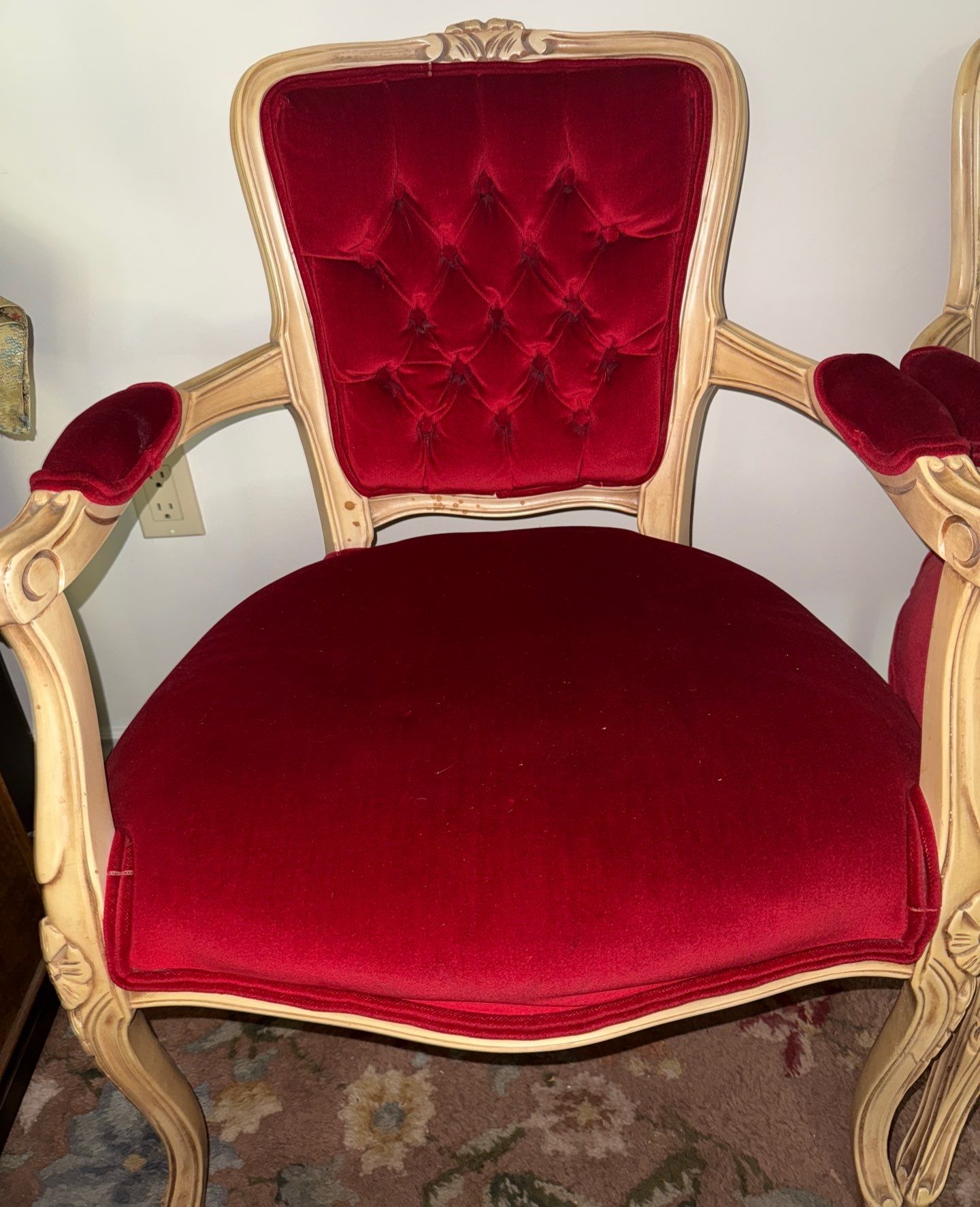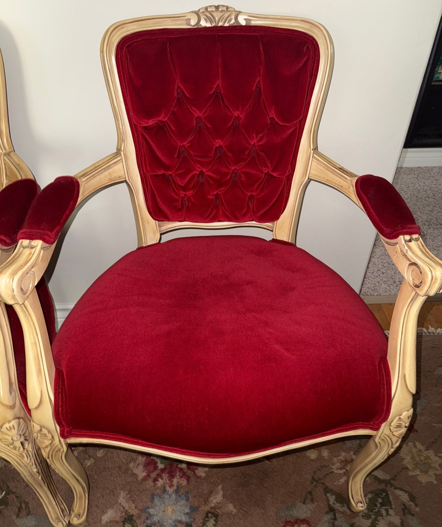 2 PCS. Neo Baroque Red Velvet Parlor Chairs 34T ( One Is Slightly Deflated )