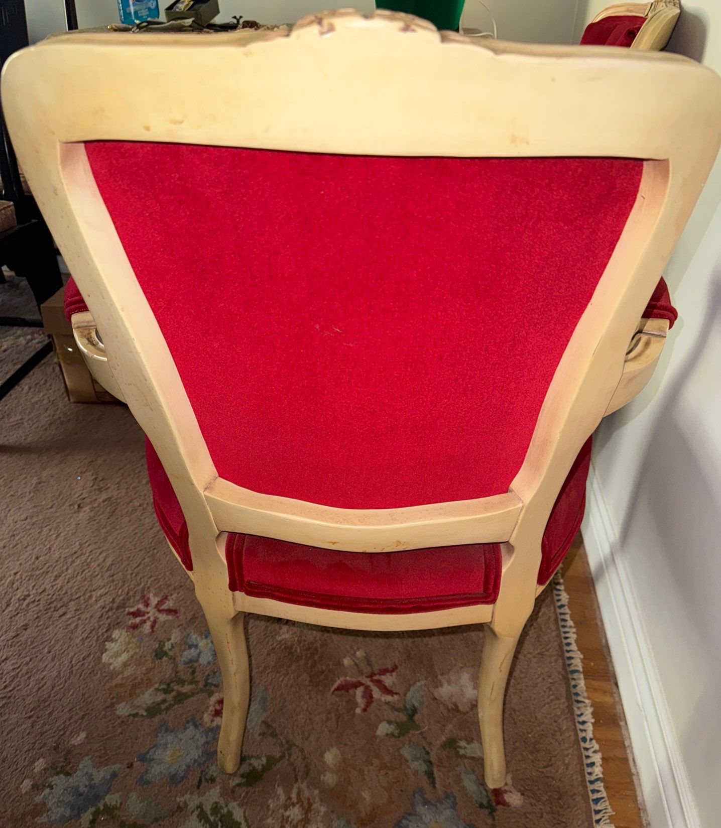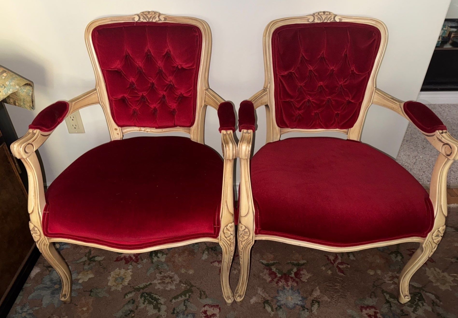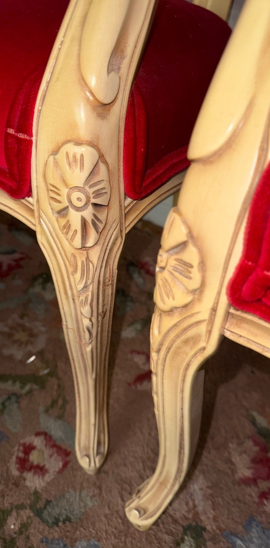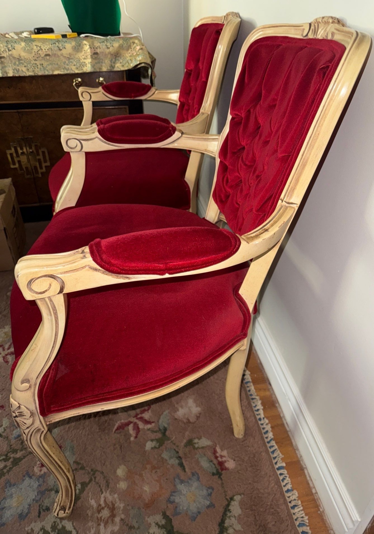 2 PCS. Neo Baroque Red Velvet Parlor Chairs 34T ( One Is Slightly Deflated )