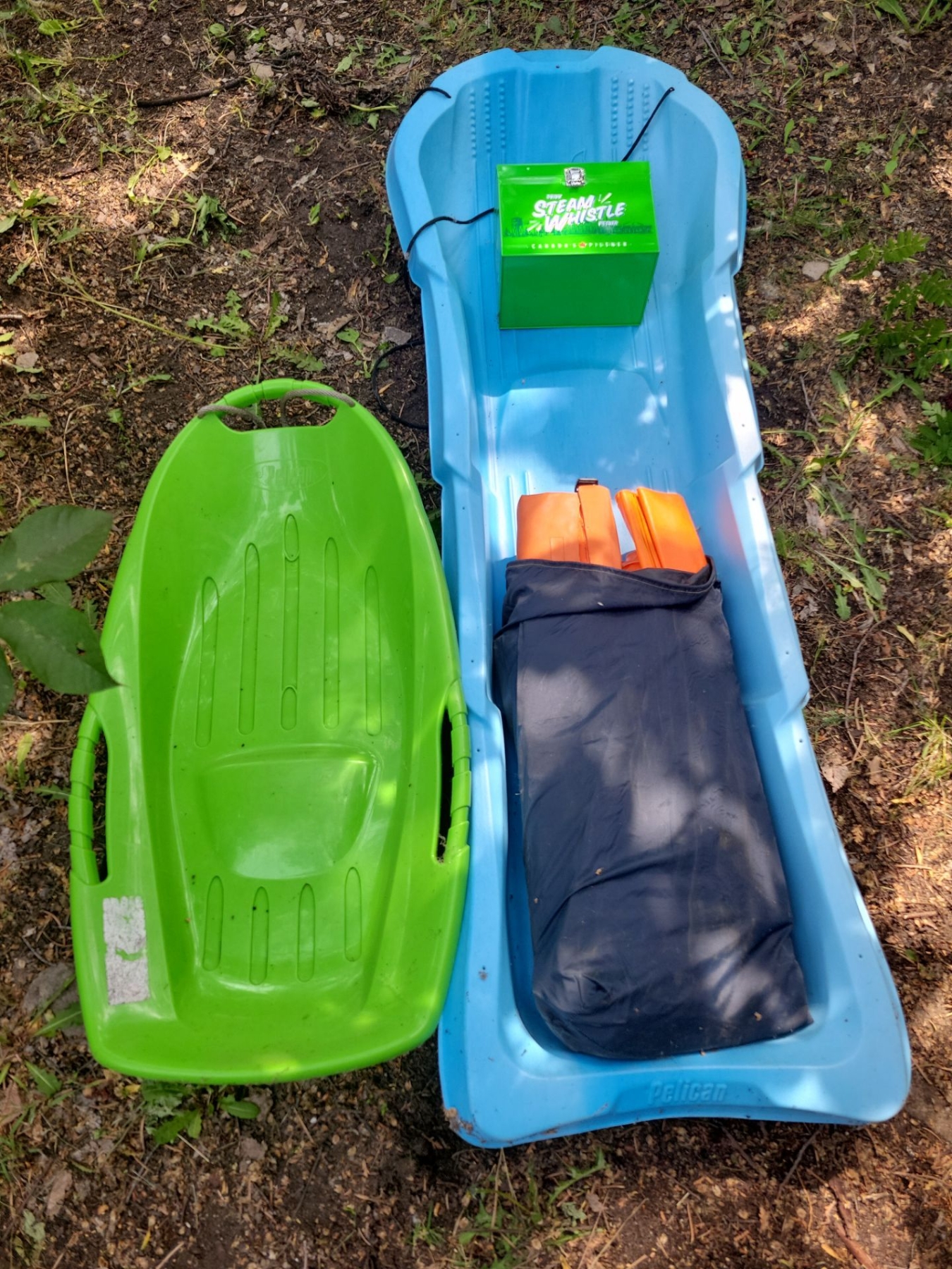 2 Pelican Winter Sleds w/ 2 Inflatable Air Beds & Collectable Tin w/ Lid
