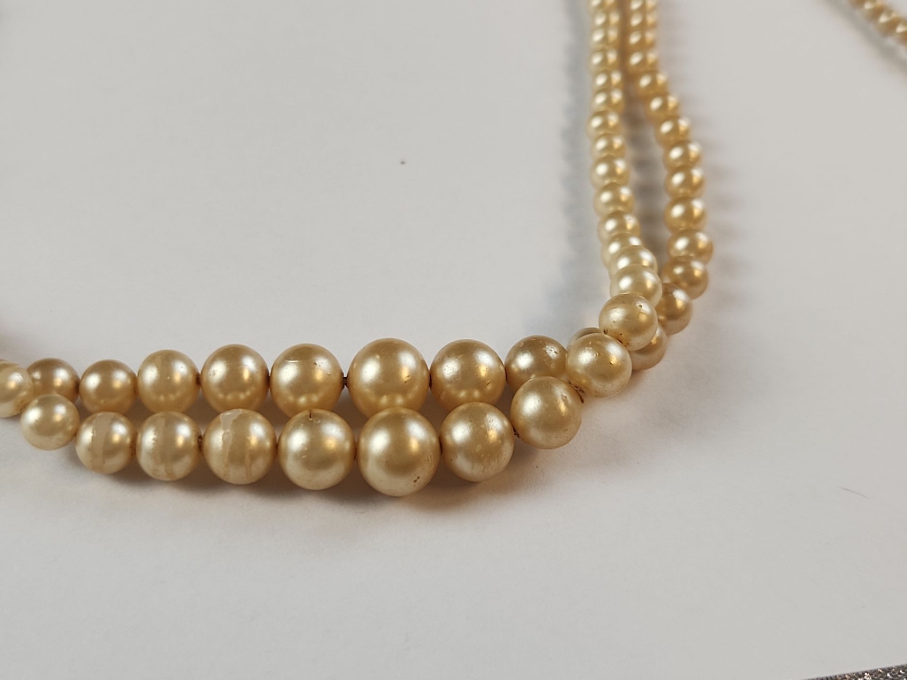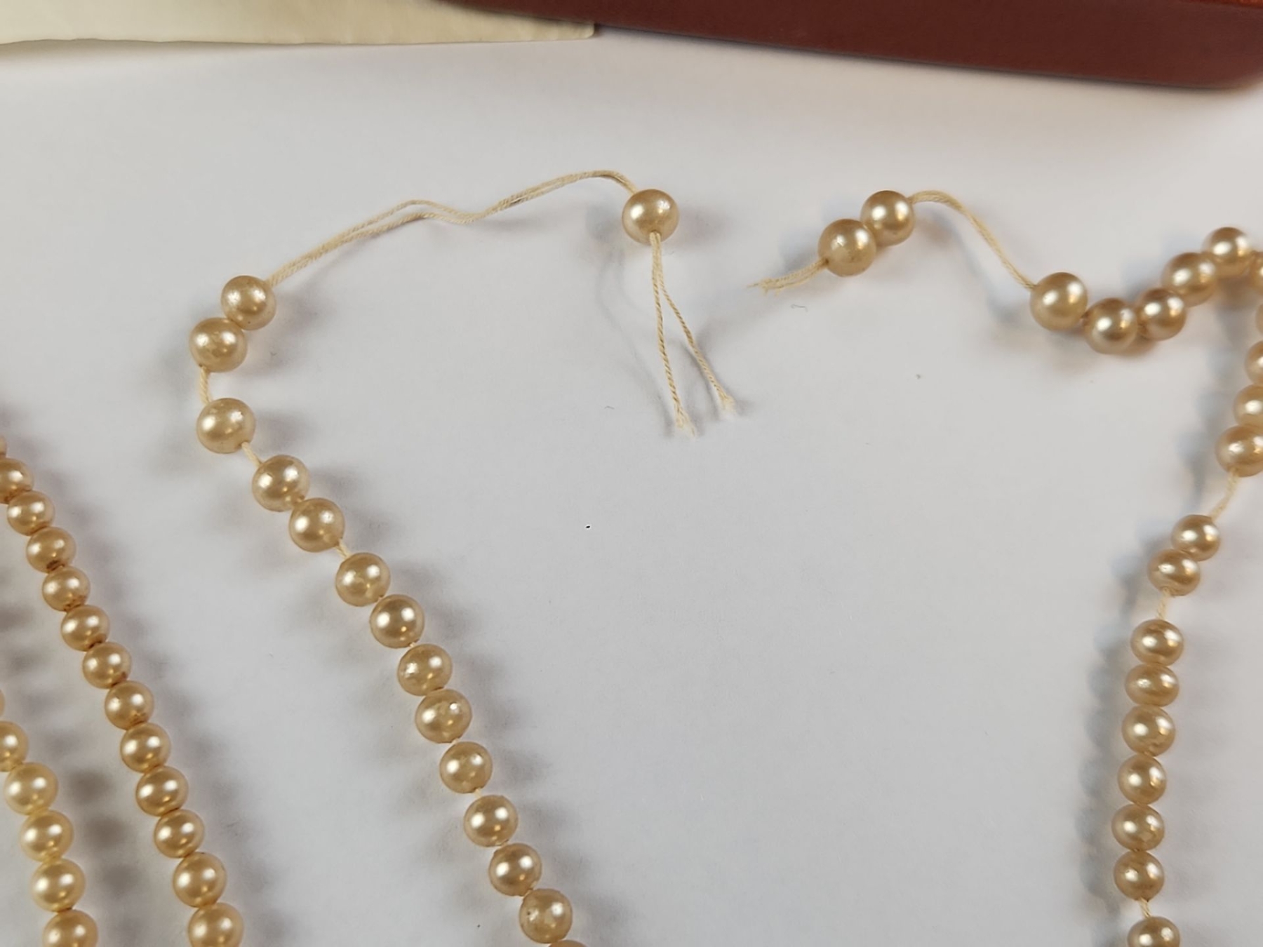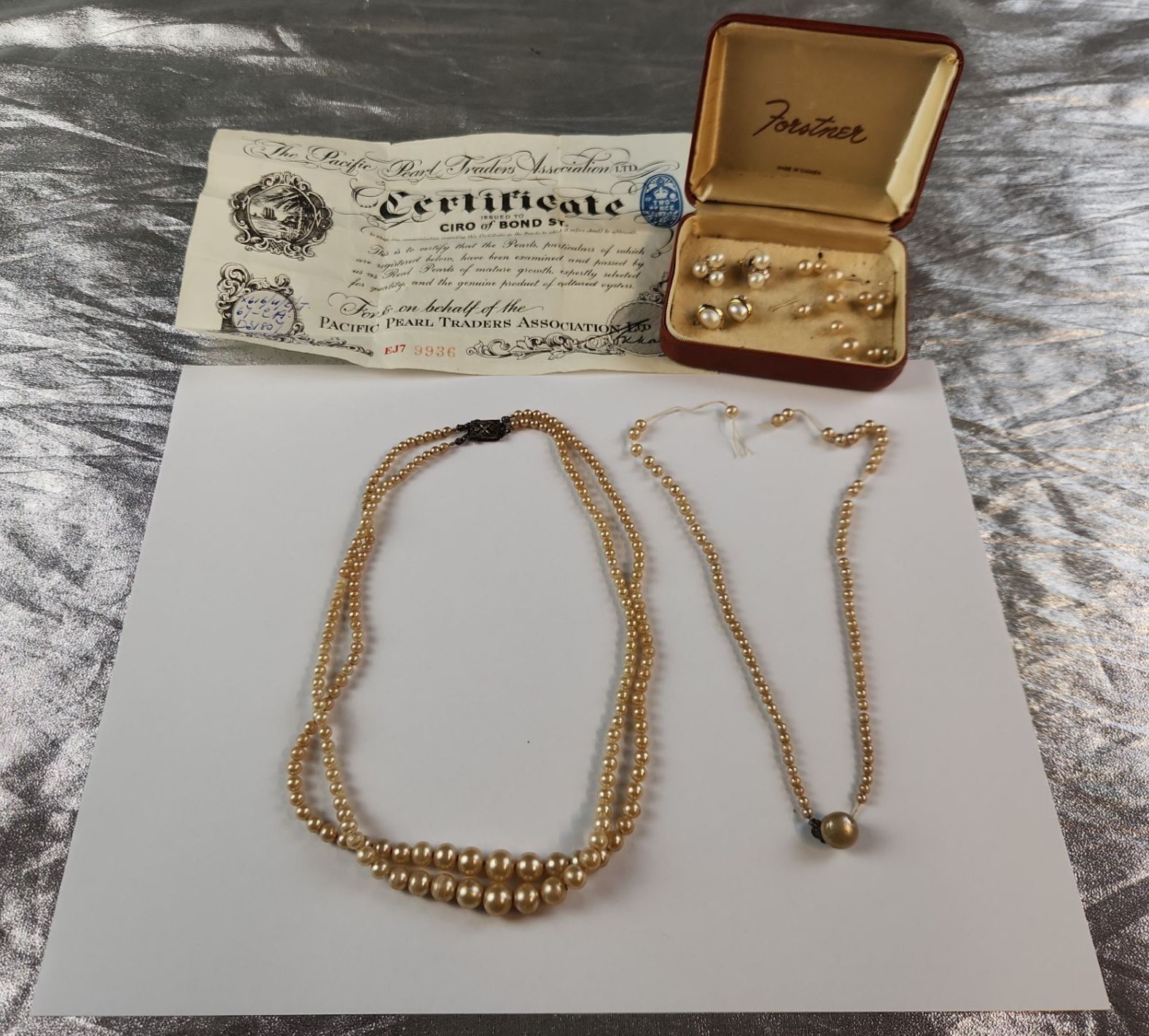 The set contains a double-strand necklace, a single-strand necklace, all cultured pearls. The included certificate confirms the items are genuine cultured pearls, expertly selected and verified by the association. Visible damage due to age. The stud pearl earrings are designer costume accessories