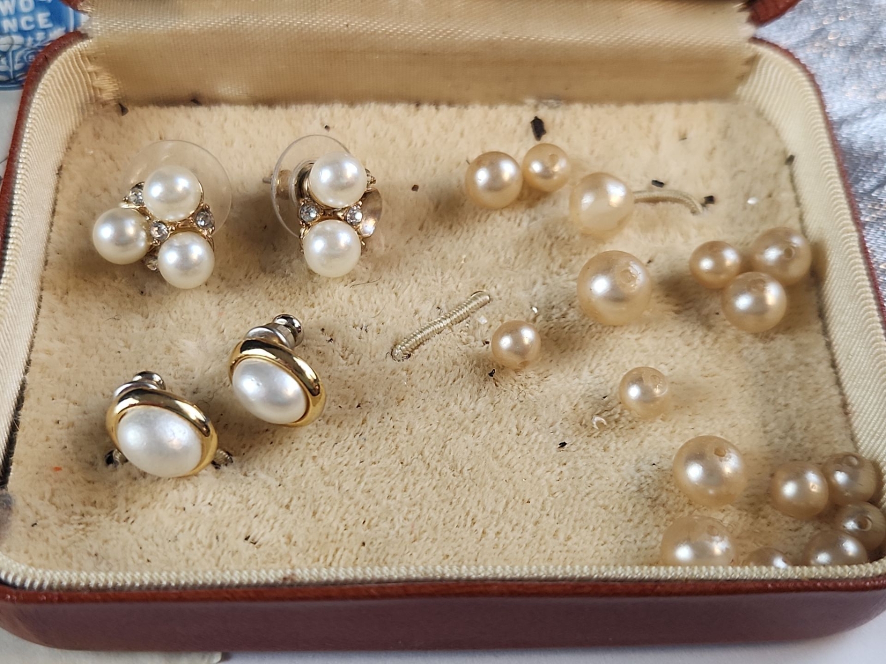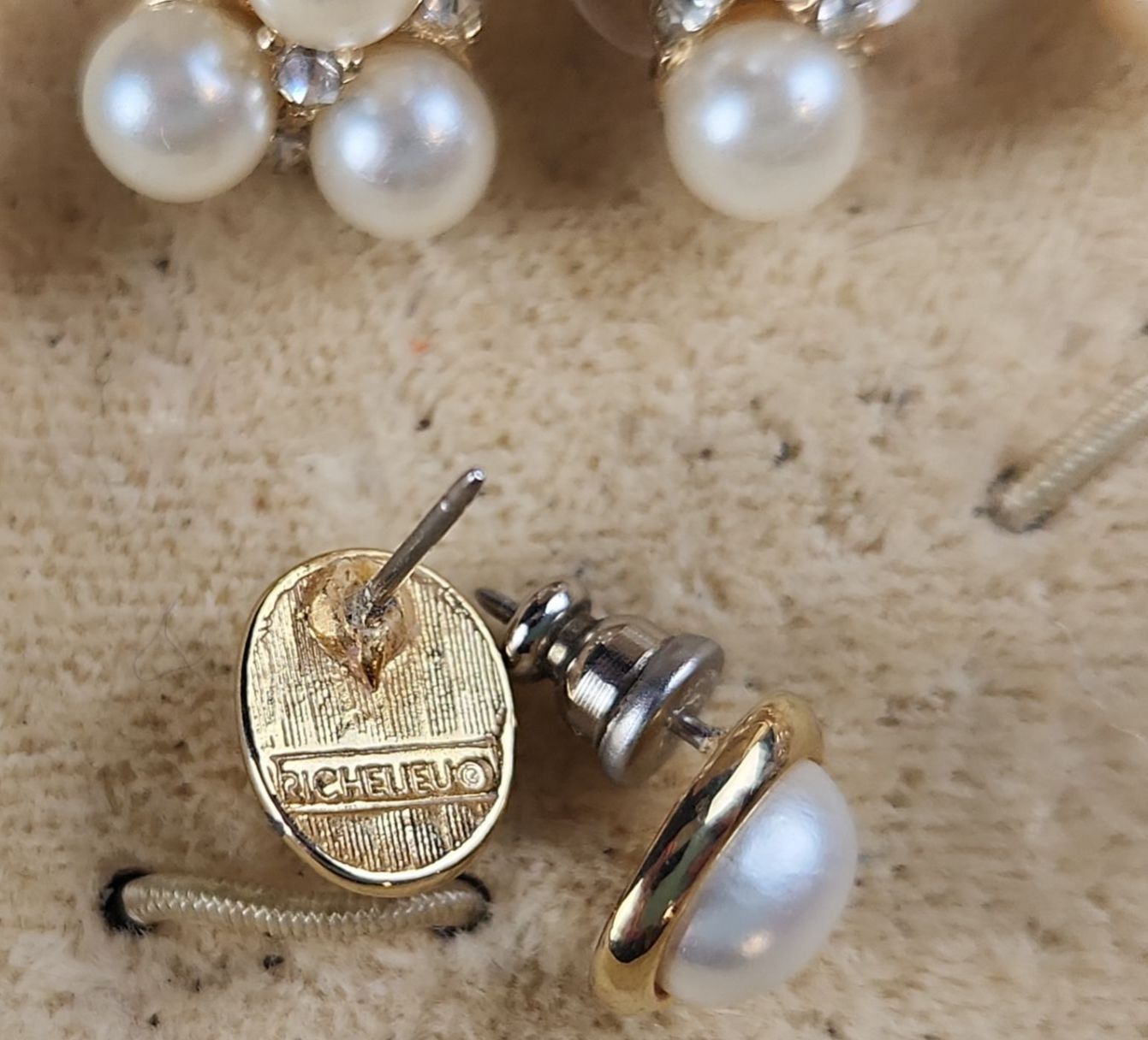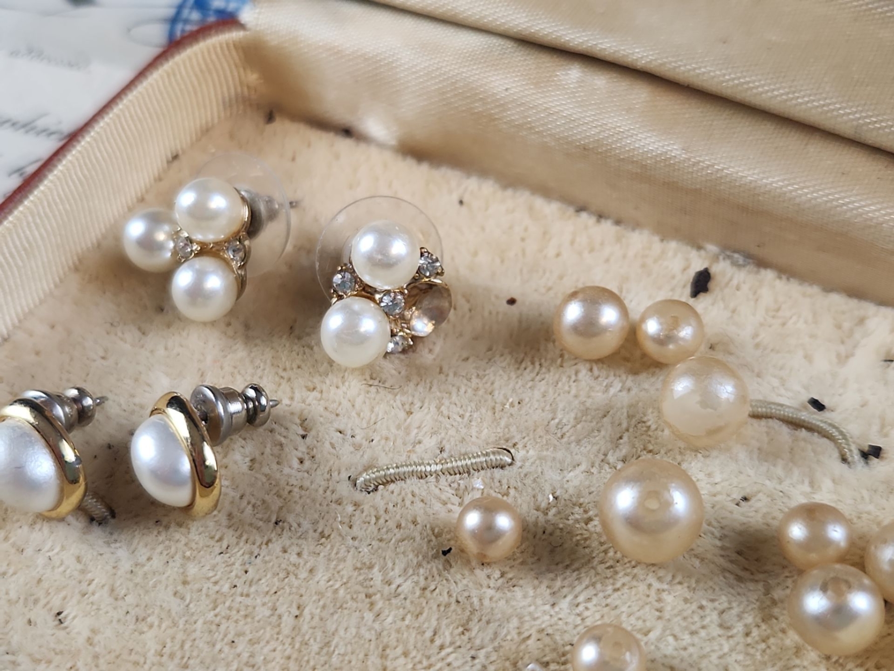 The set contains a double-strand necklace, a single-strand necklace, all cultured pearls. The included certificate confirms the items are genuine cultured pearls, expertly selected and verified by the association. Visible damage due to age. The stud pearl earrings are designer costume accessories