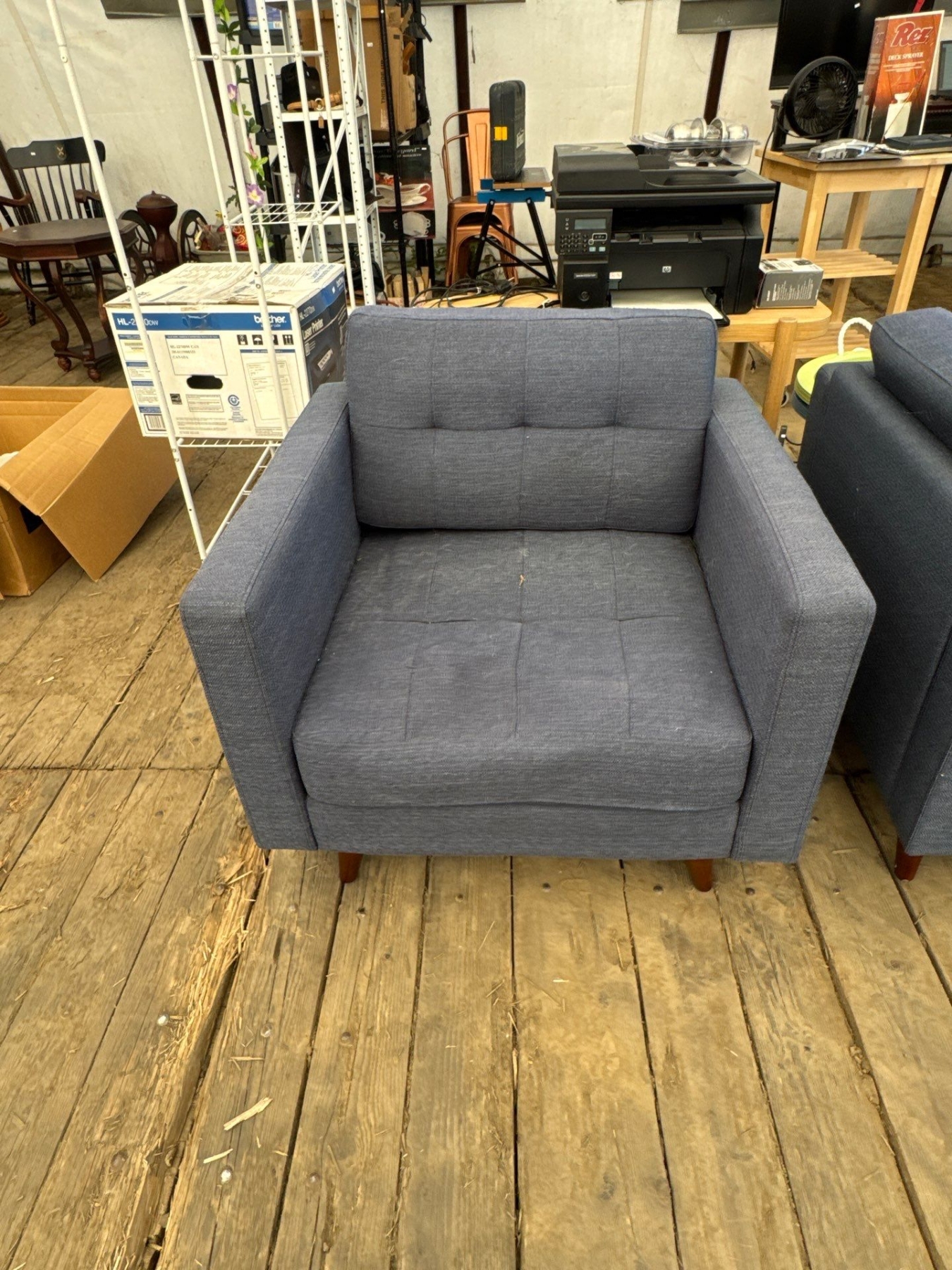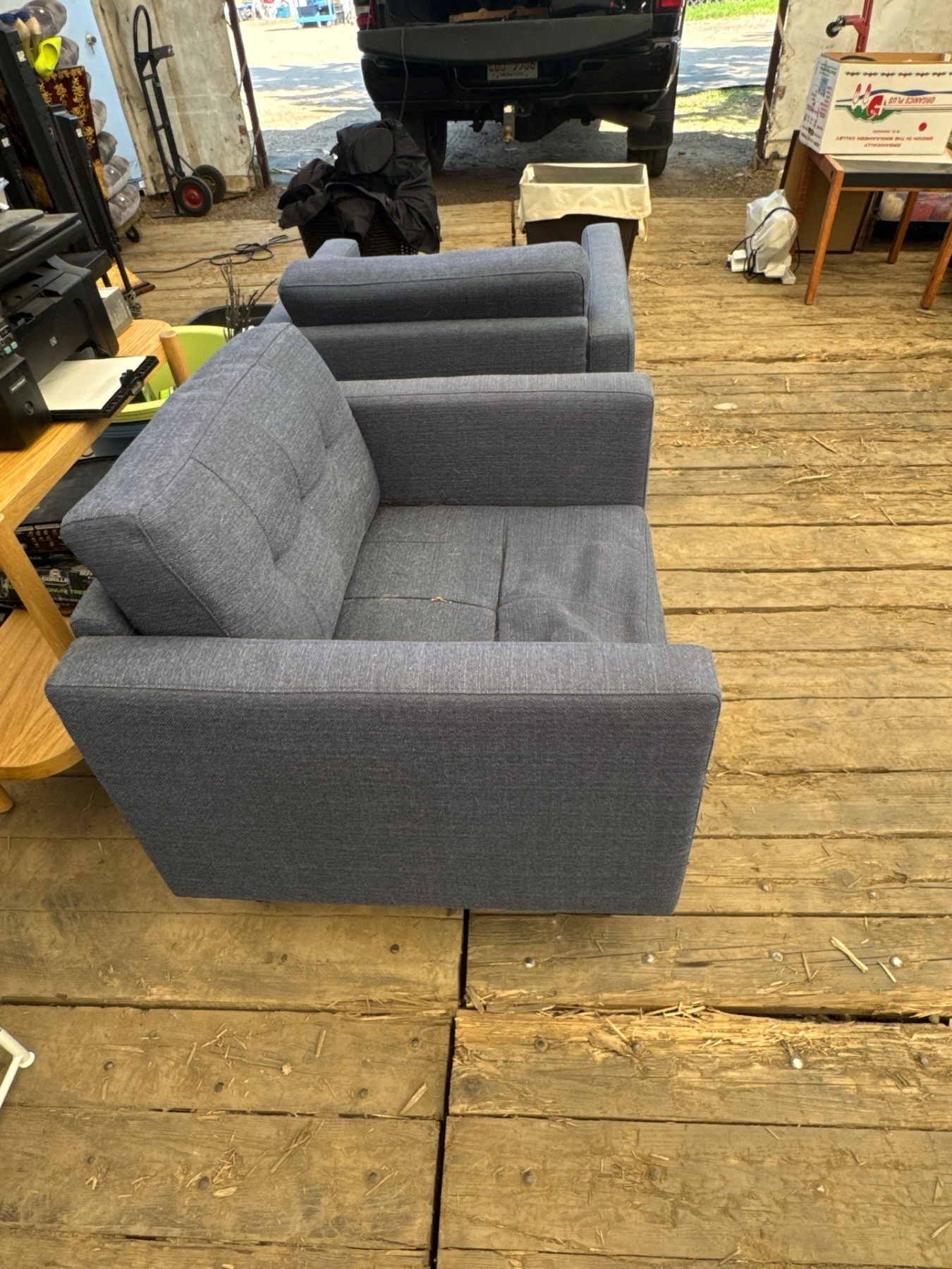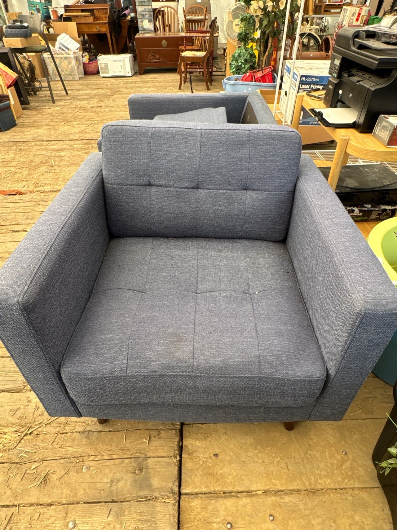 2 blue living room chairs one with slight wear and one brand new L31"32w 29h