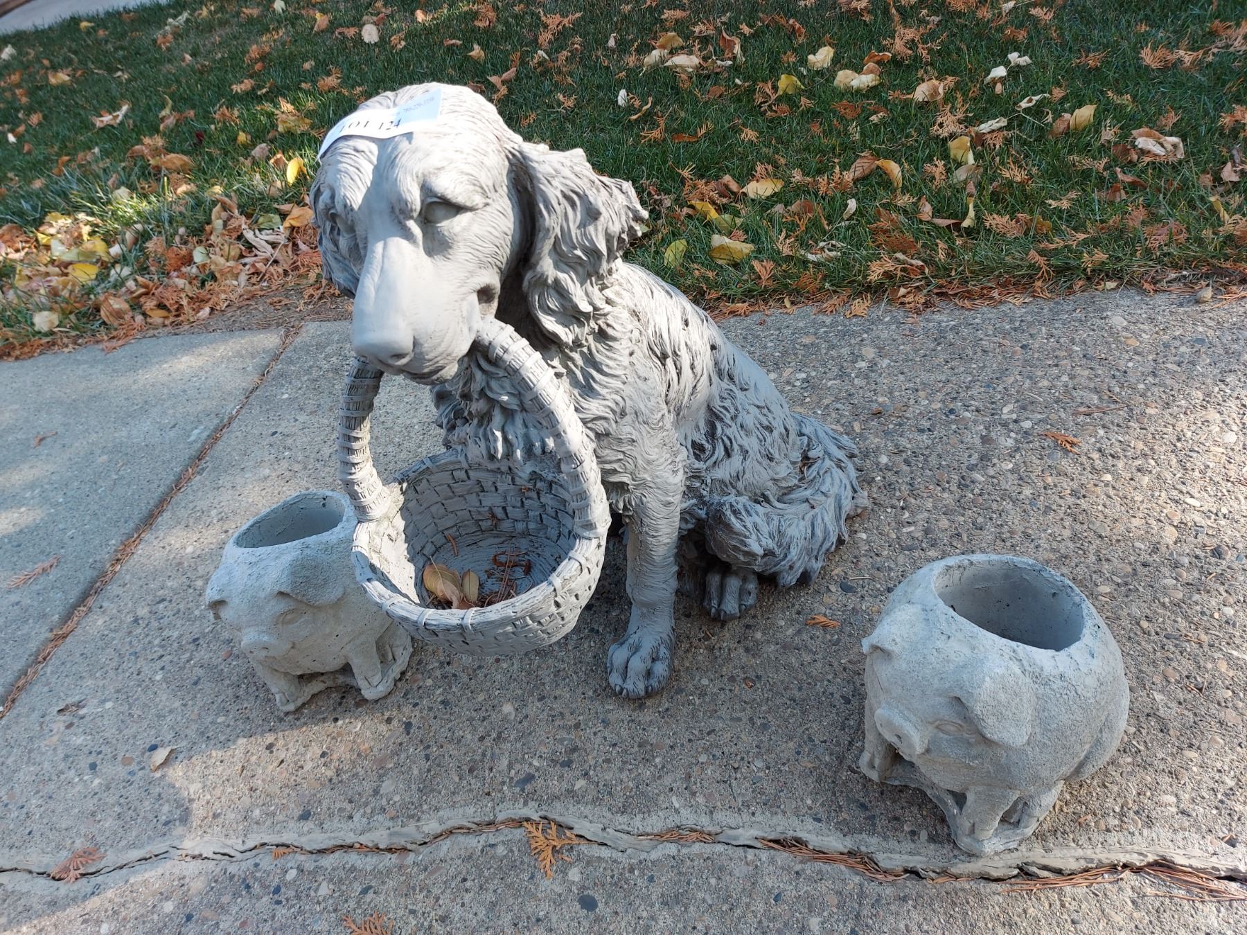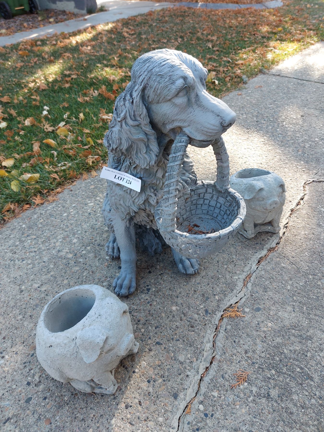 3 concrete pig planters, plastic dog (retriever) with basket figure