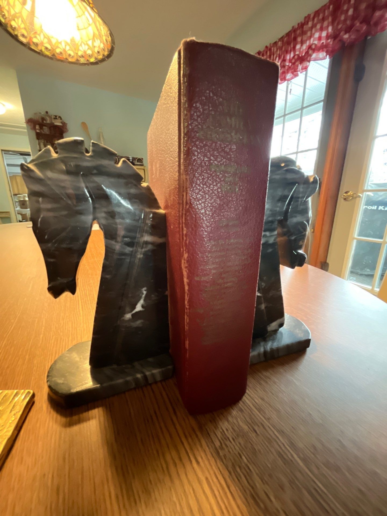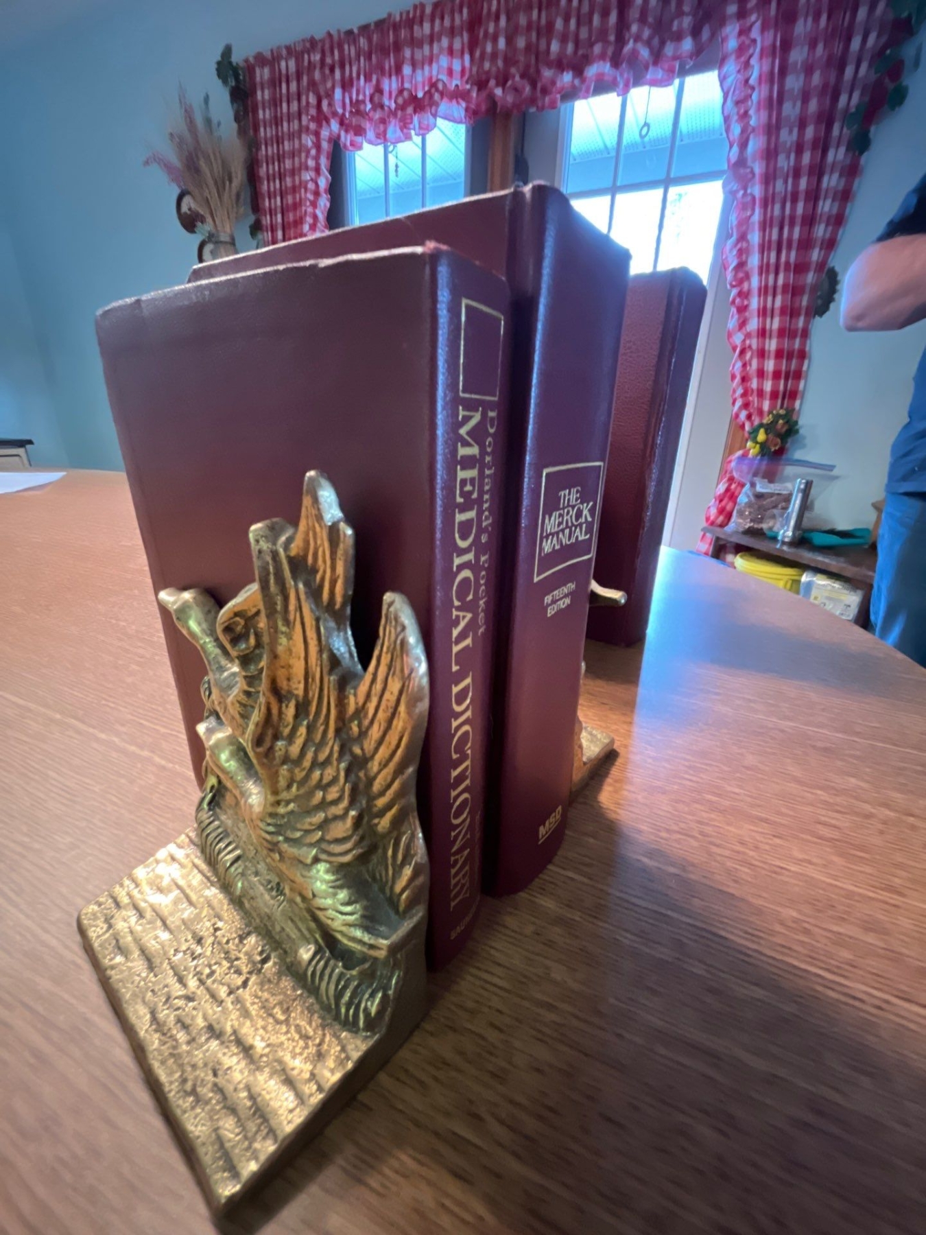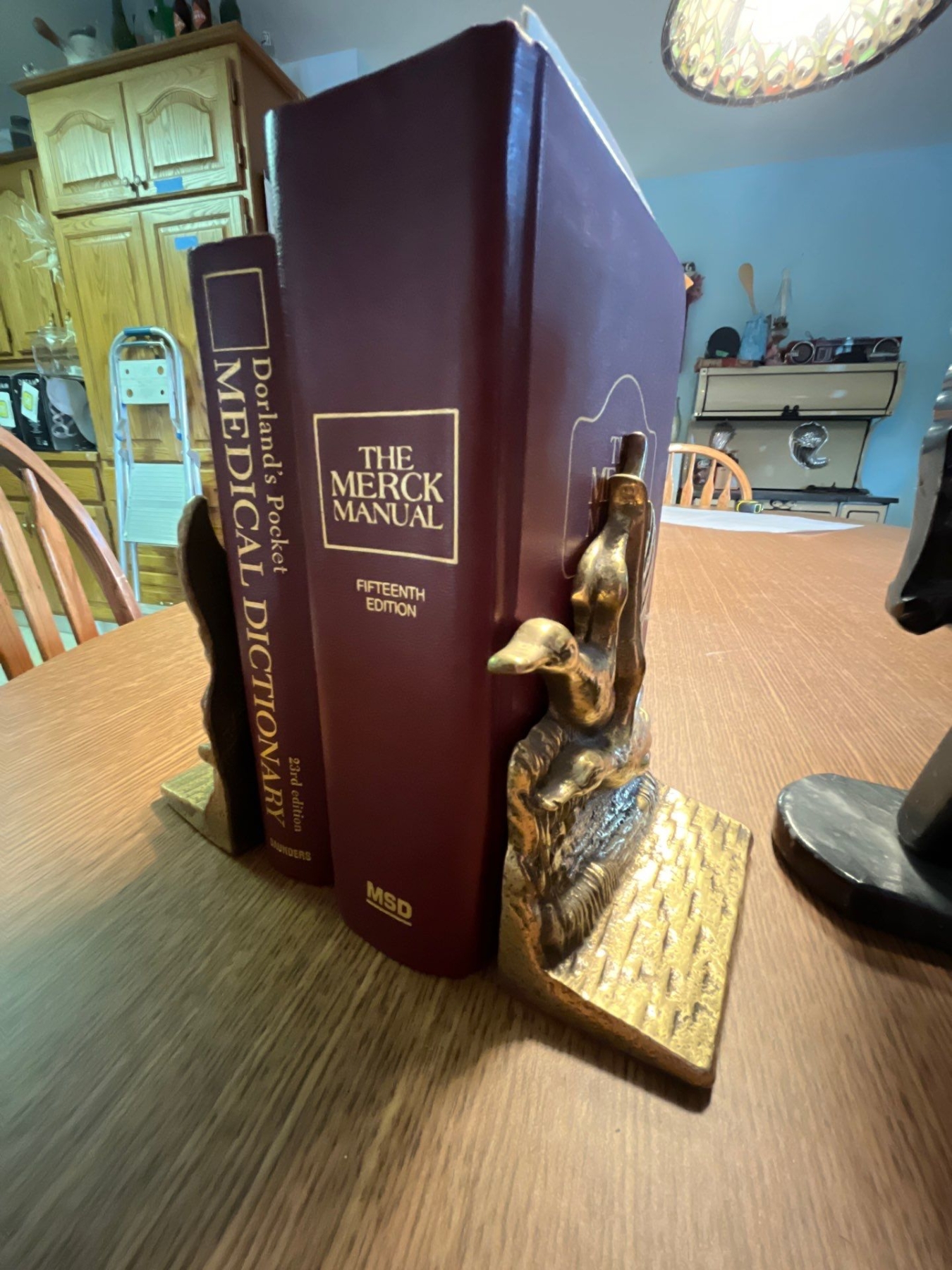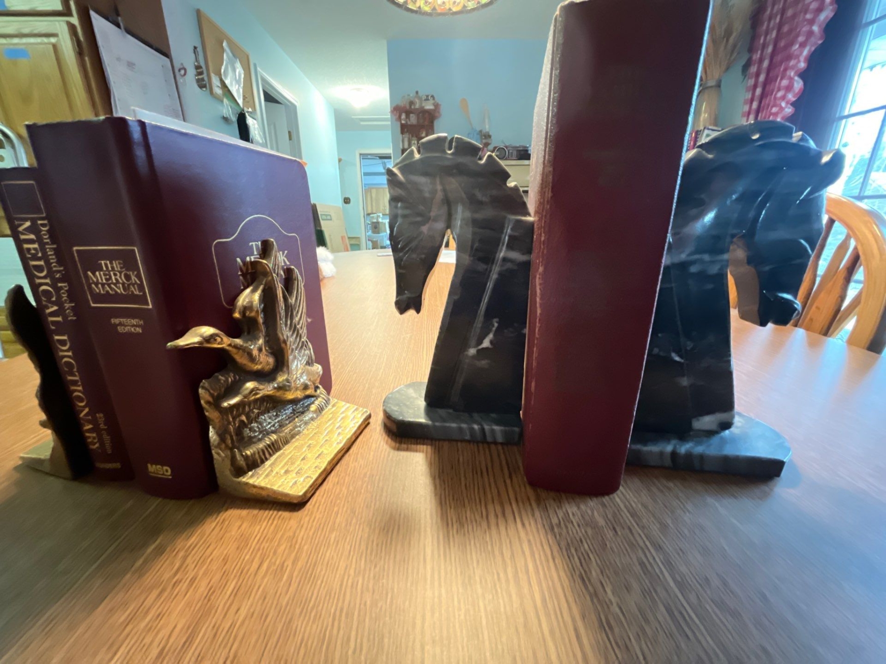 2 sets of bookends one are marble horses the other set is solid brass with ducks made in Canada with three books
