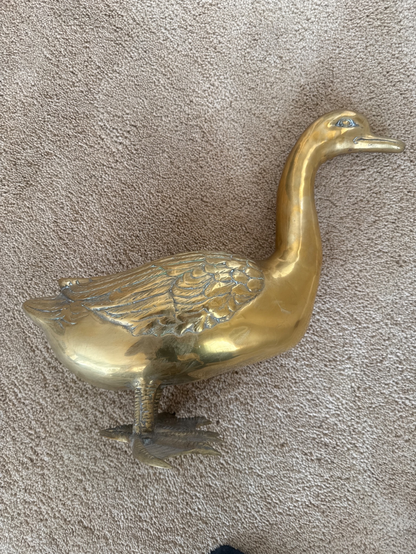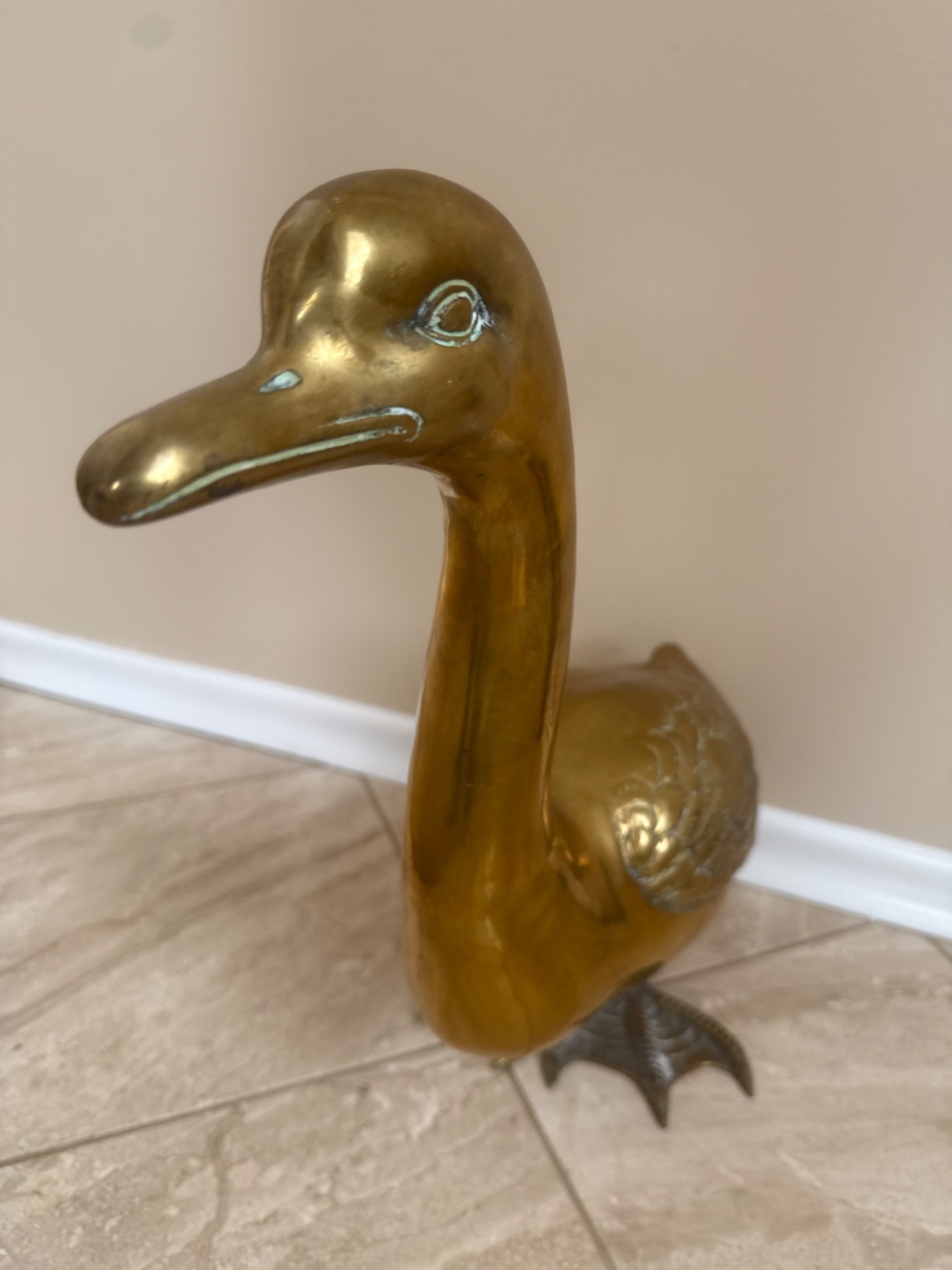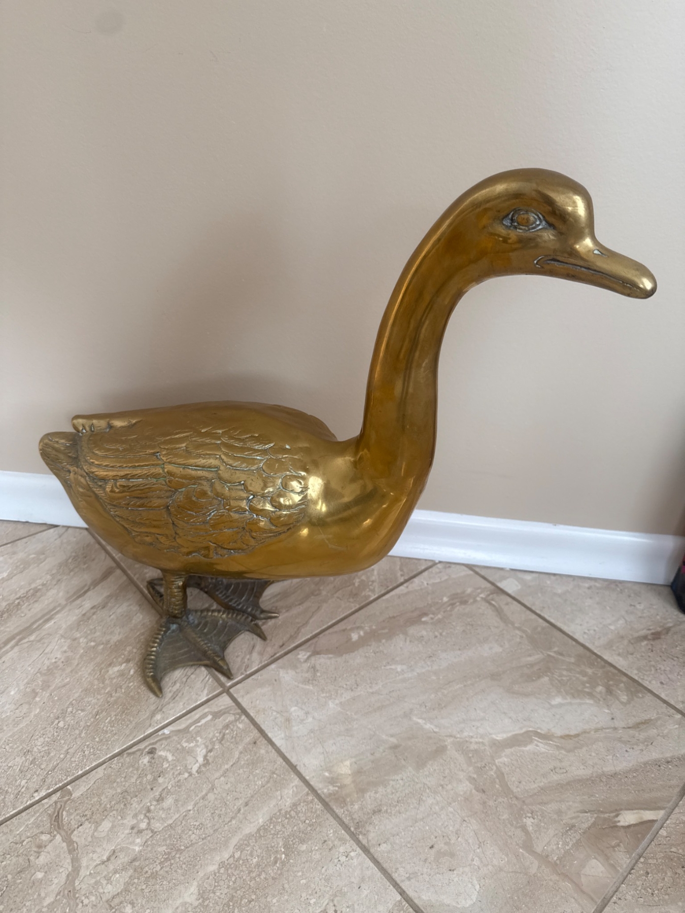 A striking brass bird statue standing 20 inches tall, showcasing detailed craftsmanship. The sculpture features textured wings, a smooth polished finish, and a lifelike stance, making it an exceptional decorative piece. Its sturdy brass construction ensures durability and timeless charm, perfect for enhancing an interior space or garden.