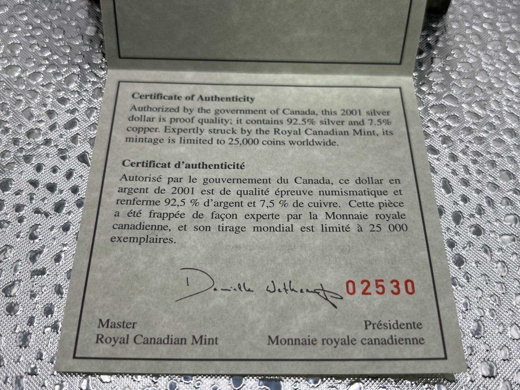 2001 Canadian 1911 Proof Silver Dollar 25.175g 92.5% Silver
