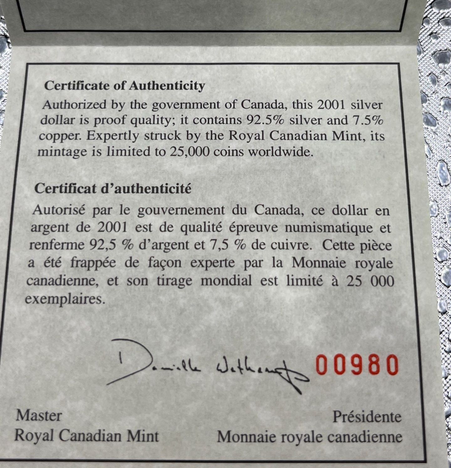 2001 Canadian 1911 Proof Silver Dollar 25.175g 92.5% Silver