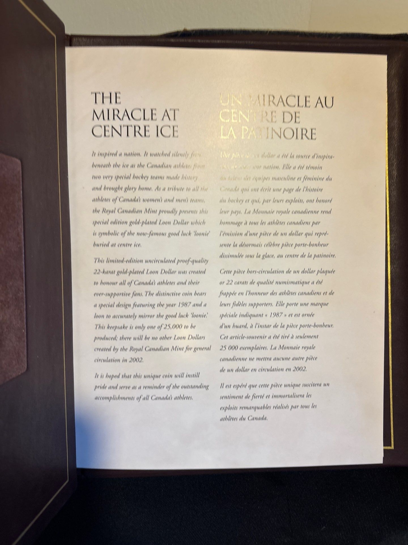 2002 THE MIRACLE AT CENTRE ICE LOONIE AND STAMP SET