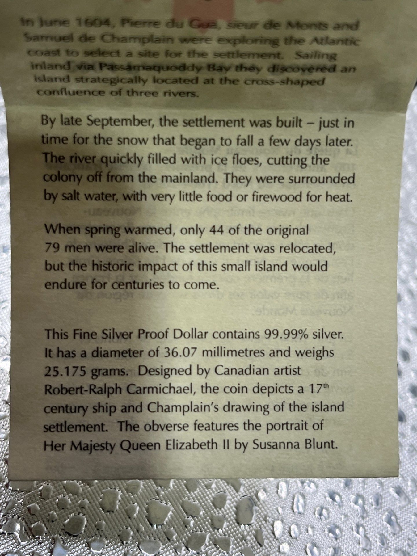 2004 Canadian 400th Anniversary of the First French Settlement  25.175g 99.99% Silver