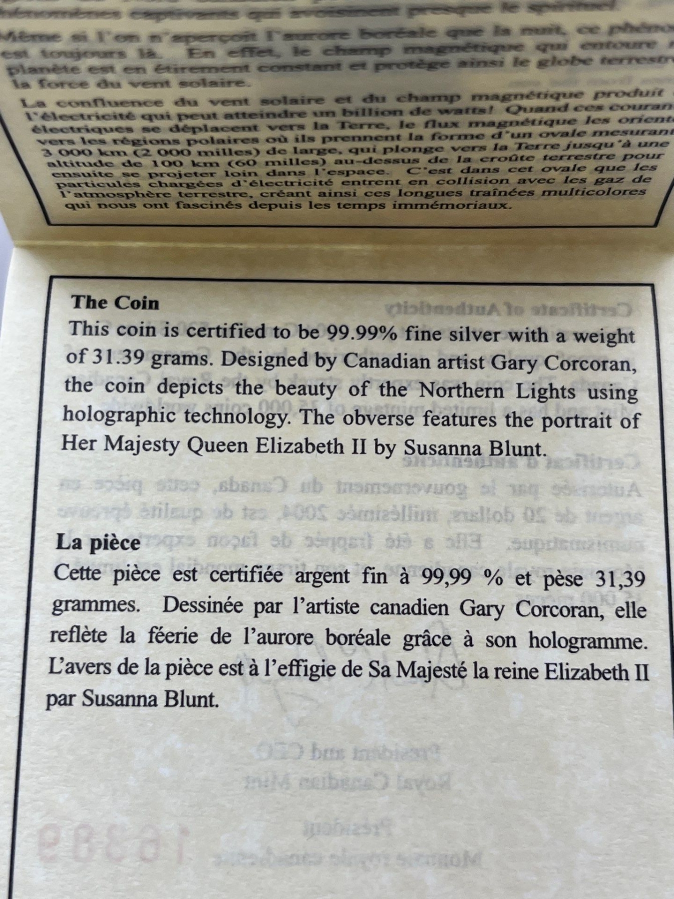 2004 Canadian Natural Wonders Aurora Borealis $20 Dollar Coin 31.39g 99.99% silver
