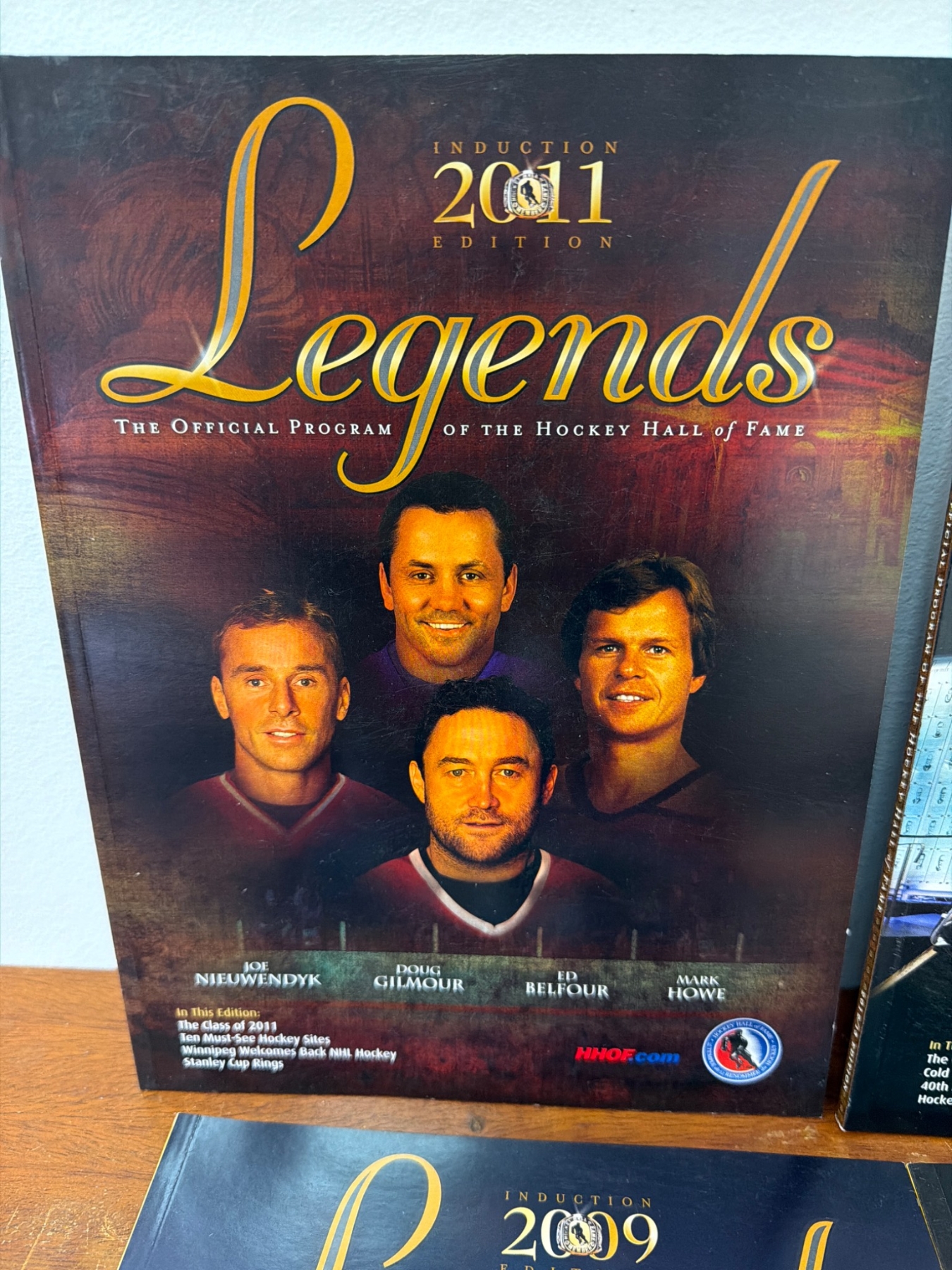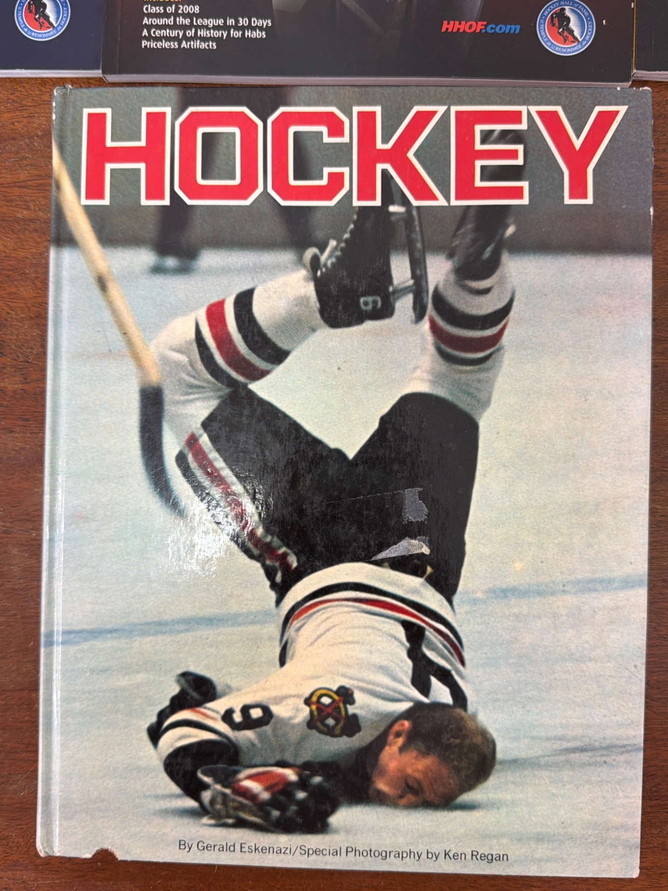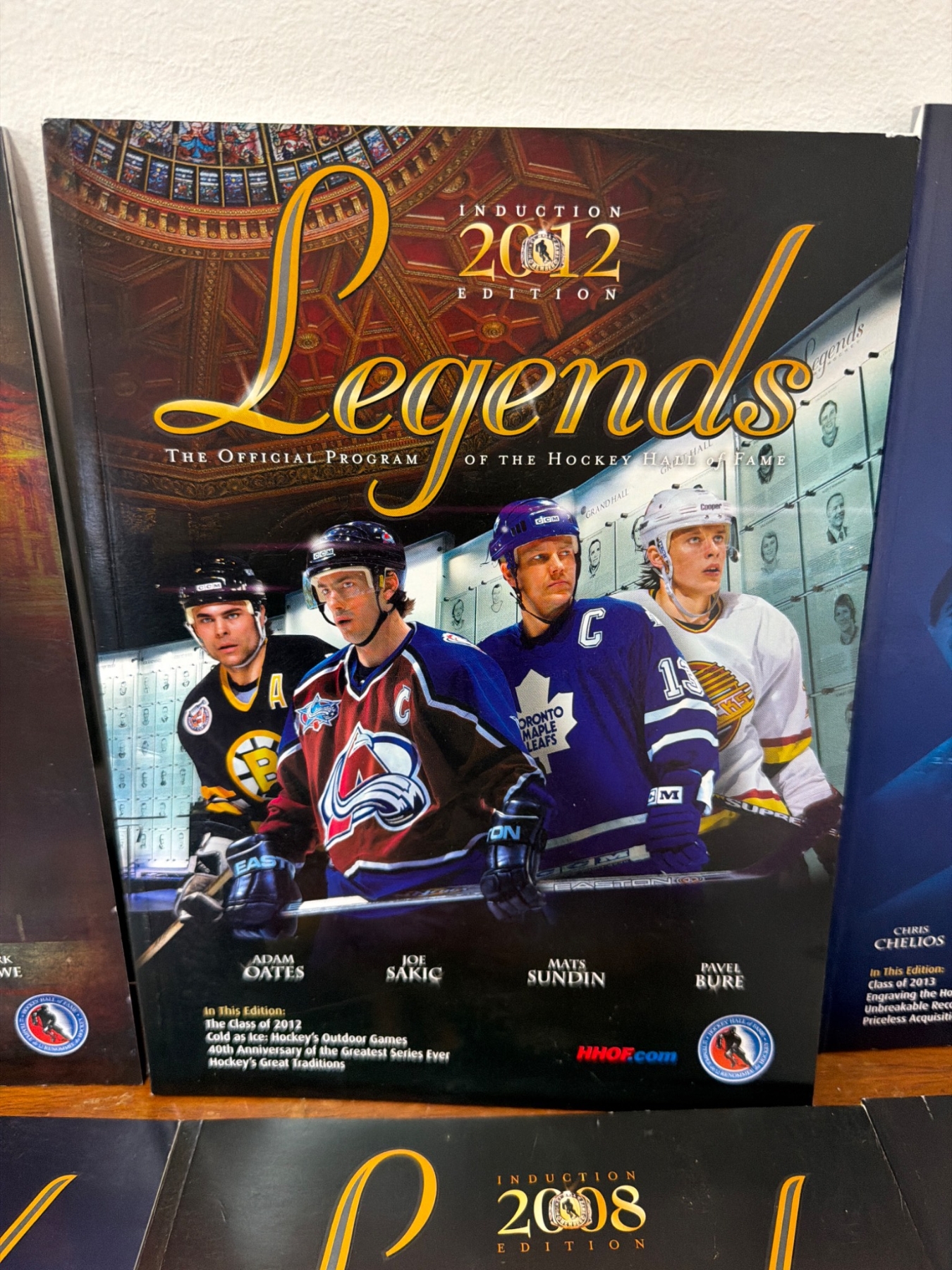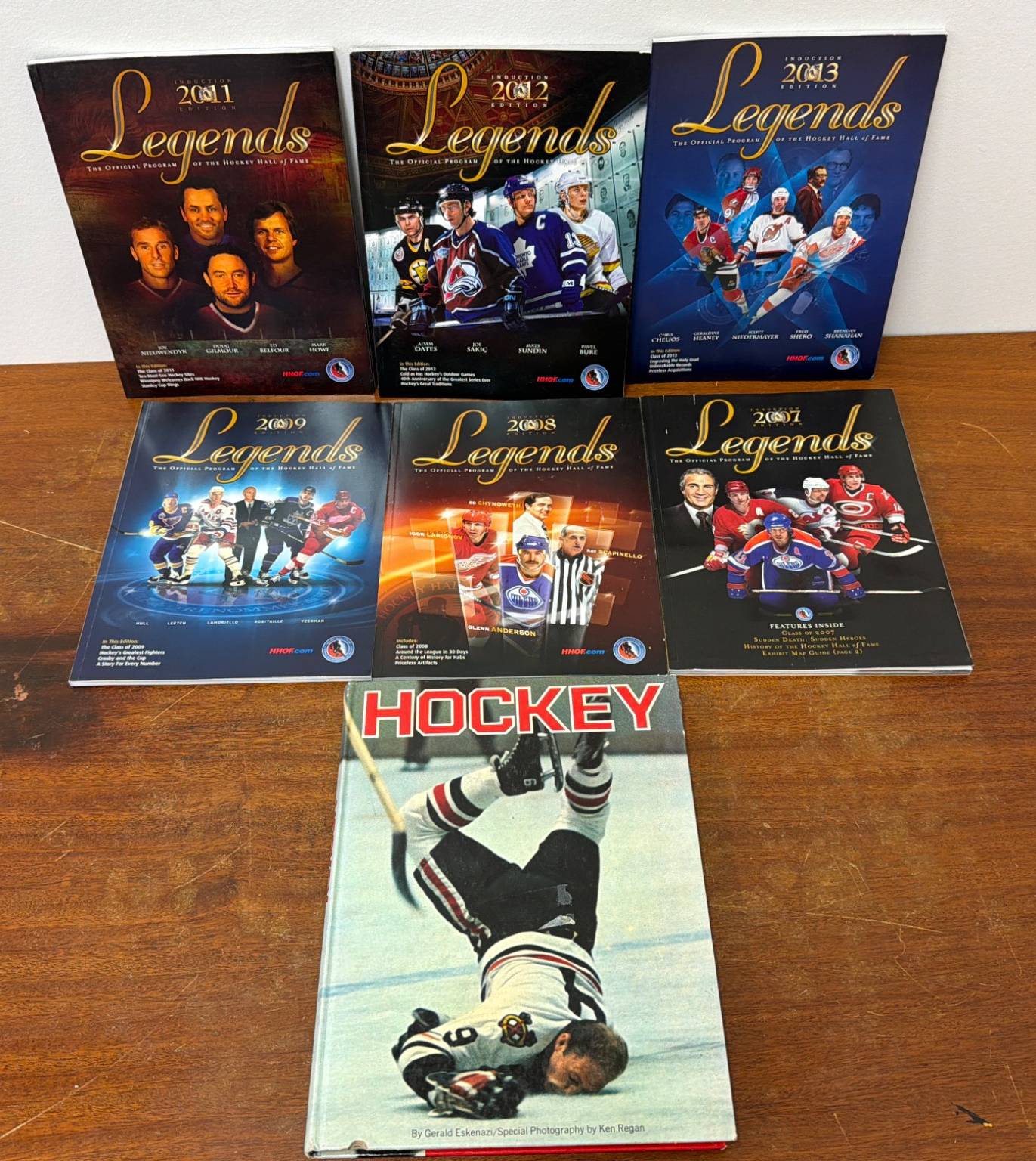 Six official Hockey Hall of Fame 'Legends' induction programs from editions 2007, 2008, 2009, 2011, 2012, and 2013. Each program highlights notable players, inductees, and articles relevant to their year. Included is a hardcover book titled 'Hockey' by Gerald Eskenazi with special photography by Ken Regan, featuring historical insights and action-packed imagery. All items appear in good collectible condition.