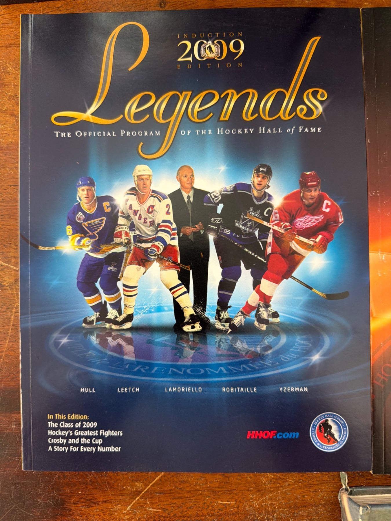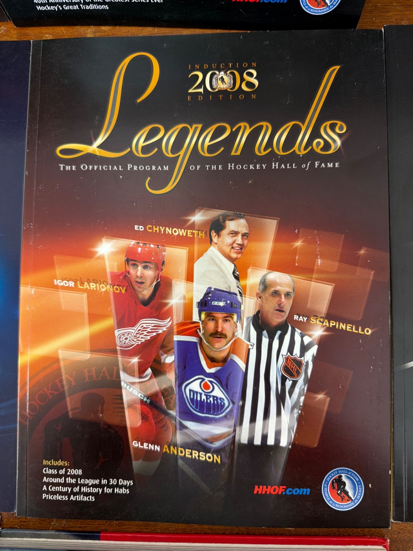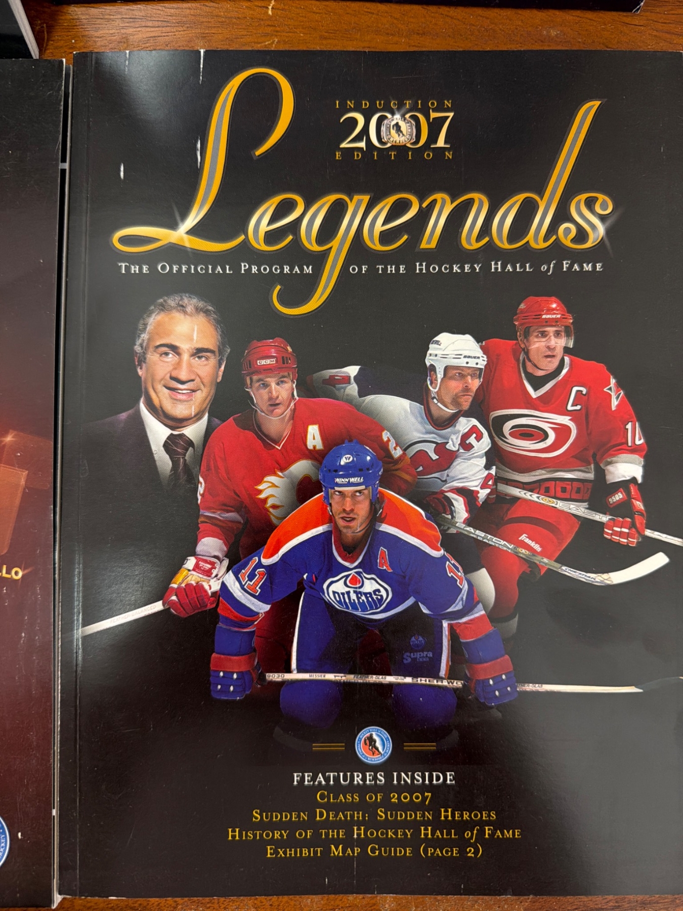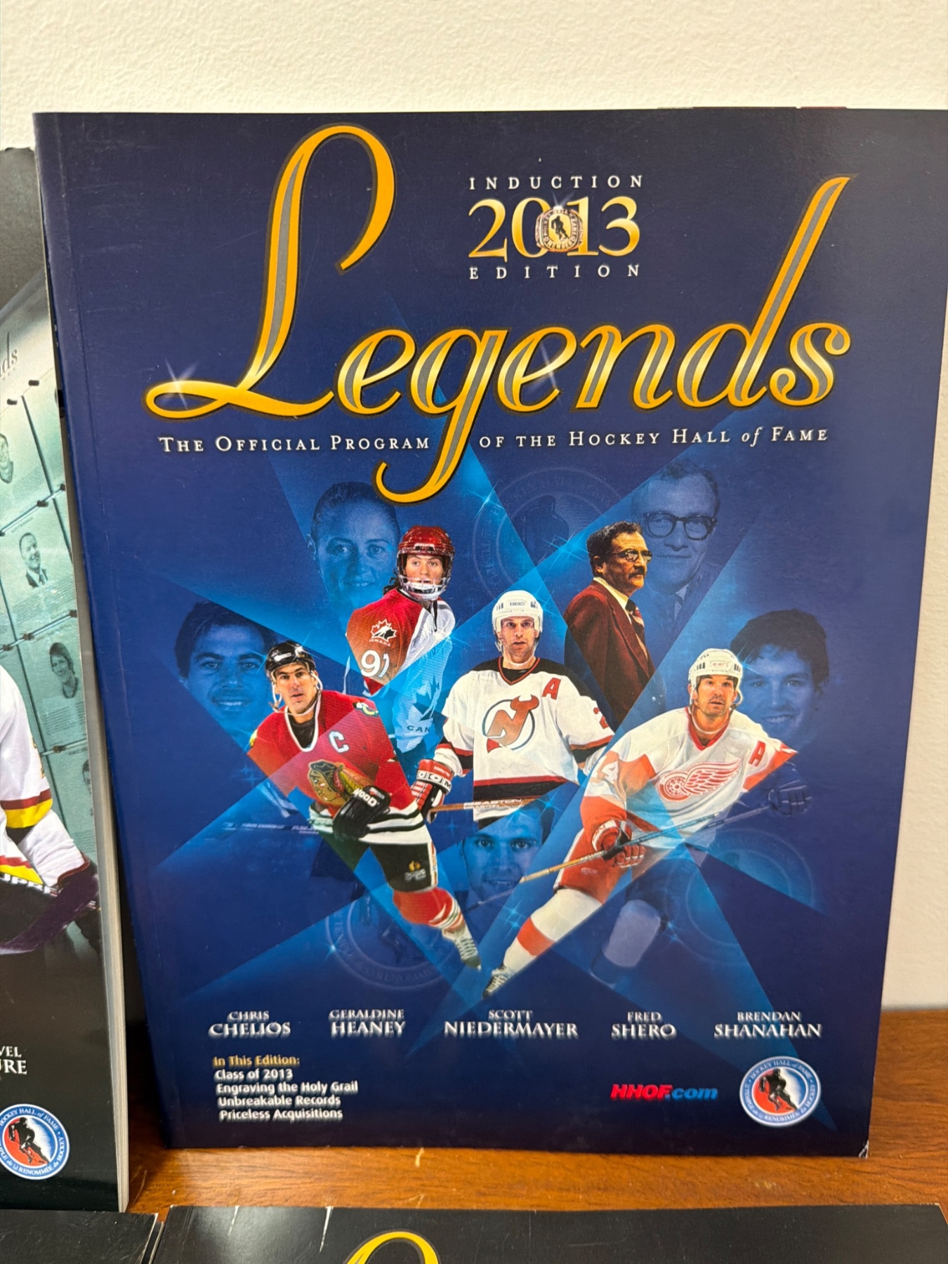 Six official Hockey Hall of Fame 'Legends' induction programs from editions 2007, 2008, 2009, 2011, 2012, and 2013. Each program highlights notable players, inductees, and articles relevant to their year. Included is a hardcover book titled 'Hockey' by Gerald Eskenazi with special photography by Ken Regan, featuring historical insights and action-packed imagery. All items appear in good collectible condition.