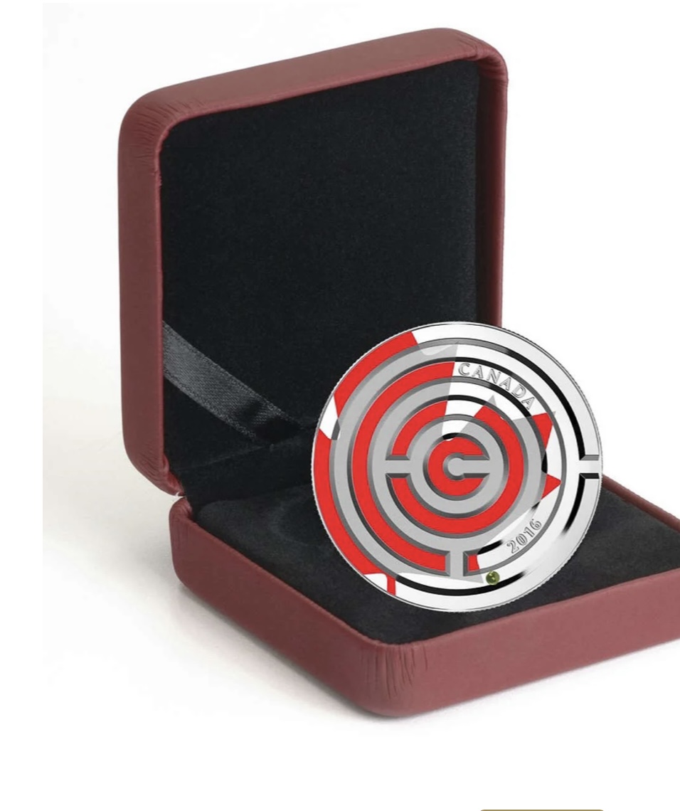 Reverse: A numismatic maze with red maple leaf in background