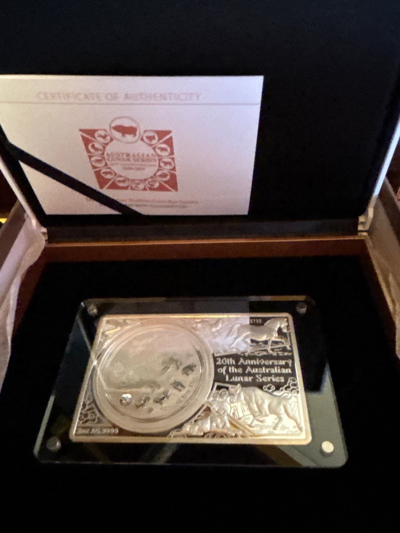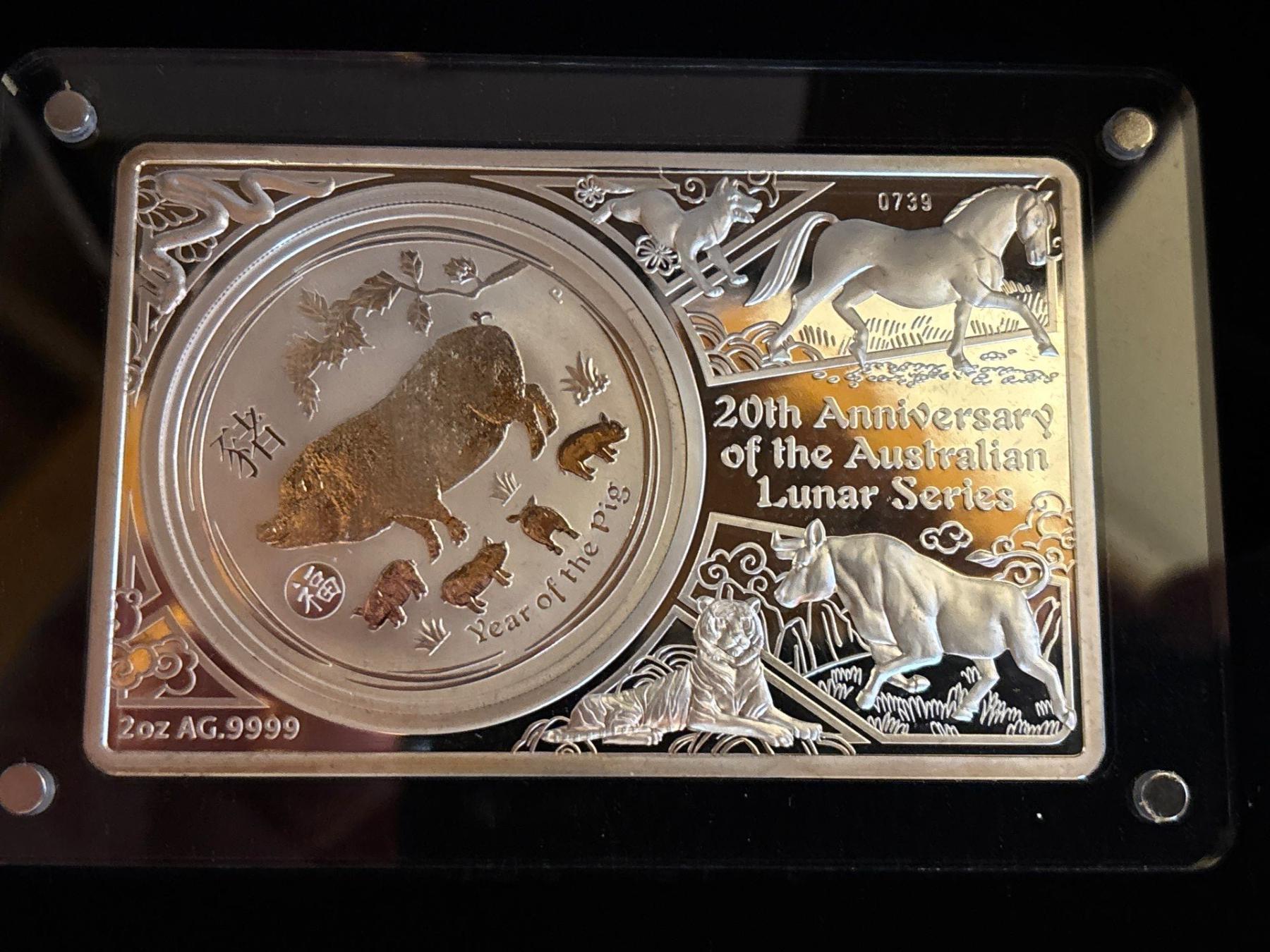 This premium commemorative set recognizes the 20th anniversary of the Australian Lunar Series issued by the Perth Mint. This coin and bar set includes a 2 oz. Silver bar holding the official 1 oz. 2019 Lunar Year of the Pig coin with fu privy mark.
