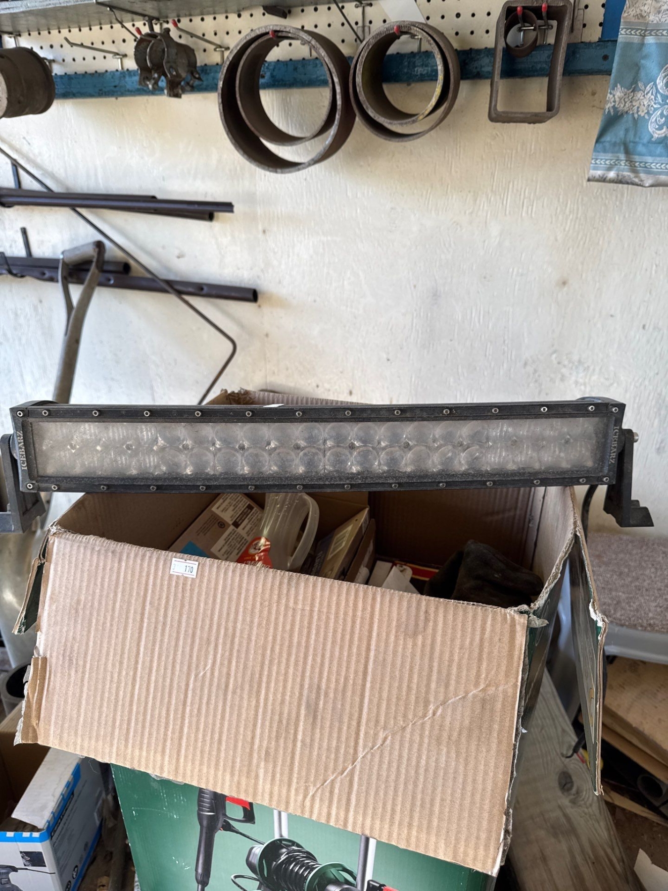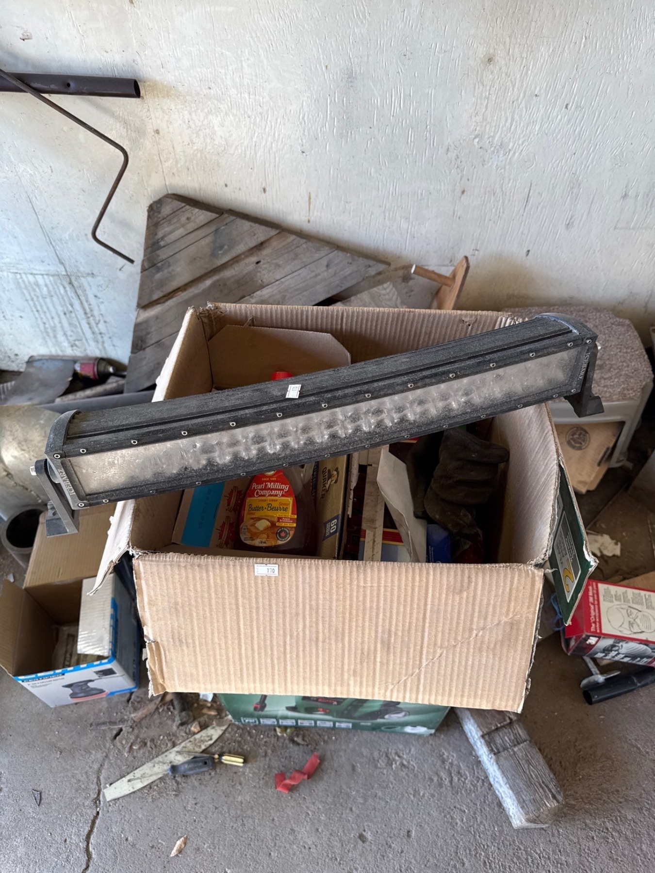 21 1/2 inch light bar works great box full of food miscellaneous wood shovel tubing, funnels random items. All items in pile included.