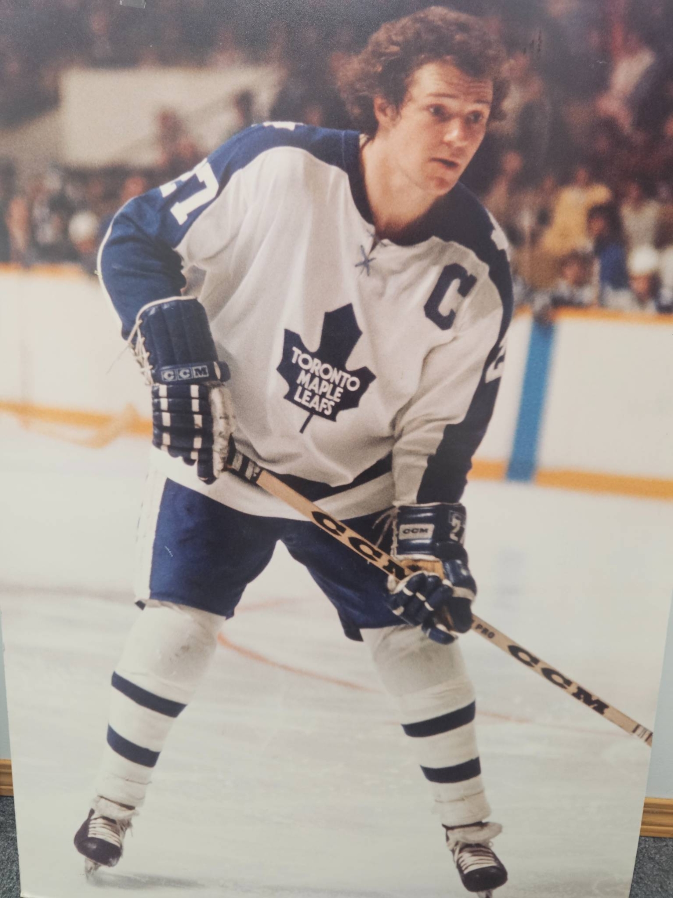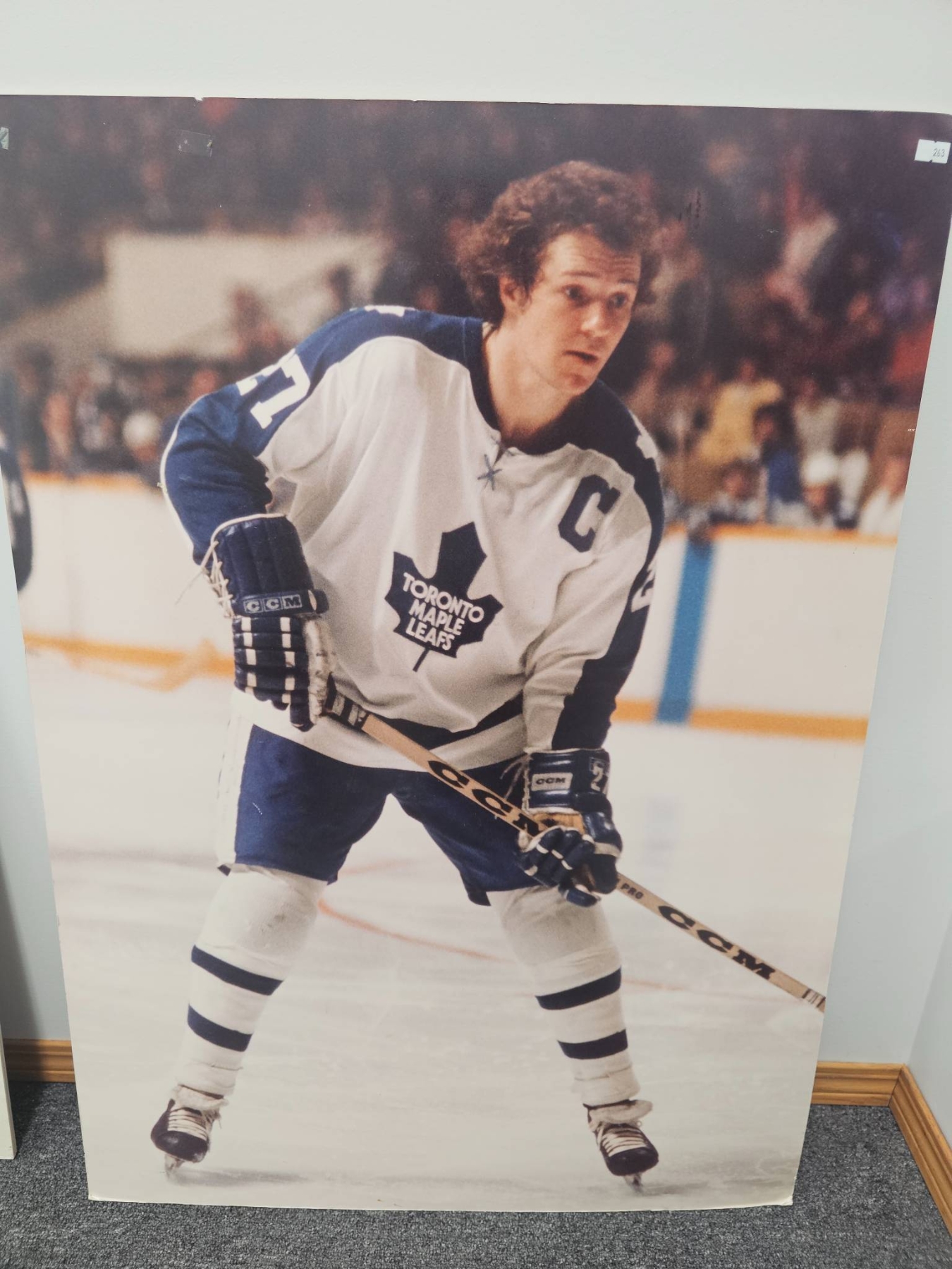 Large 26x36 poster featuring a Toronto Maple Leafs hockey player in focus during a game. The striking pose showcases the team's iconic jersey and on-ice determination. Ideal collectible for hockey enthusiasts, especially fans of the Maple Leafs, offering an engaging tribute to the team's rich legacy.