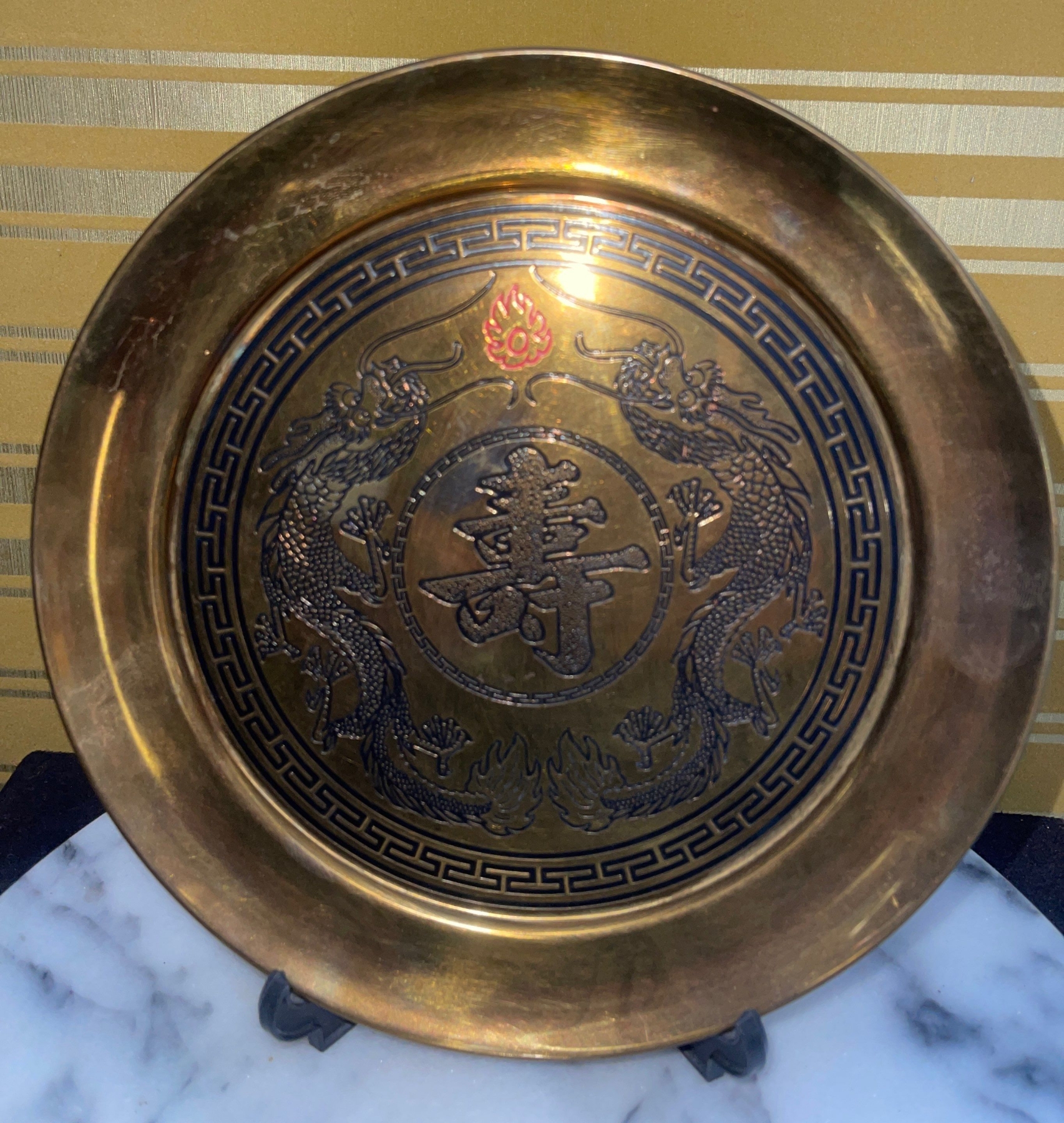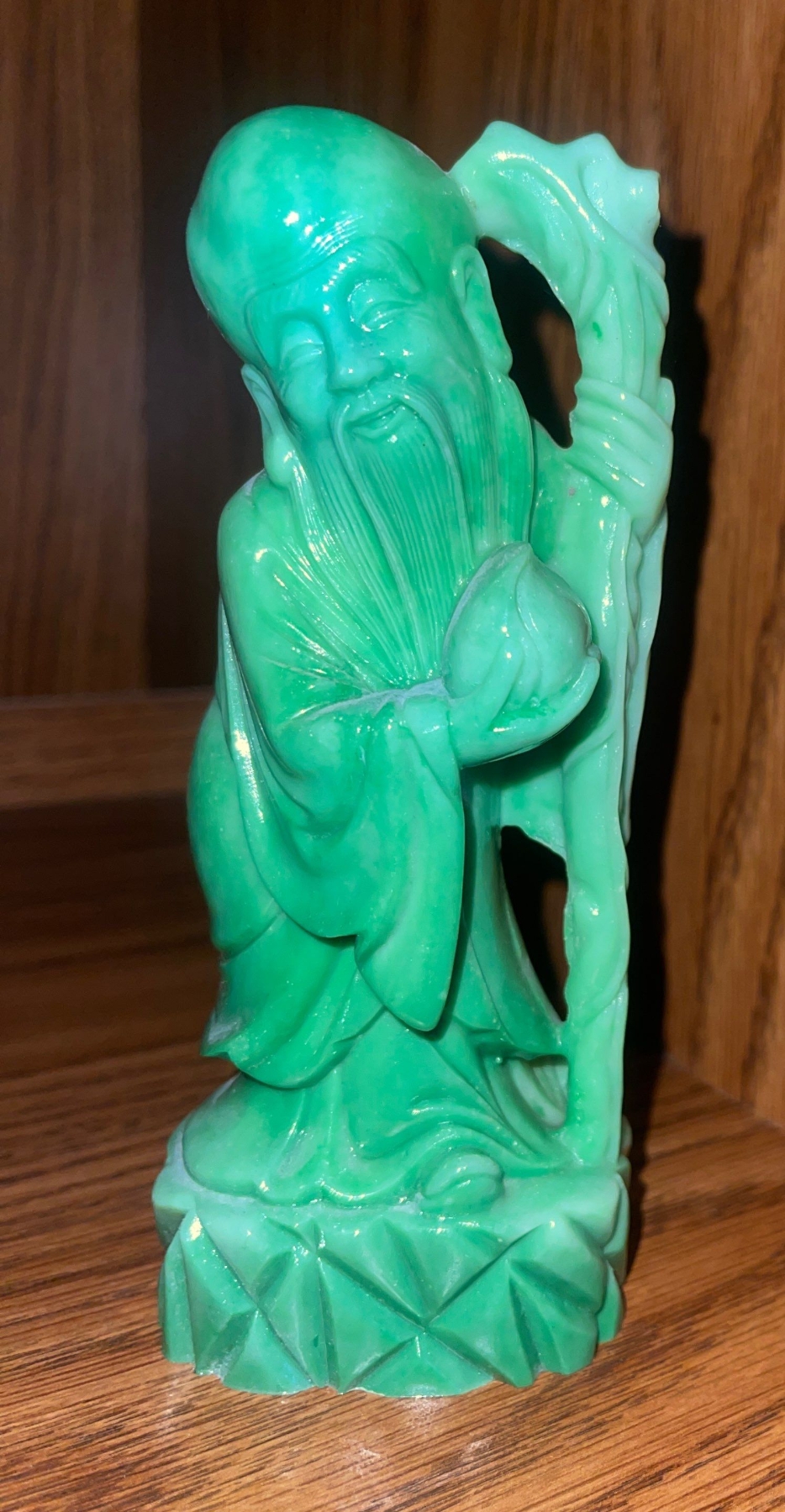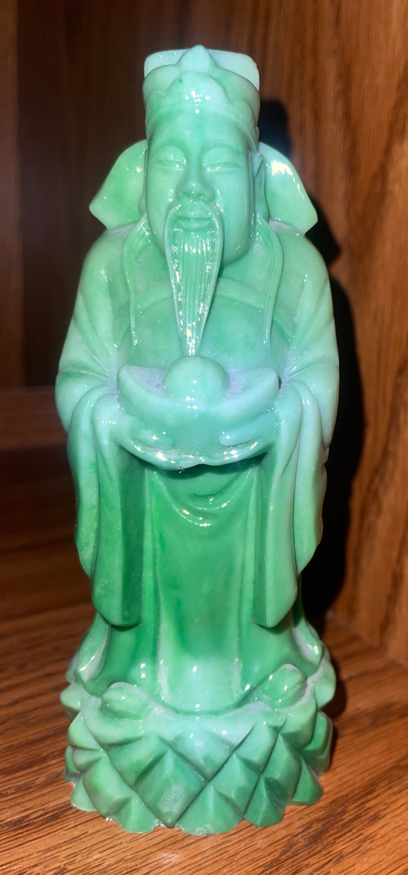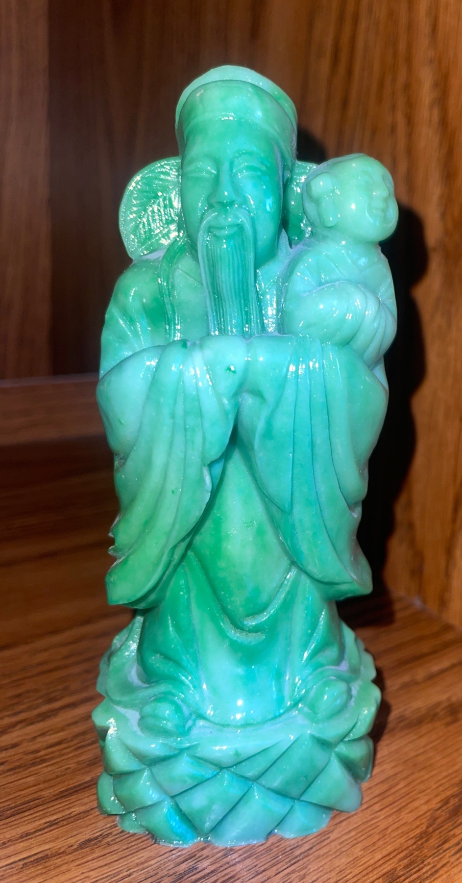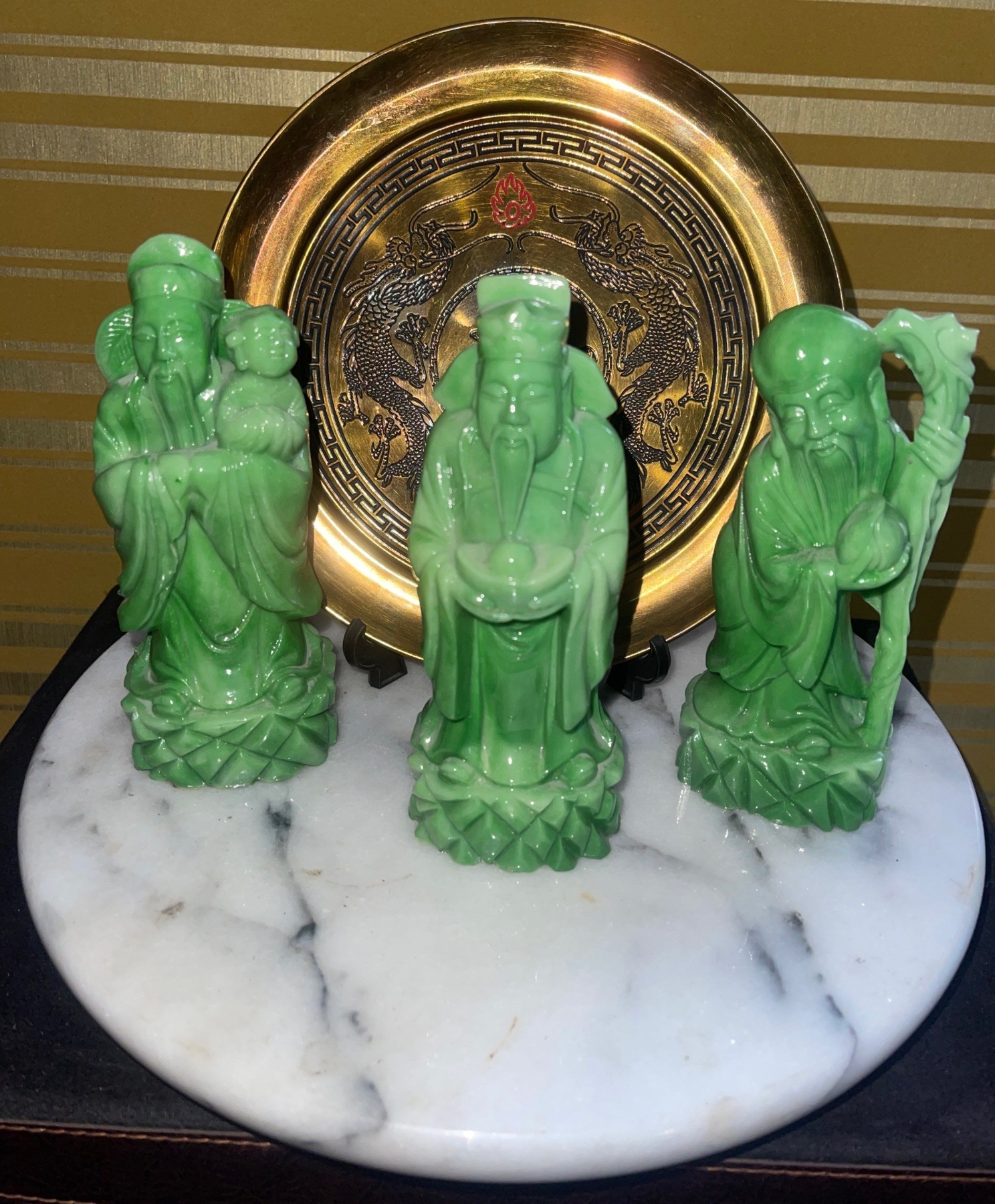 3 Faux Jade Sanxing Chinese Dieties 7T w/ Brass Plate From The Orient