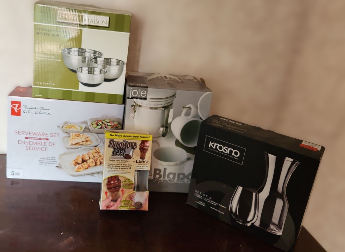 3 Pce Mixing Bowls, 5 Pce Stoneware Serveware, Coffee Cups/Canister Set, Furniture Feet, Wine Carafe