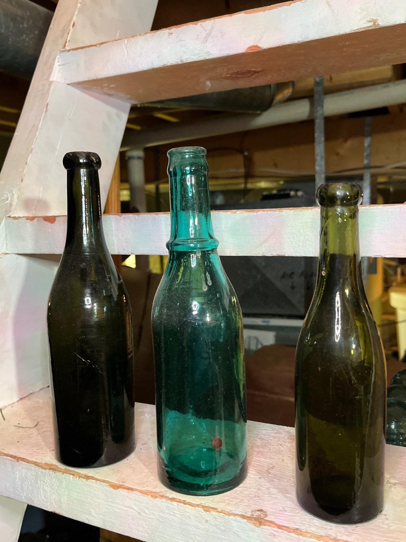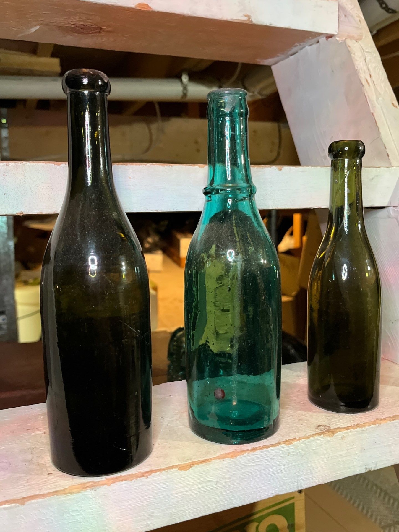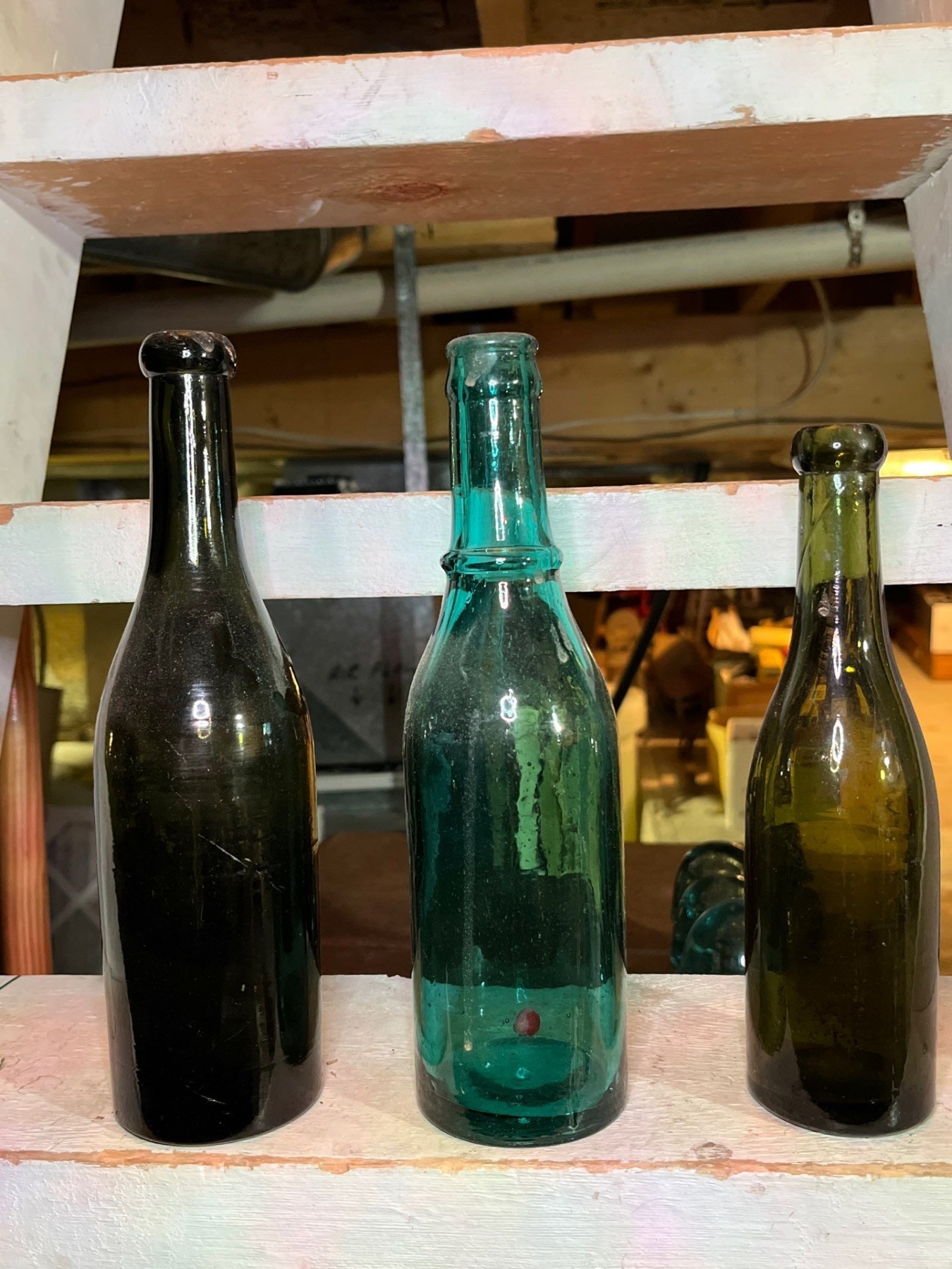 3 Rare antique, hand-blown teal glass bottle , antique green glass bottle, likely from the late 19th or early 20th century dark green, vintage-style glass bottle, sparkling wine or champagne bottle