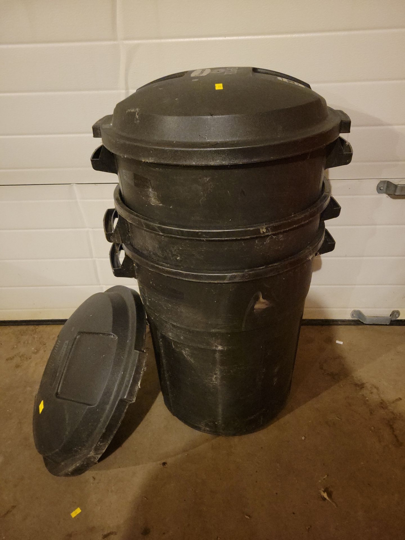 3 Rubbermaid Roughneck 20 Gallon Trash Bins w/ 2 Lids