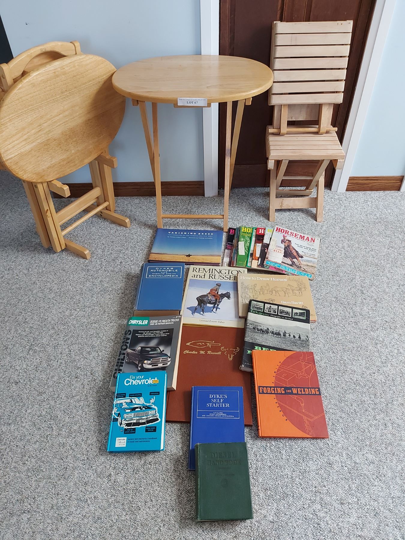 3 Wooden TV trays with stand, 2 wooden folding stools, asst books and magazines
