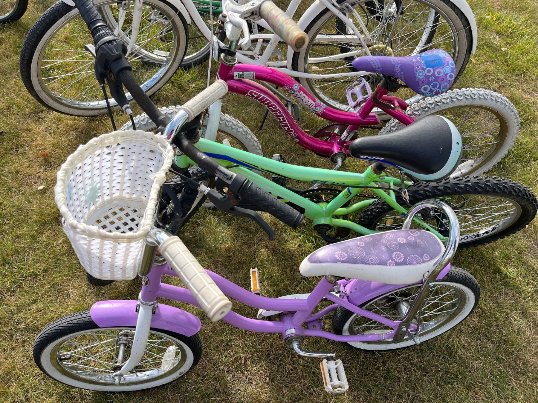 3 kids, bikes, pink supercycle, green CCM and pink girls bike with banana seat and front basket
