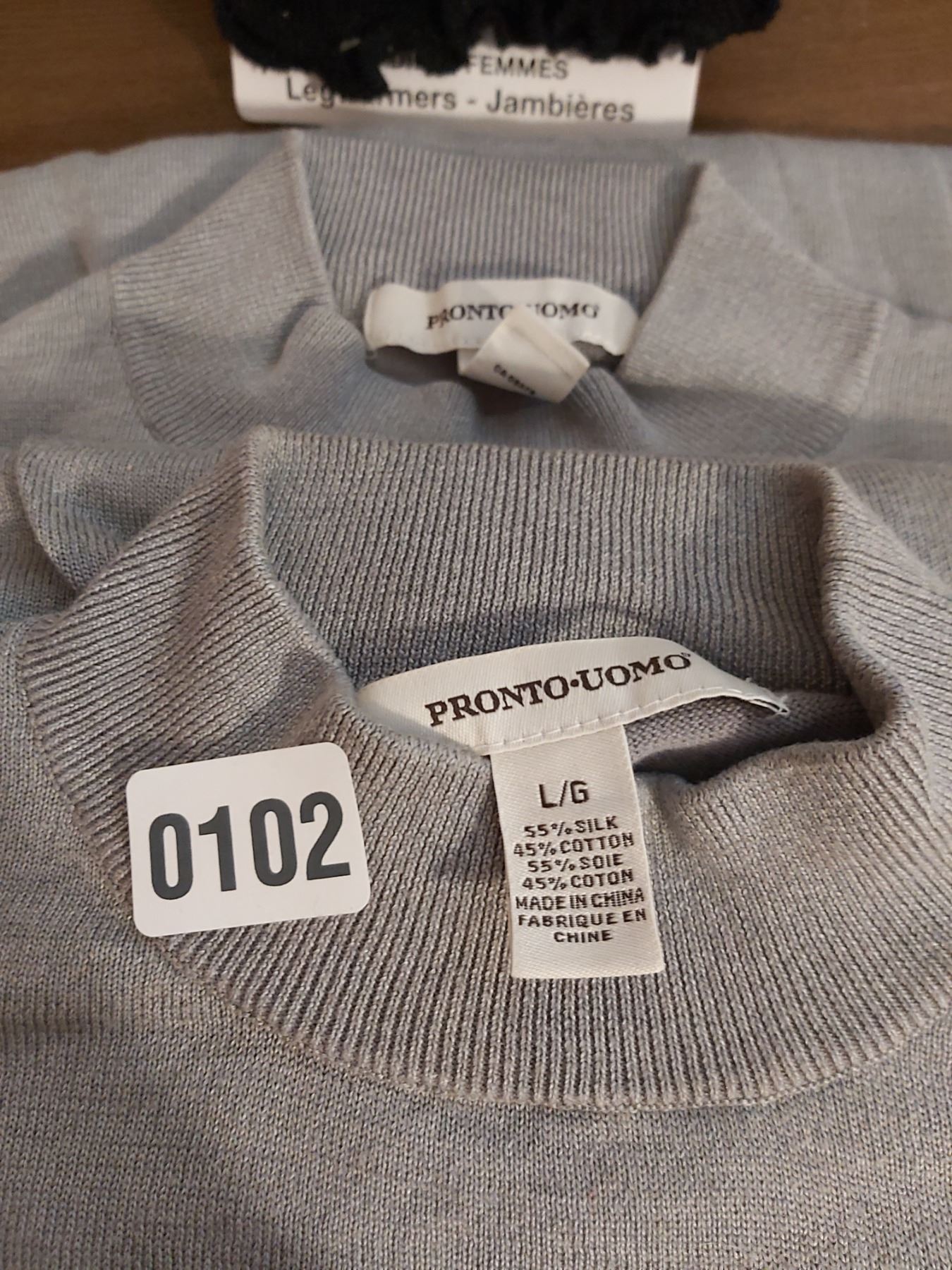 3 pairs black legwarmers, 34" x 36" sheet protector, 1 pair diabetic socks (size 7-12), 2 Pronto-Vomo silk and cotton mens sweaters (size L)