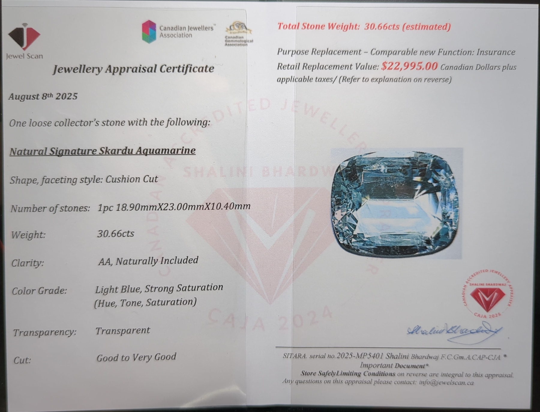 30.66 ct Certified Blue Aquamarine gemstone ($22,995 Appraisal)