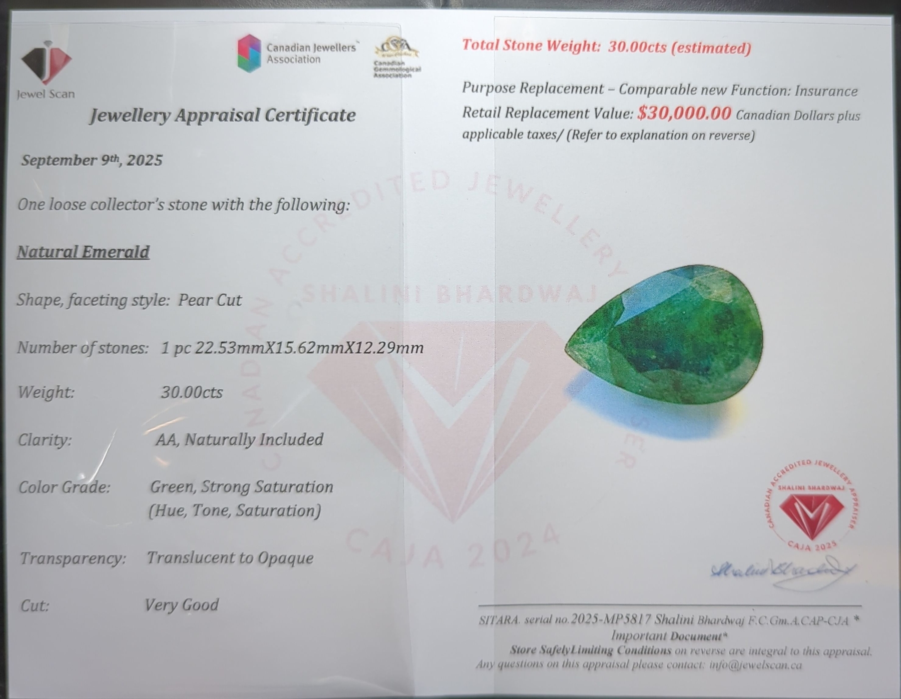 30 ct Certified Emerald Gemstone ($30,000 Appraisal)