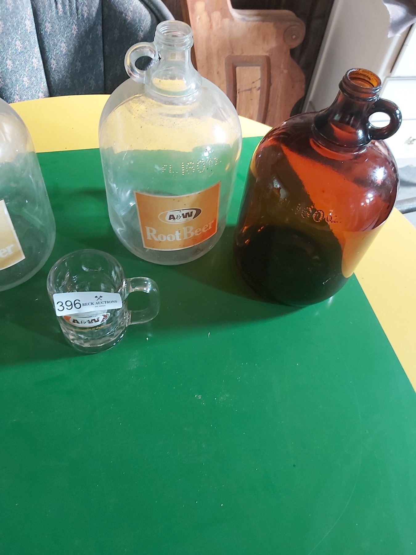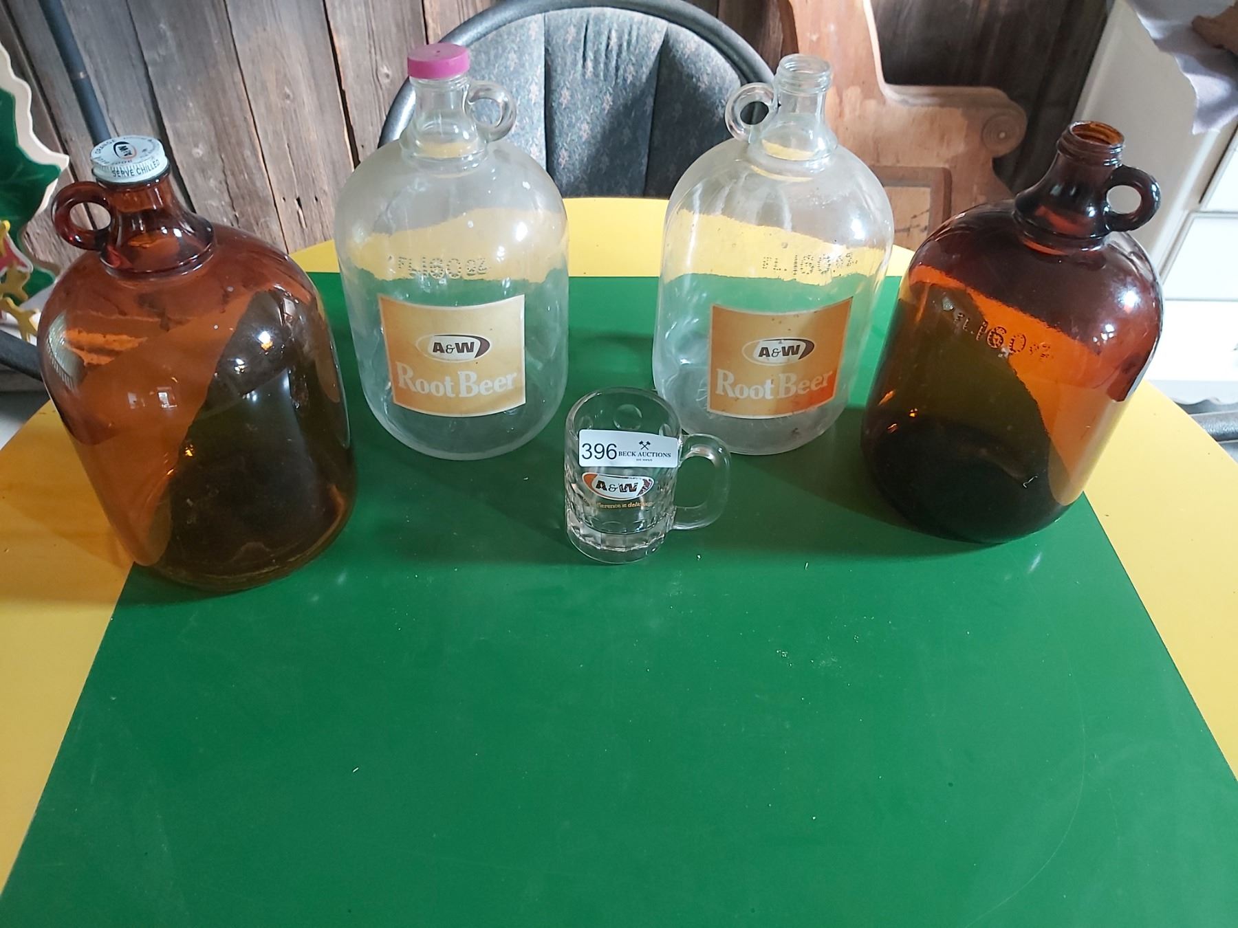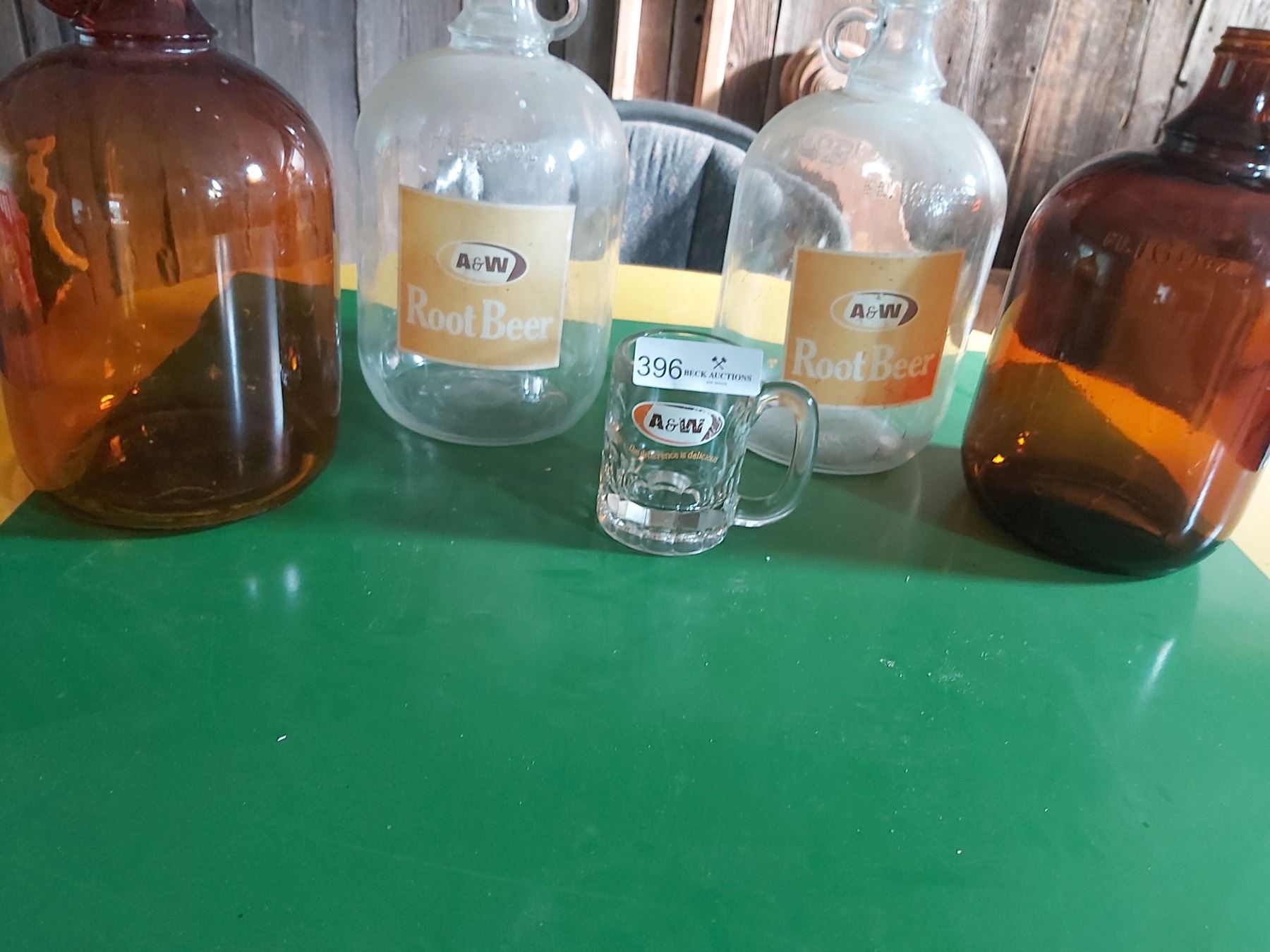 4- 160 Fluid Ounces Vintage A & W Root Beer Jugs and 1 Vintage A & W Mug