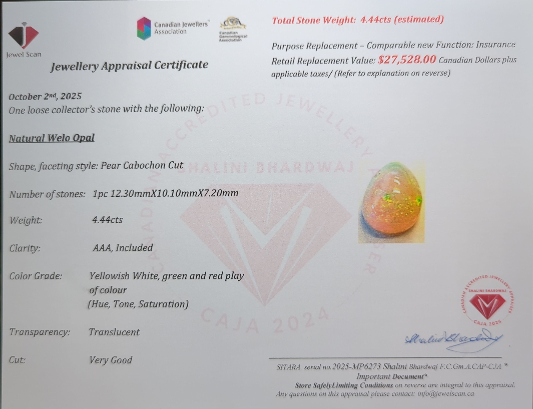 4.44 ct Certified Welo Opal Gemstone ($27,528 Appraisal)