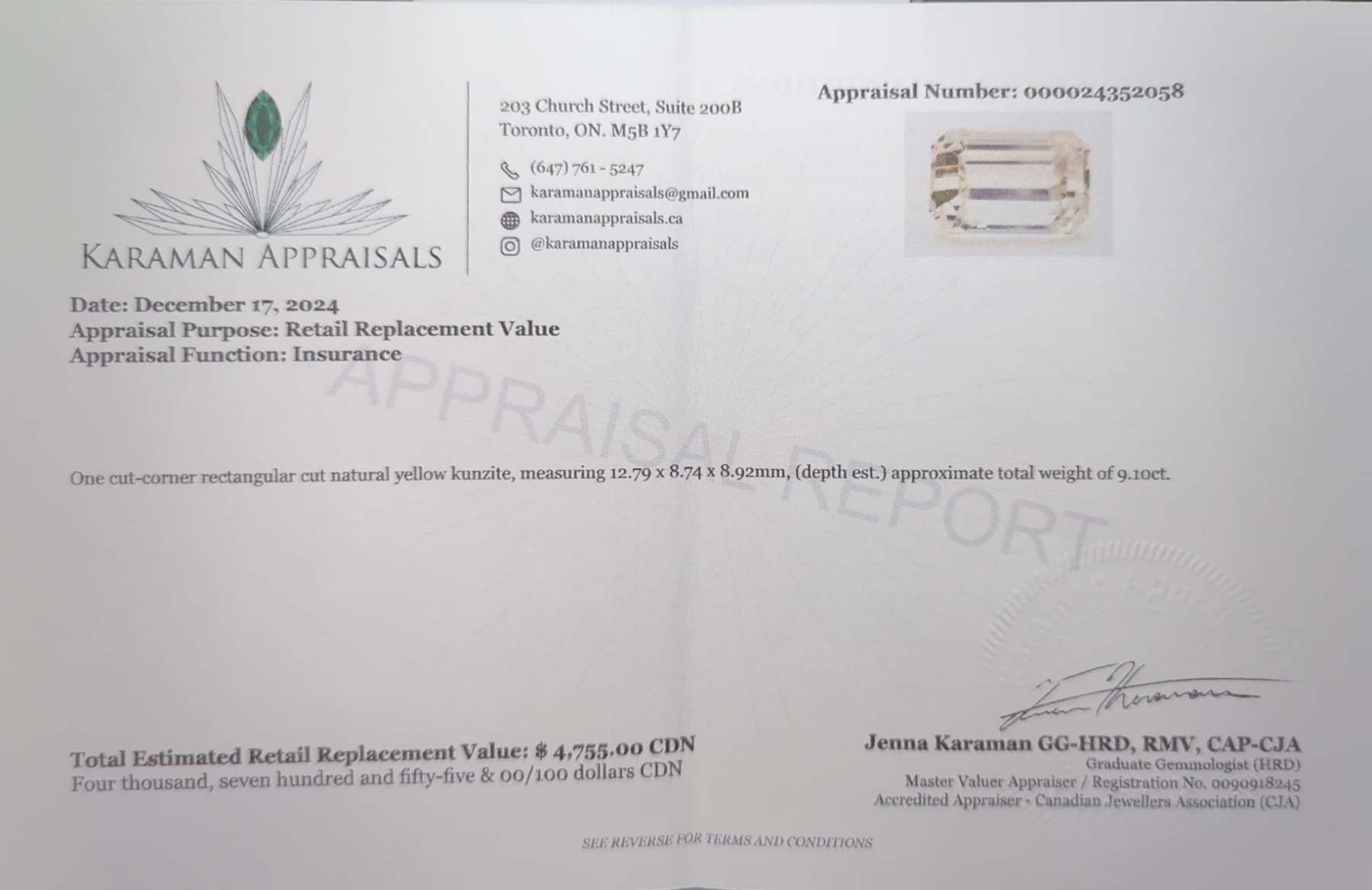 $4,755 Appraisal - 9.1 ct Cert. Yellow Kunzite Gemstone