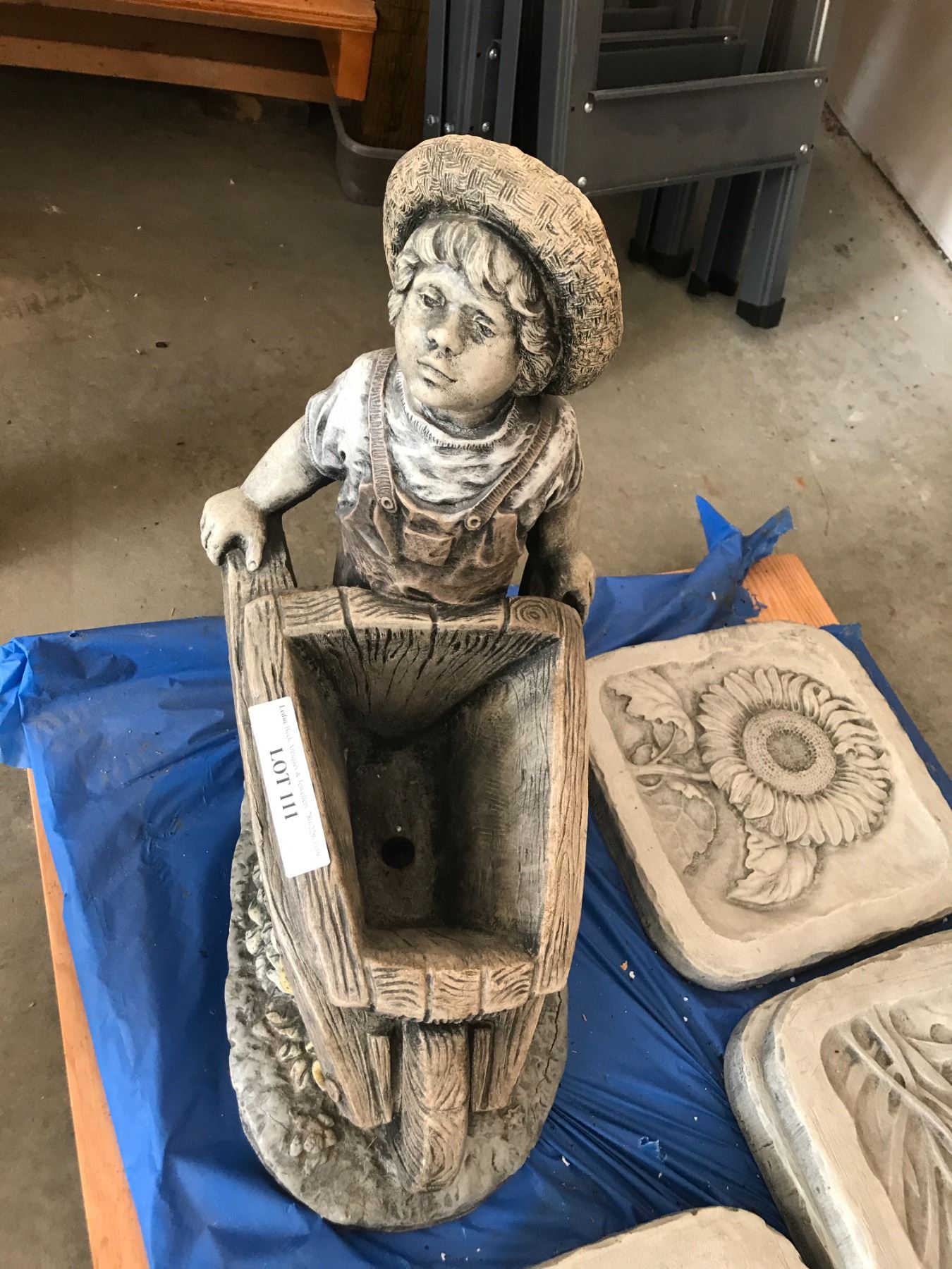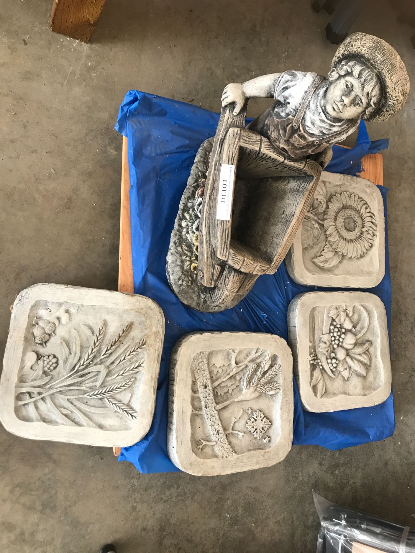 5 Cement Floral Stepping Stones, Cement Boy w Wheelbarrow Garden Ornament