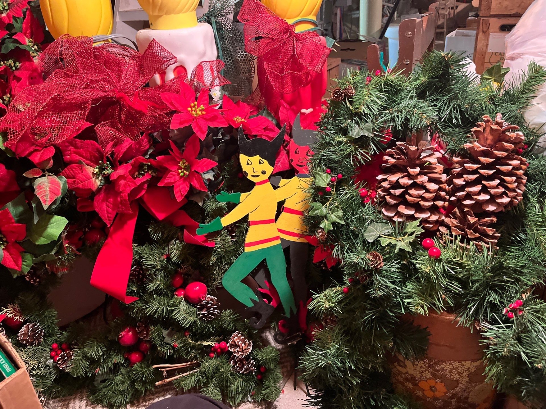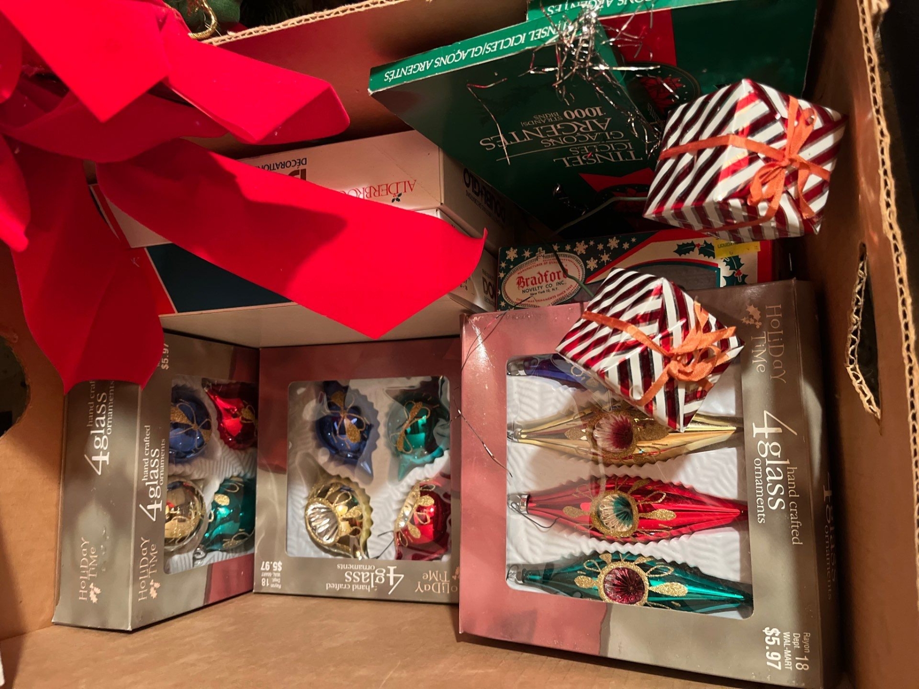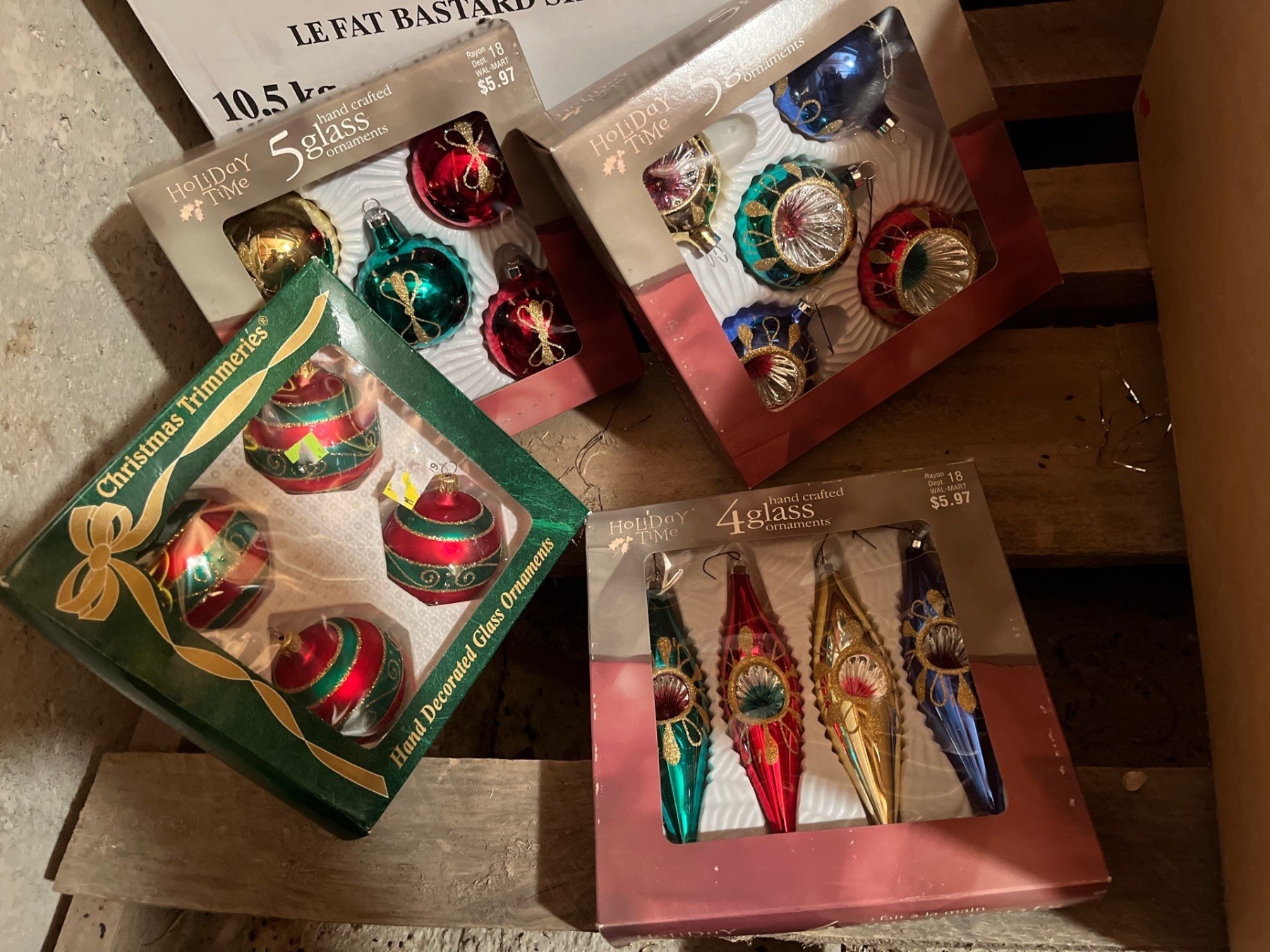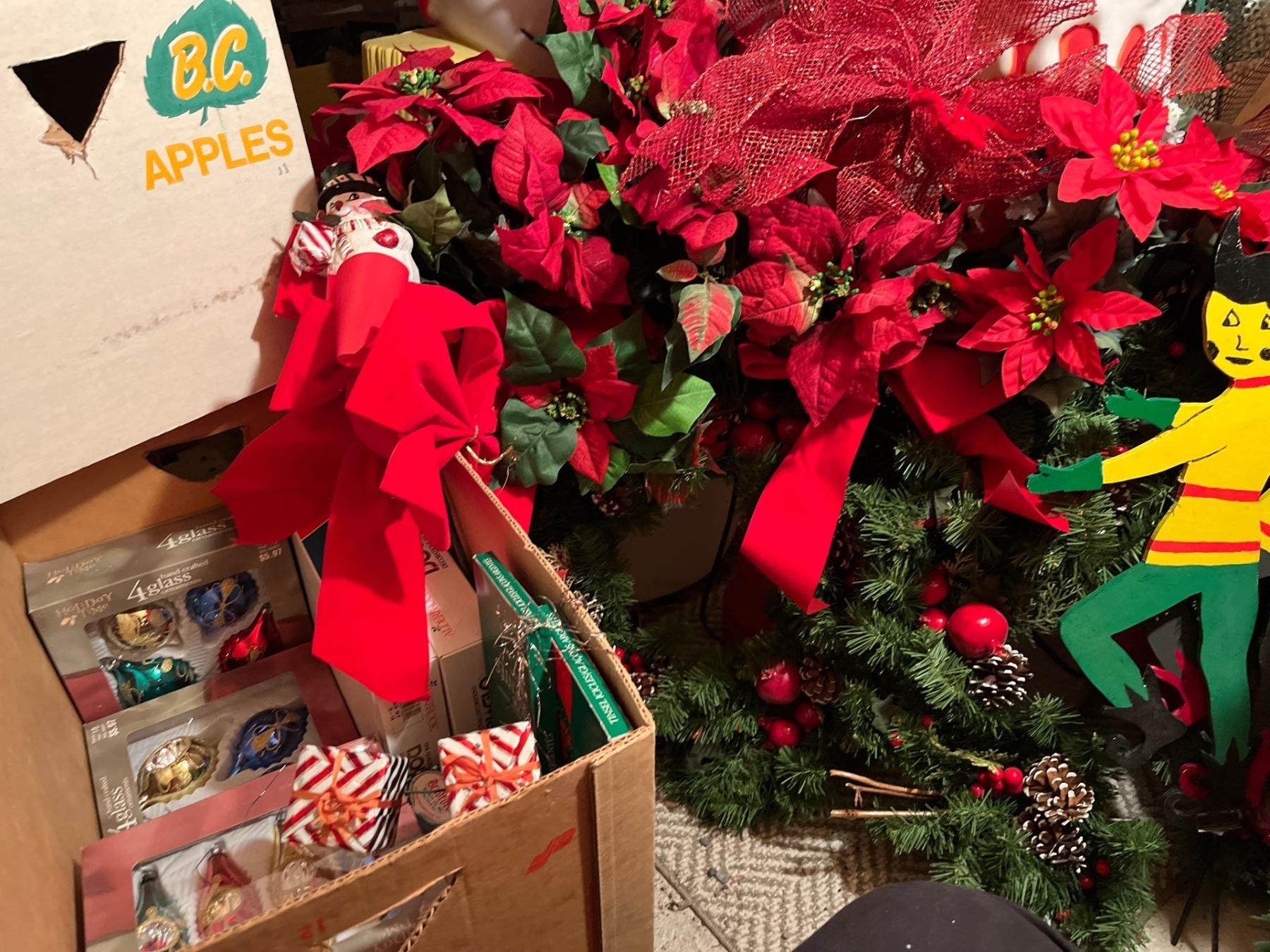 4 Christmas wreath huge assortment of poinsettia decor beautiful pine cones, some yard elf stakes and a beautiful assortment of glass Christmas tree ornaments handcrafted