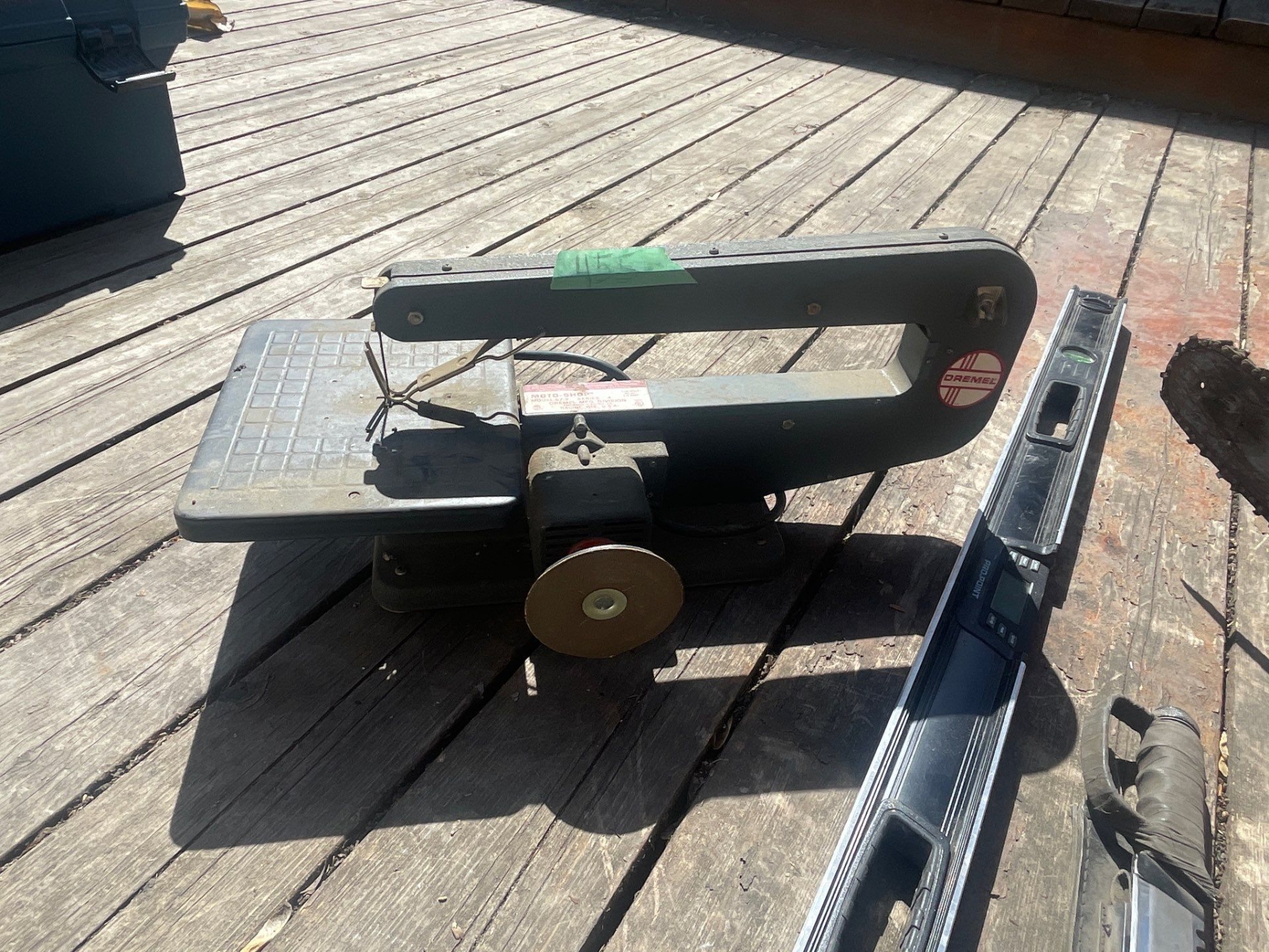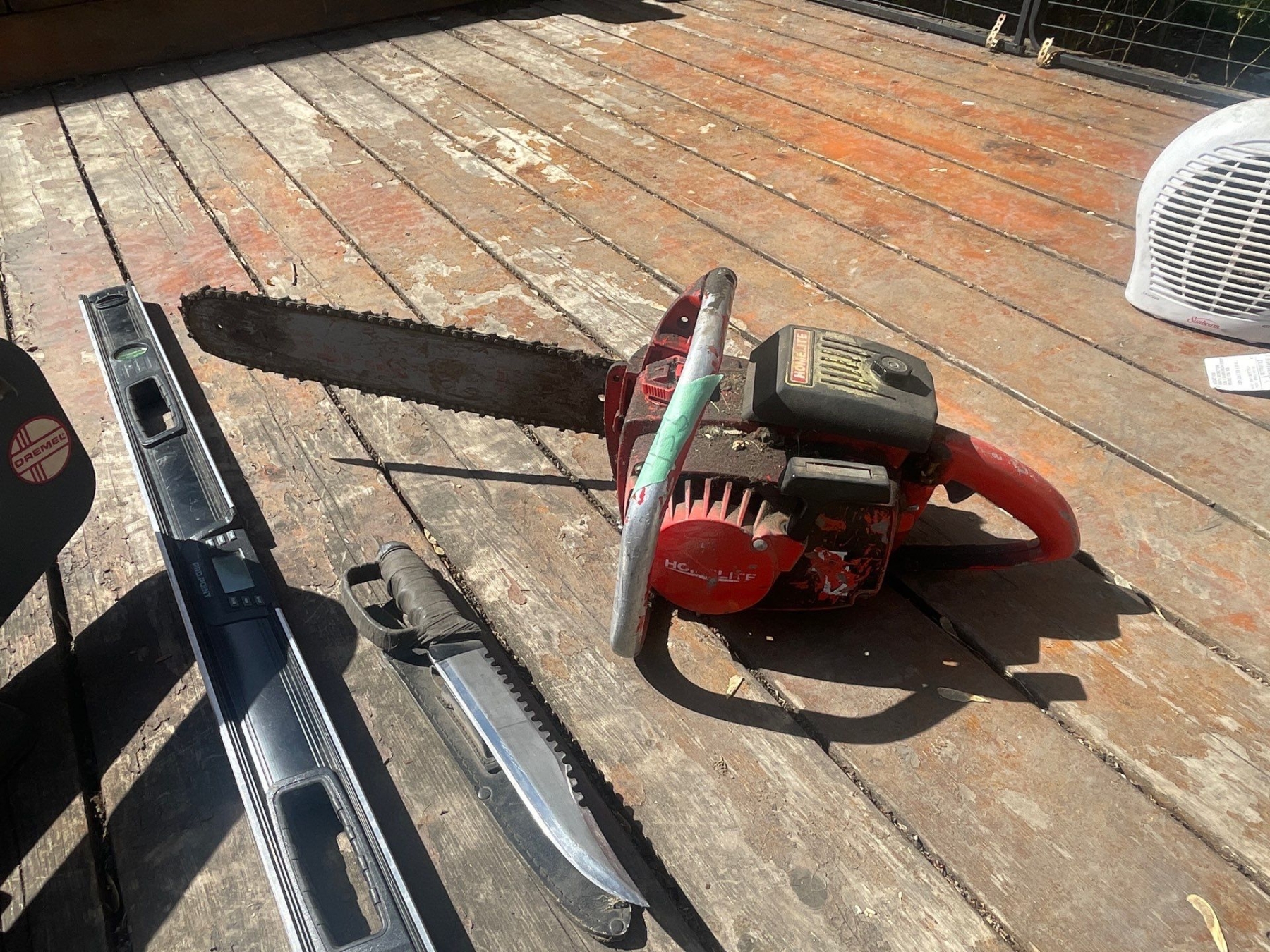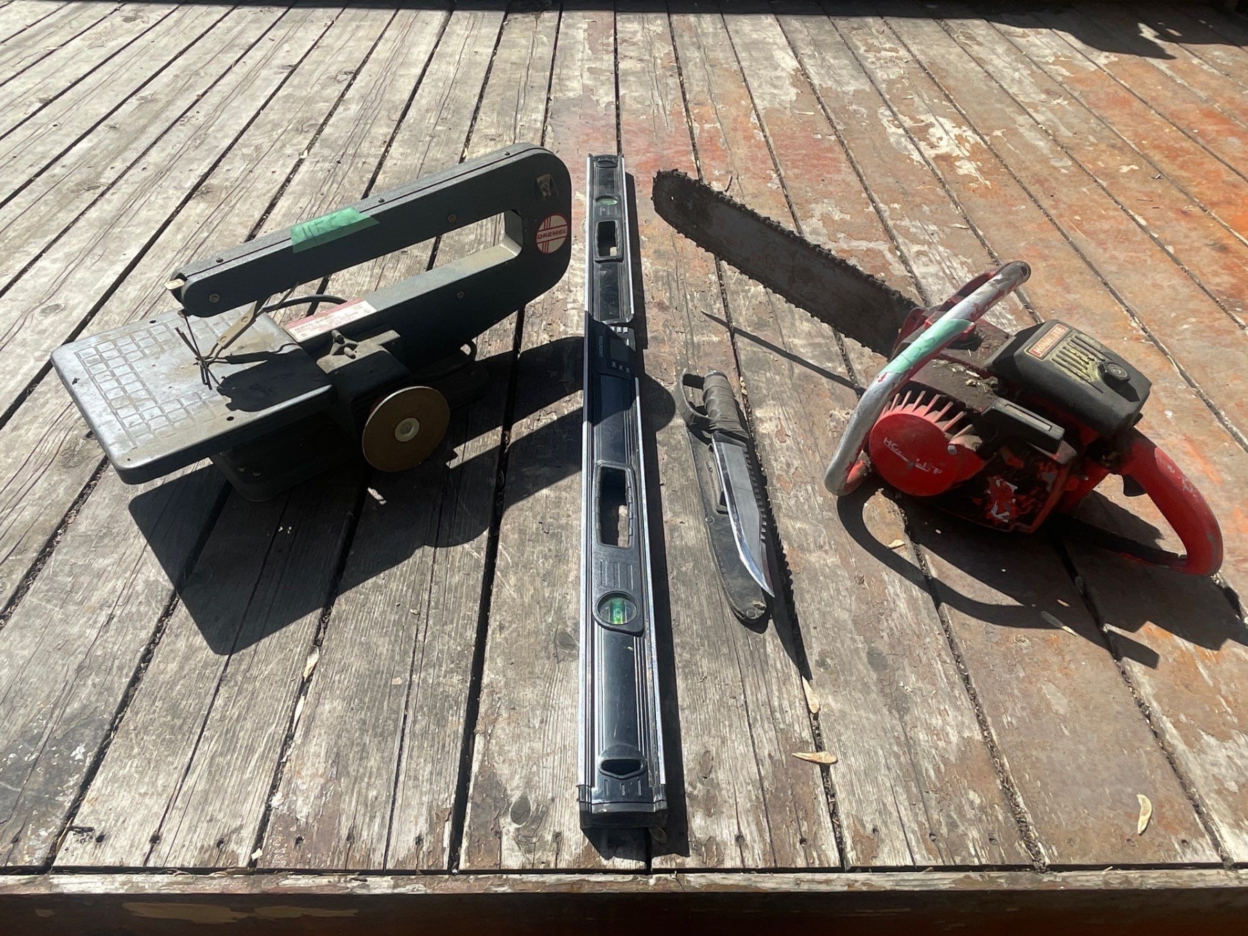 4 Foot Level, Dremel Table Saw, Craftsman Chainsaw, Hunting Knife.